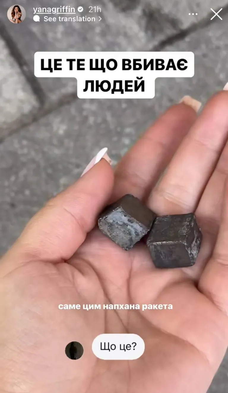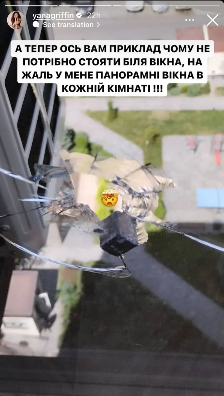 Блогерка та зіркова мама Яна Гріффін поділилася враженнями від інциденту у своїх соціальних мережах. На щастя, на момент атаки вона разом зі своєю родиною перебувала поза домом, тому ніхто з близьких не постраждав. Вона показала шматки уламків, що влучили у квартиру, зізнавшись, що її руки тремтіли від емоцій.