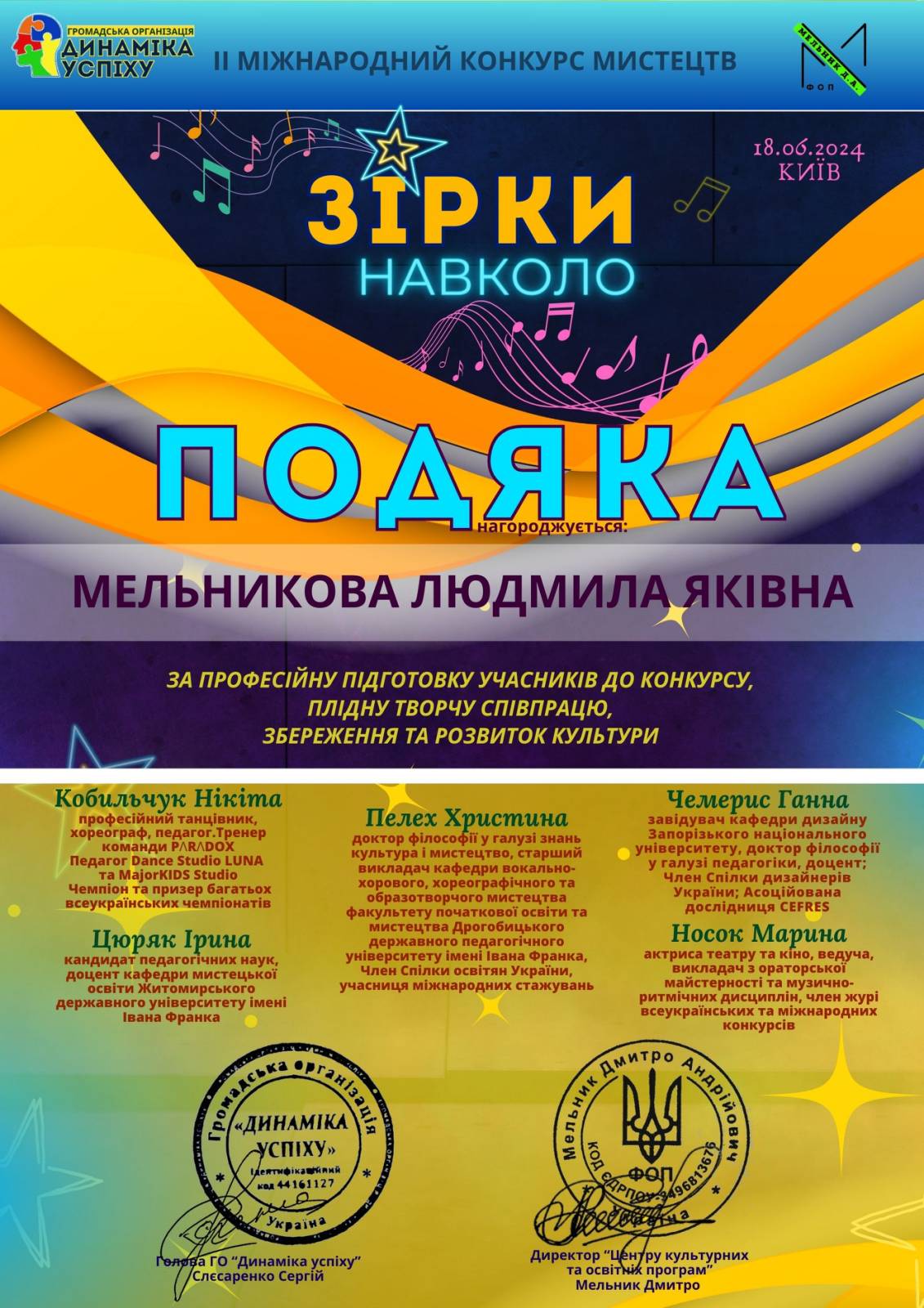 Викладач Людмила Мельникова отримала Подяку за професійну підготовку учасників до конкурсу, плідну творчу співпрацю, збереження та розвиток культури. Її внесок у розвиток талановитих музикантів був високо оцінений організаторами конкурсу.