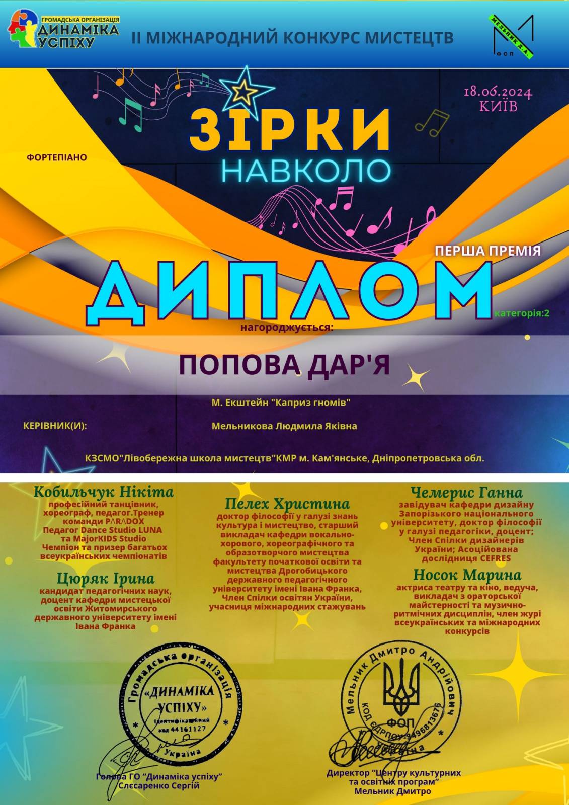 Нещодавно були підведені підсумки ІІ Міжнародного конкурсу мистецтв “ЗІРКИ НАВКОЛО”, який проходив дистанційно у Києві. Учні фортепіанного відділу Лівобережної школи мистецтв – Олефір Мирослава та Попова Дар’я – стали переможцями конкурсу та отримали Дипломи І Премії. Викладачем талановитих учениць є Людмила Мельникова.