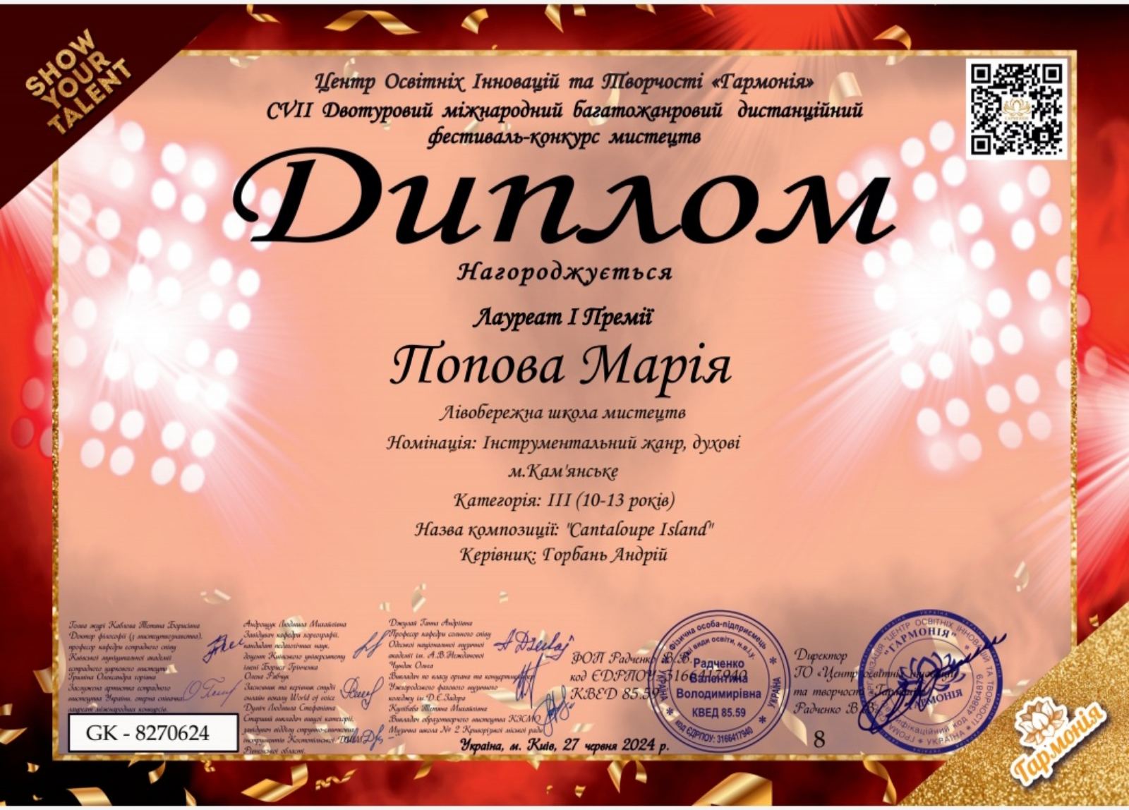 Учениця відділу оркестрових інструментів (саксофон) Лівобережної школи мистецтв Попову Марію стала Лауреатом І ступеня у VII Двотуровому Міжнародному багатожанровому дистанційному фестивалі-конкурсі мистецтв “SHOW YOUR TALENT”, який проходив в столиці України 27 червня 2024 року. Дівчинка з композицією Cantaloupe Island перемогла в номінації “Естрадний жанр, духові”.