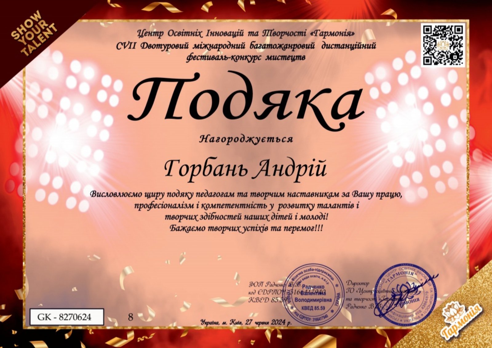 Також викладача Марії, Андрія Горбаня, було відзначено подякою за професіоналізм і компетентність у розвитку талантів і творчих здібностей наших дітей та молоді!
