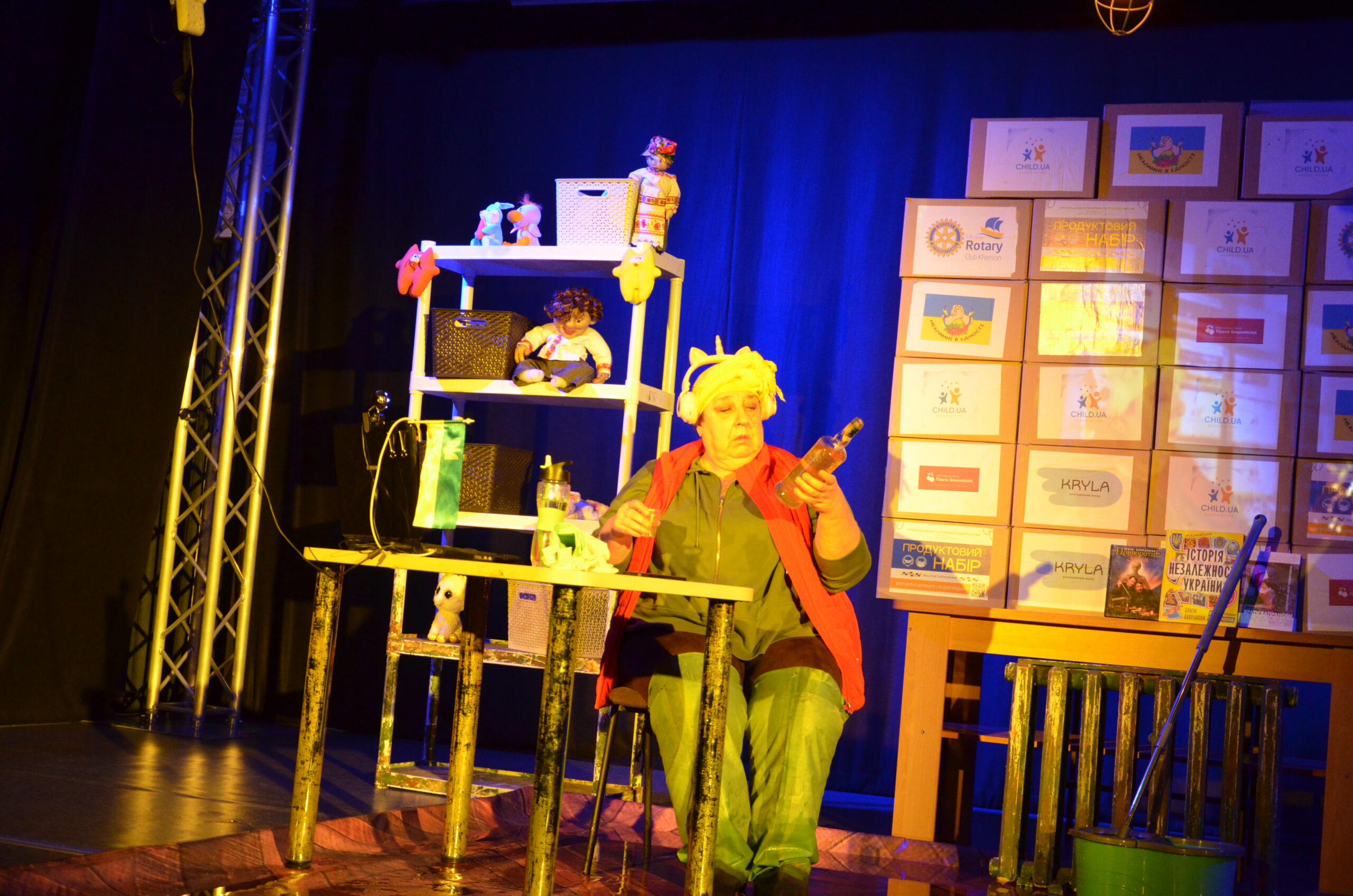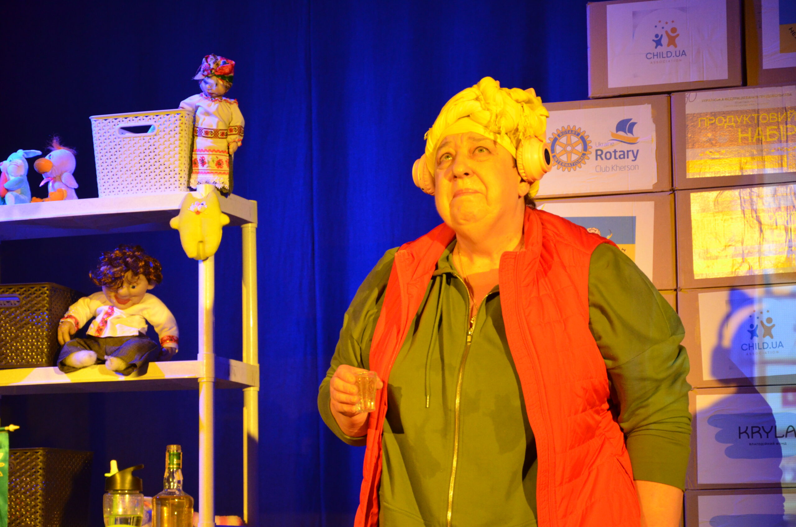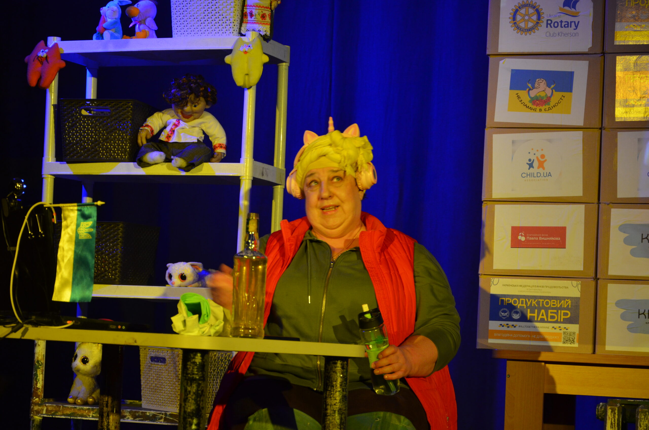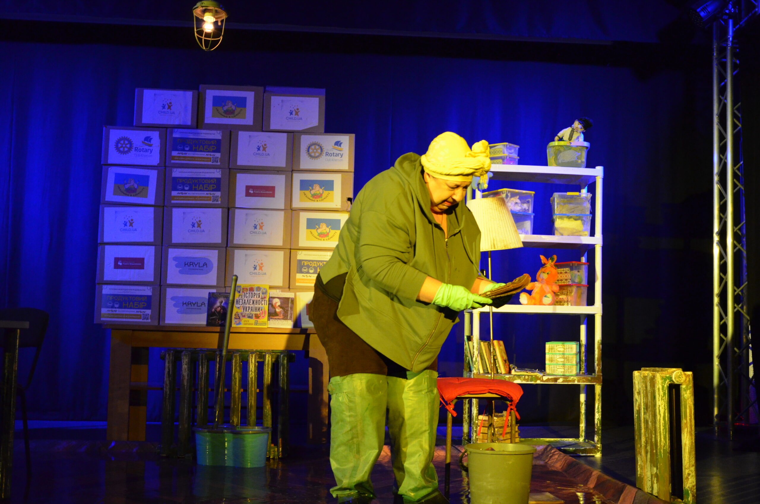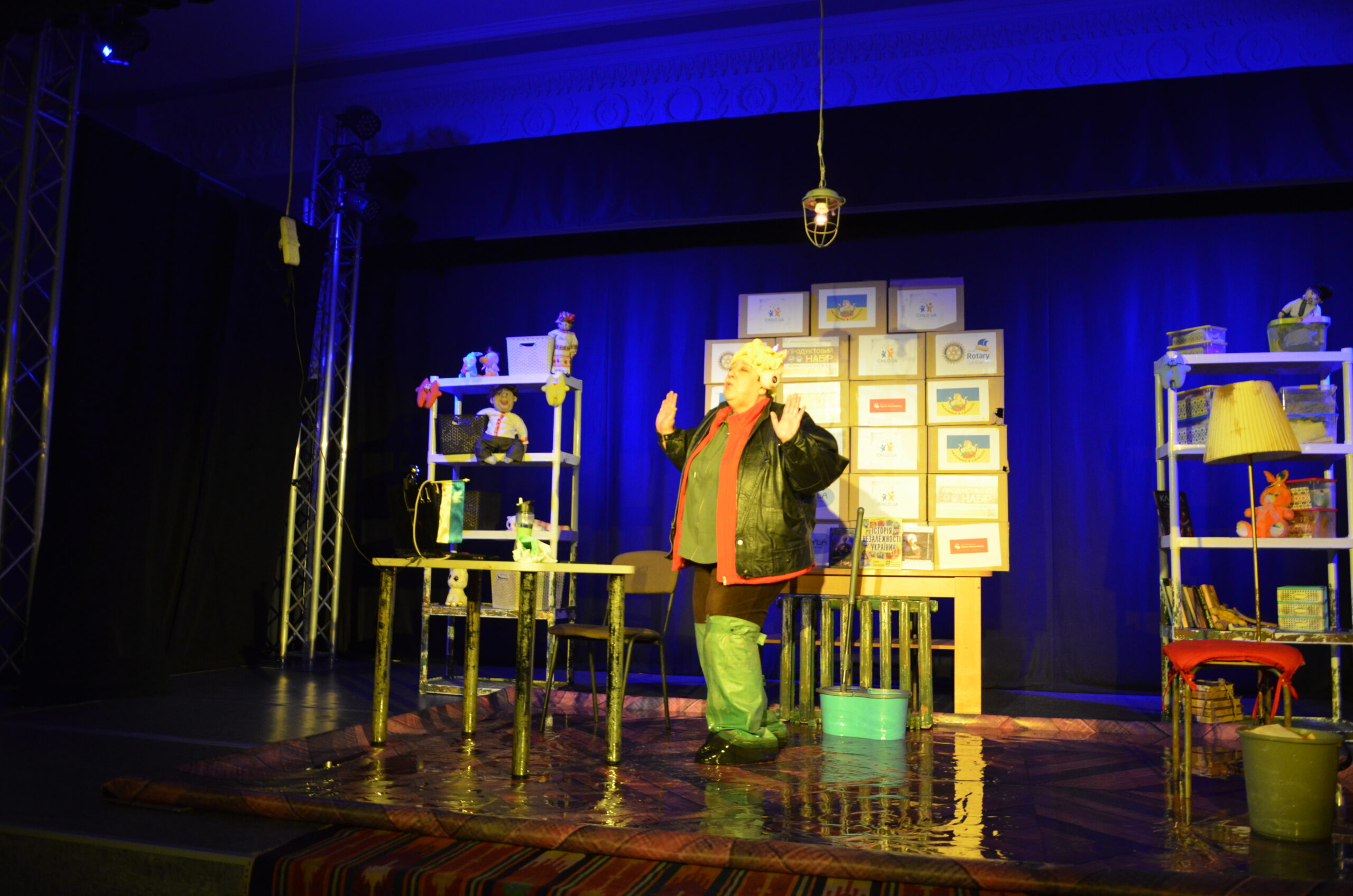 Російський прапор на вході та вода на сцені, в якій плавають іграшки та книжки. Саме це перше, що впало в око відвідувачам вистави “Буде тобі, враже, так, як відьма скаже”, в якій через історію однієї літньої жінки показано що довелося пережити мешканцям Херсона під час окупації міста російськими військами та в яких складних умовах доводиться їм жити після звільнення міста від окупантів.