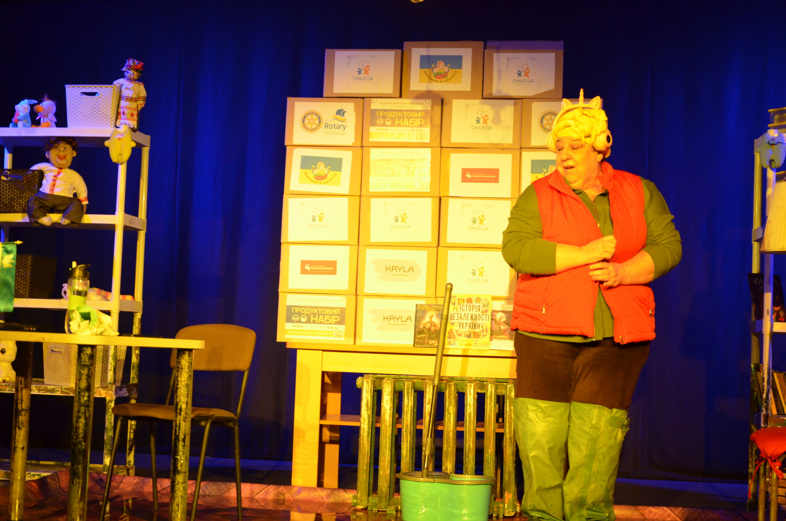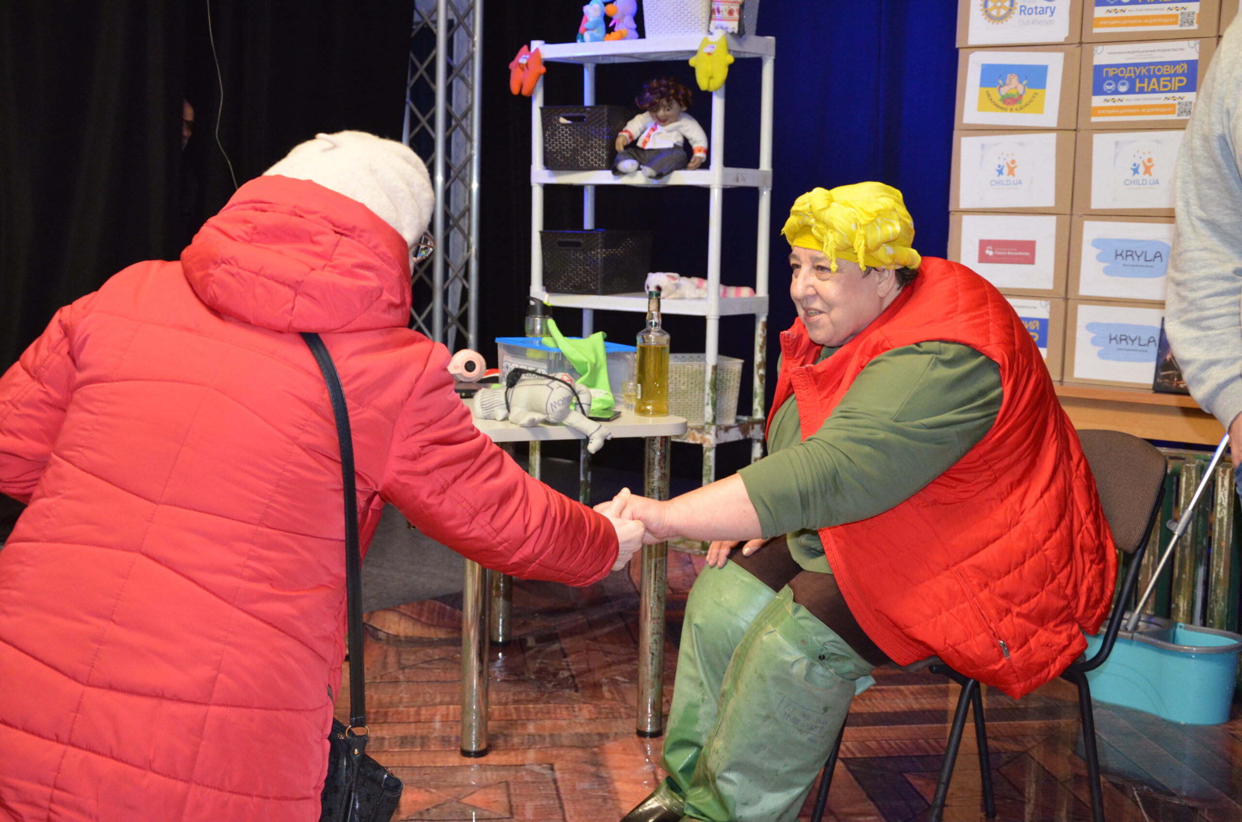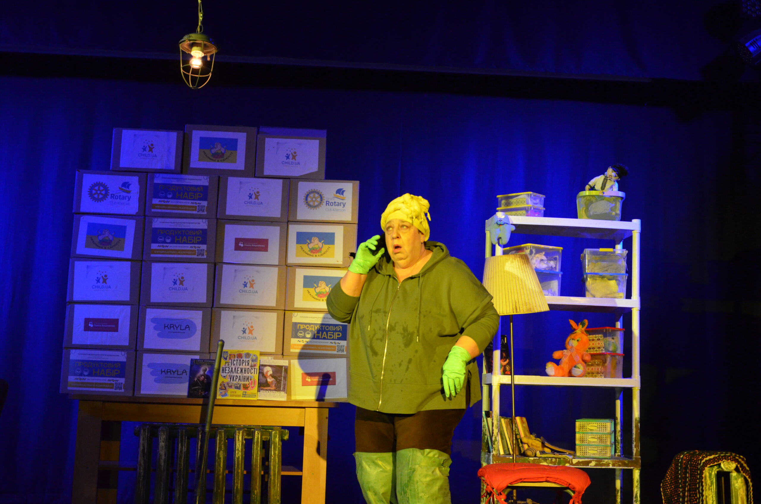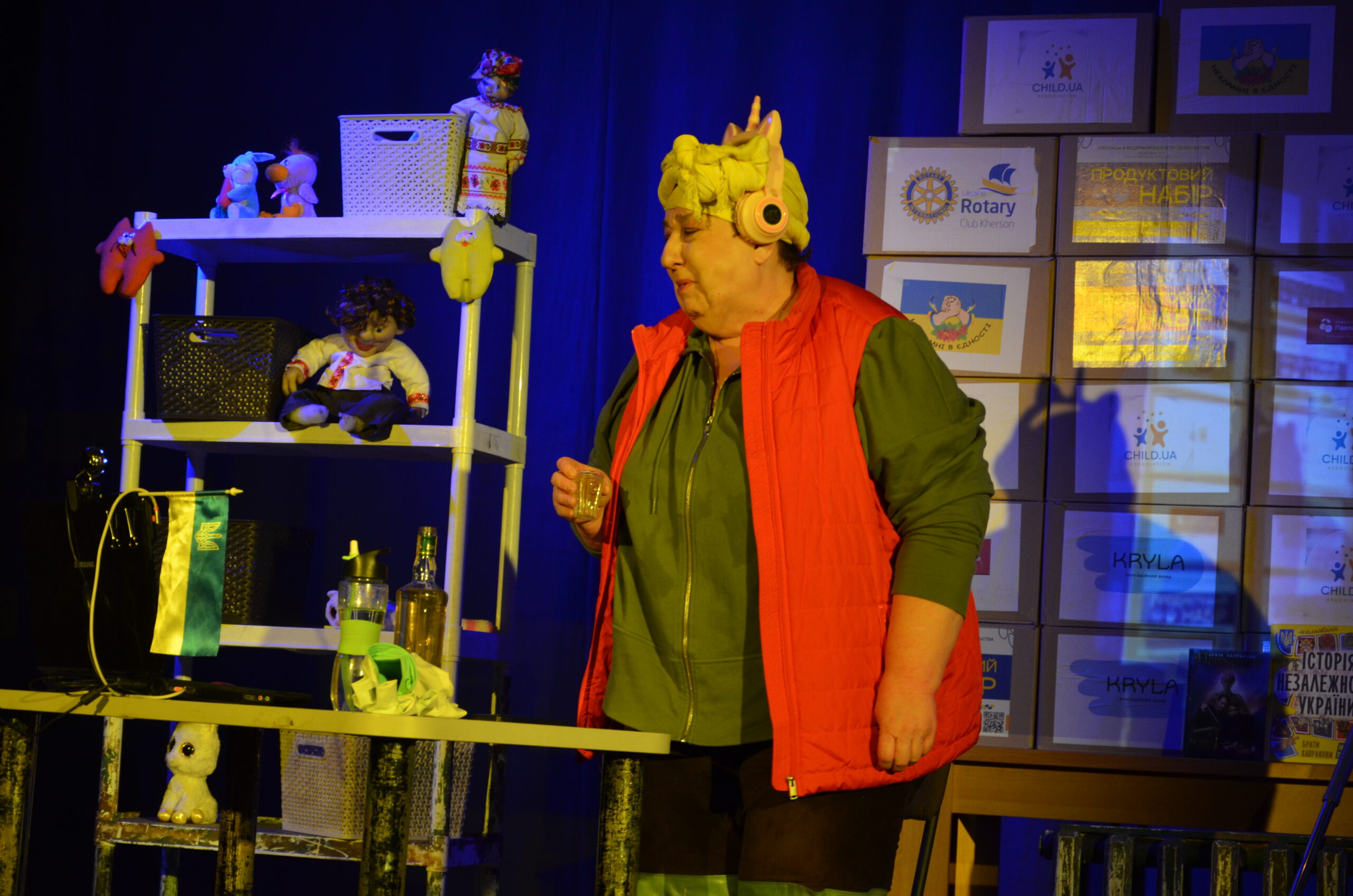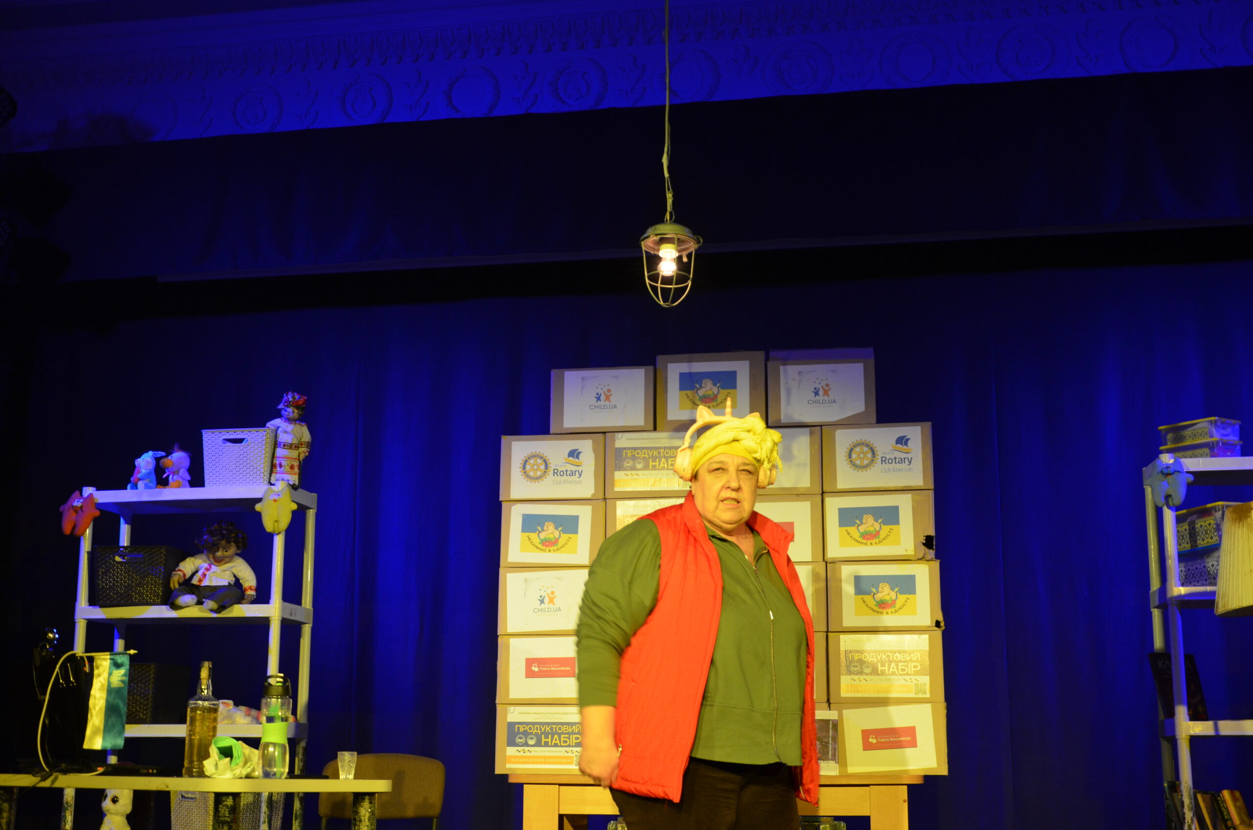 Російський прапор на вході та вода на сцені, в якій плавають іграшки та книжки. Саме це перше, що впало в око відвідувачам вистави “Буде тобі, враже, так, як відьма скаже”, в якій через історію однієї літньої жінки показано що довелося пережити мешканцям Херсона під час окупації міста російськими військами та в яких складних умовах доводиться їм жити після звільнення міста від окупантів.