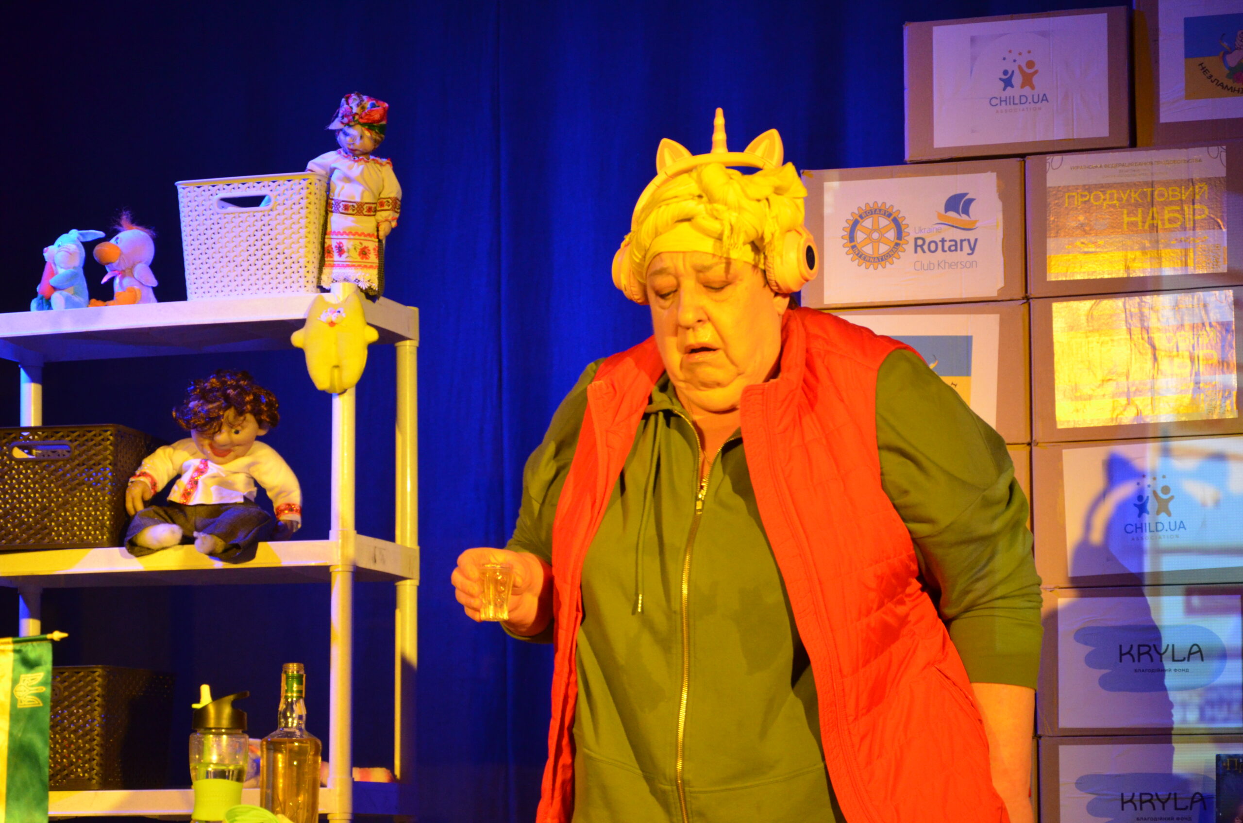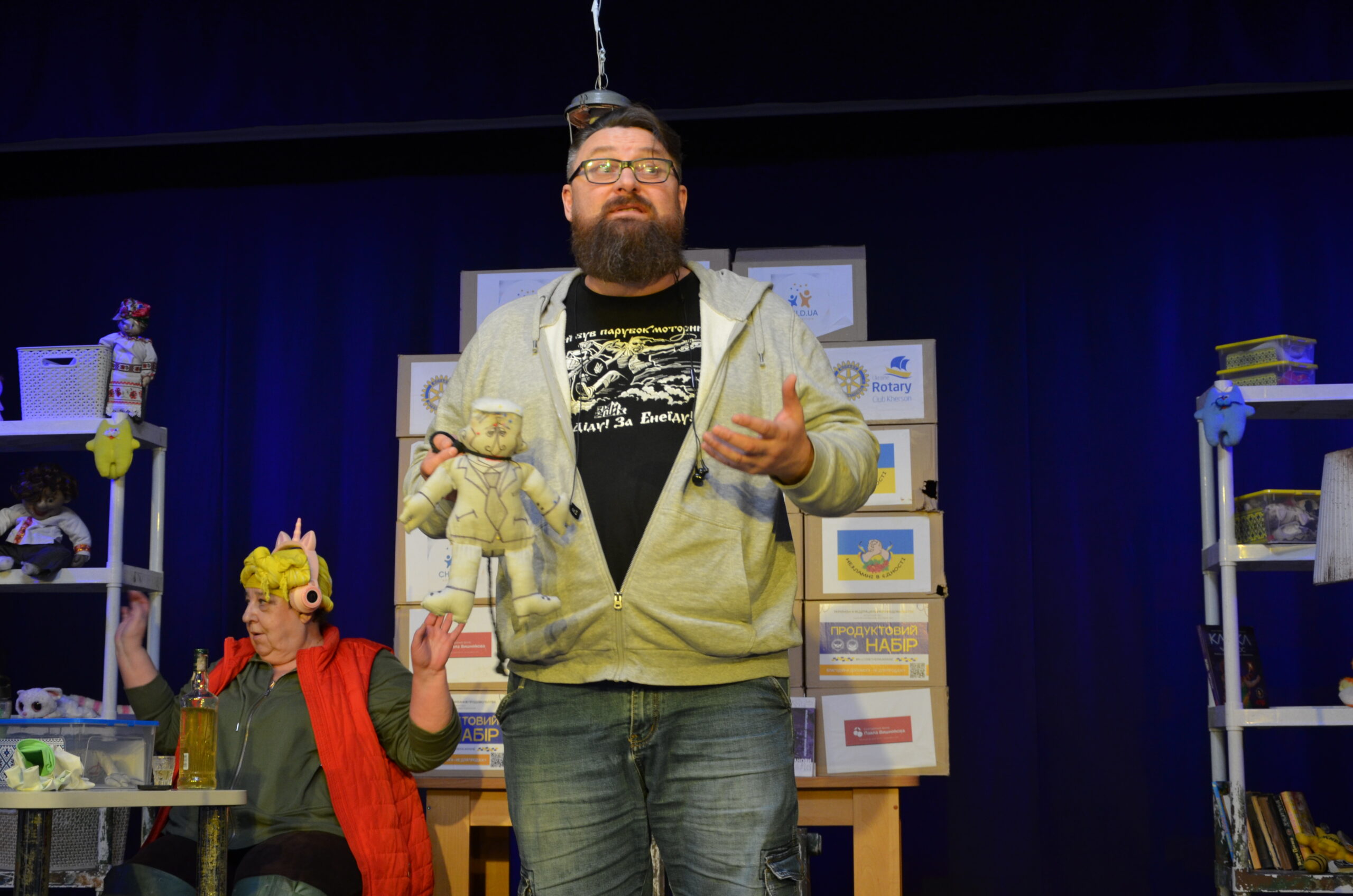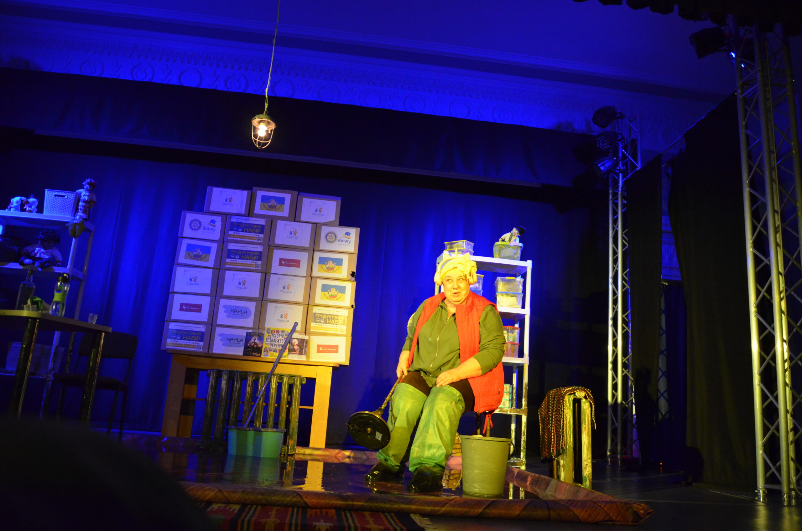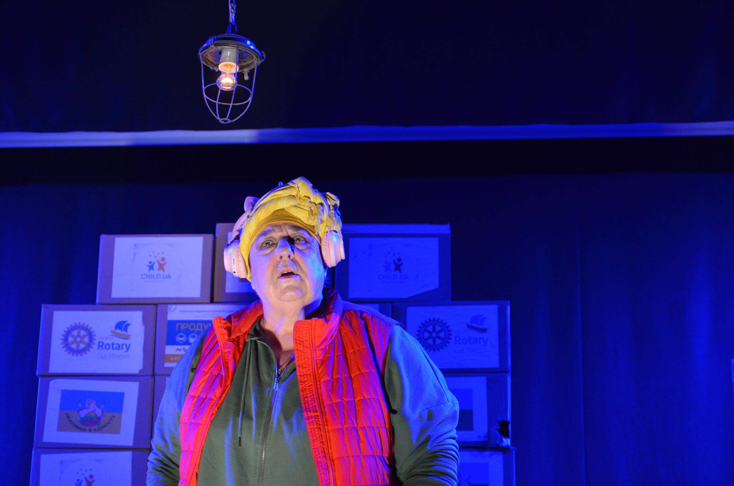 Російський прапор на вході та вода на сцені, в якій плавають іграшки та книжки. Саме це перше, що впало в око відвідувачам вистави “Буде тобі, враже, так, як відьма скаже”, в якій через історію однієї літньої жінки показано що довелося пережити мешканцям Херсона під час окупації міста російськими військами та в яких складних умовах доводиться їм жити після звільнення міста від окупантів.