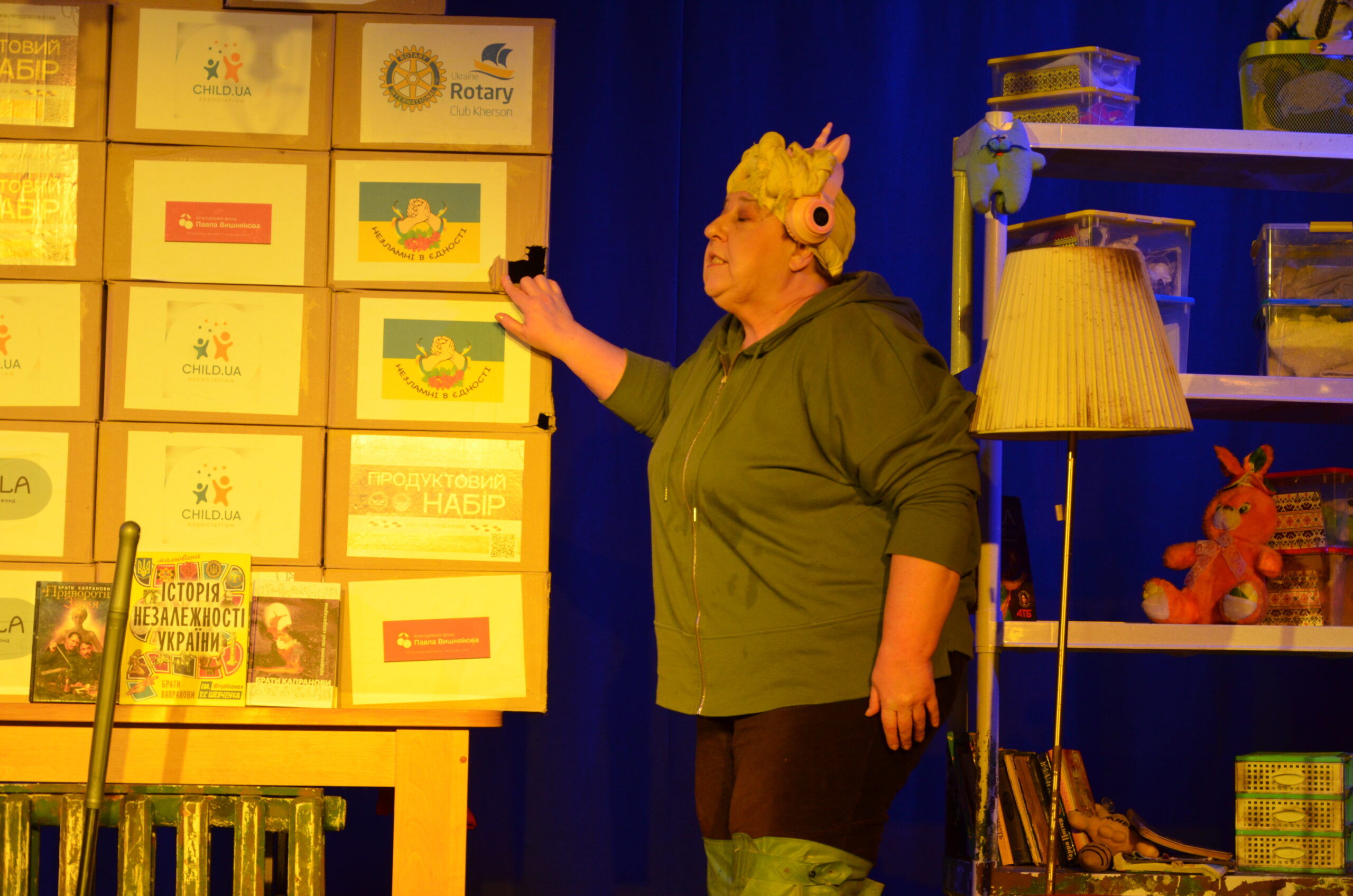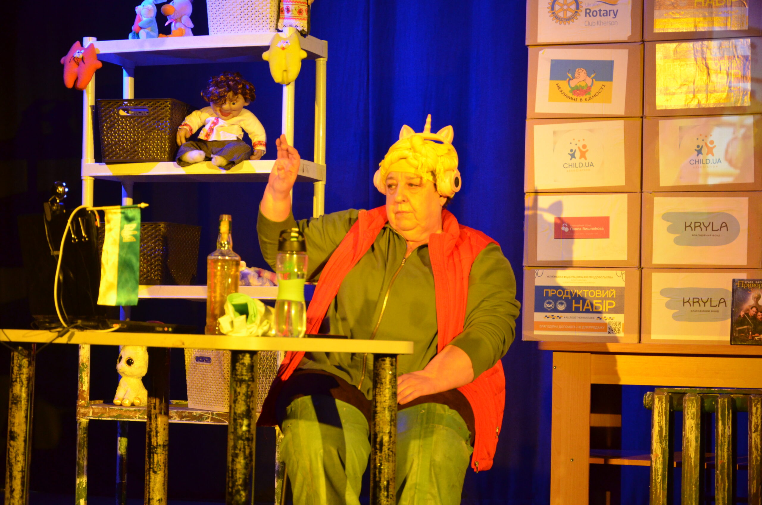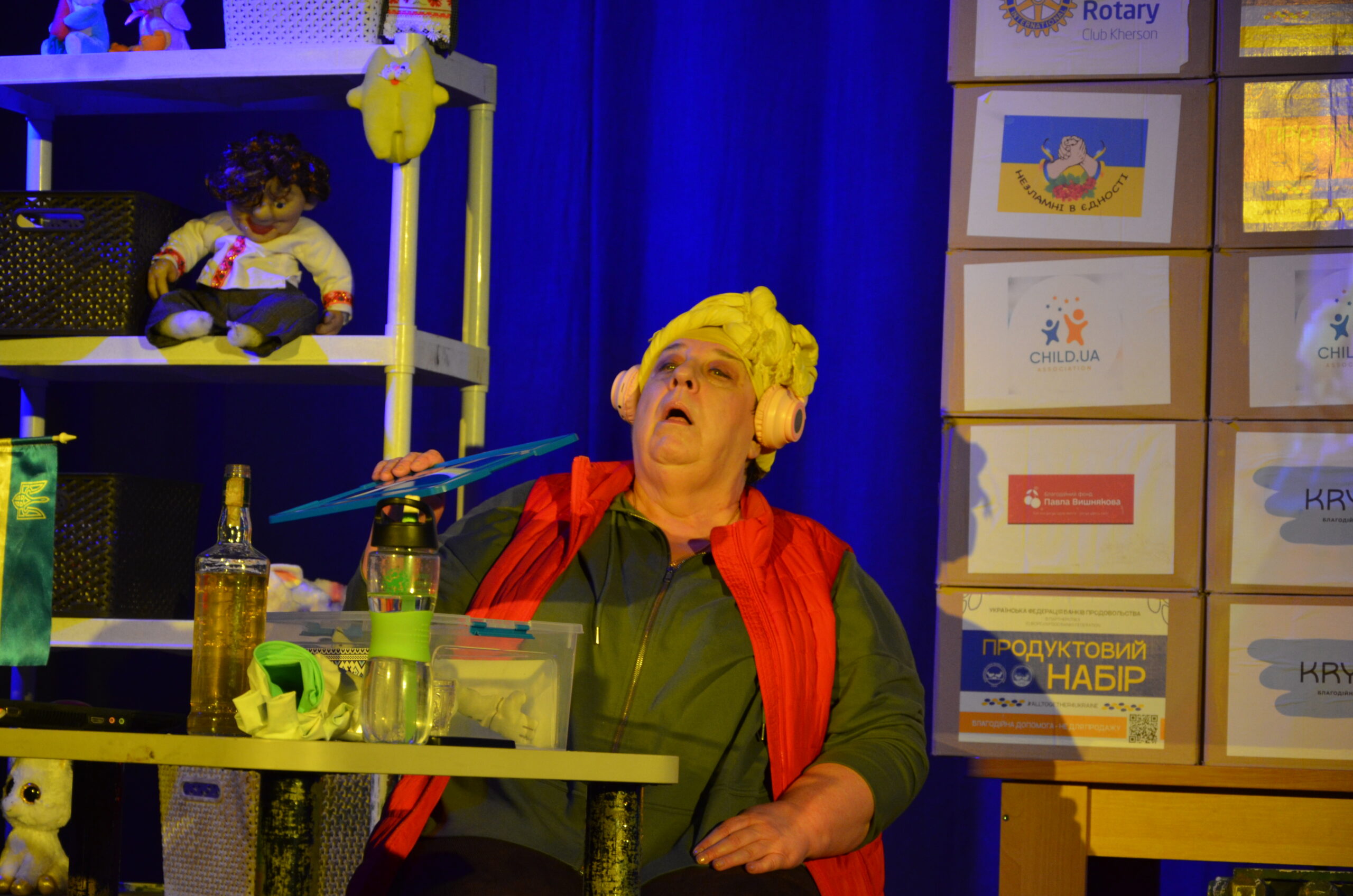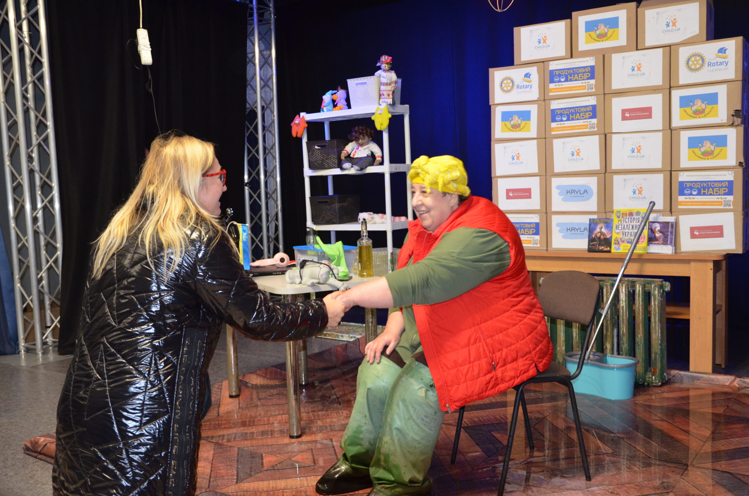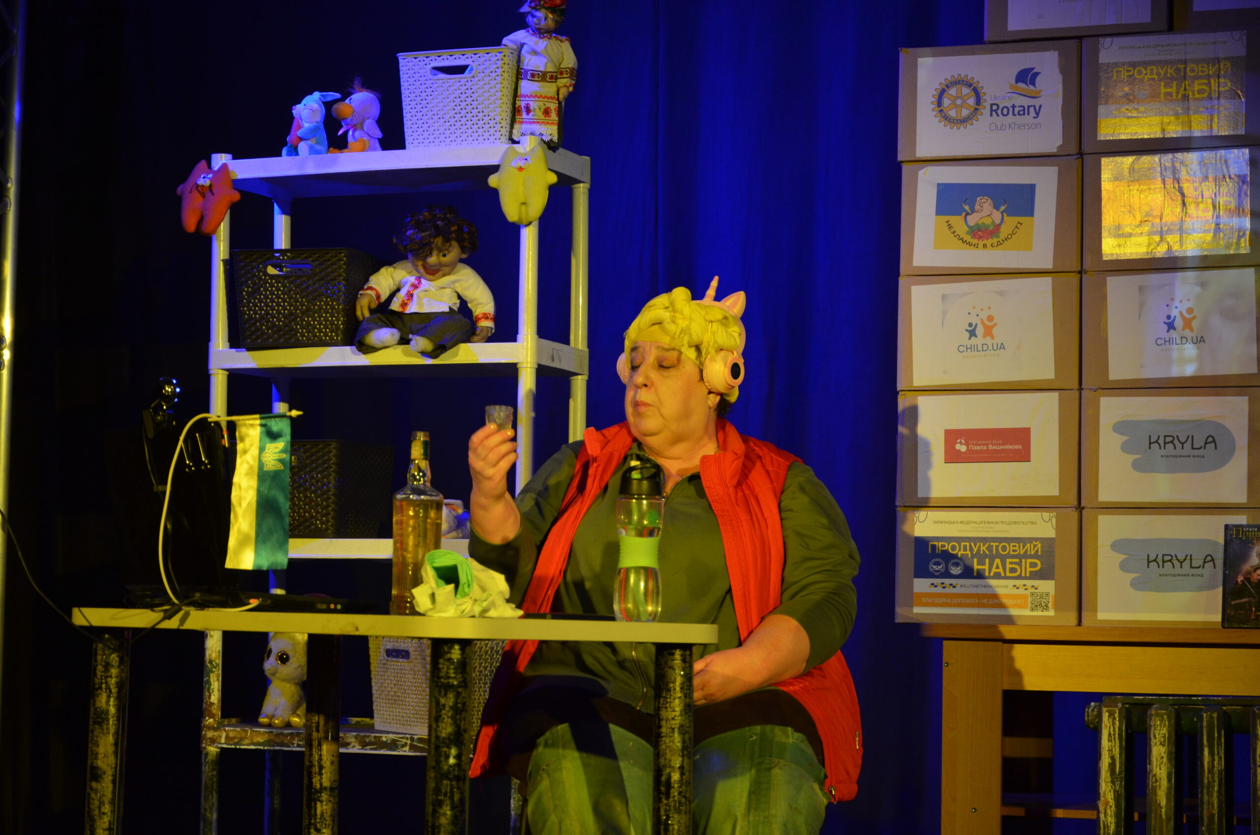 Російський прапор на вході та вода на сцені, в якій плавають іграшки та книжки. Саме це перше, що впало в око відвідувачам вистави “Буде тобі, враже, так, як відьма скаже”, в якій через історію однієї літньої жінки показано що довелося пережити мешканцям Херсона під час окупації міста російськими військами та в яких складних умовах доводиться їм жити після звільнення міста від окупантів.