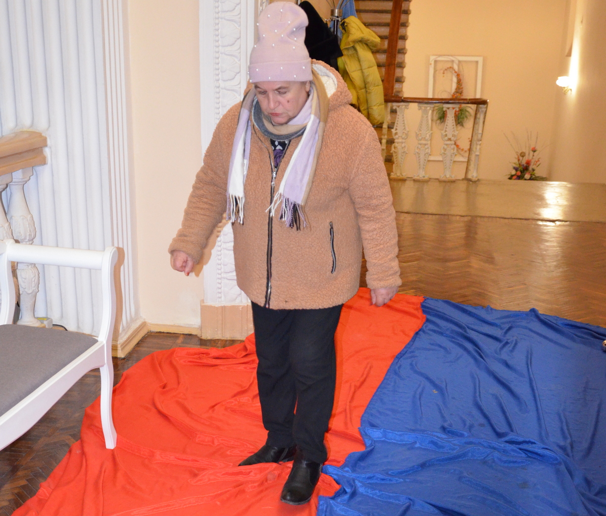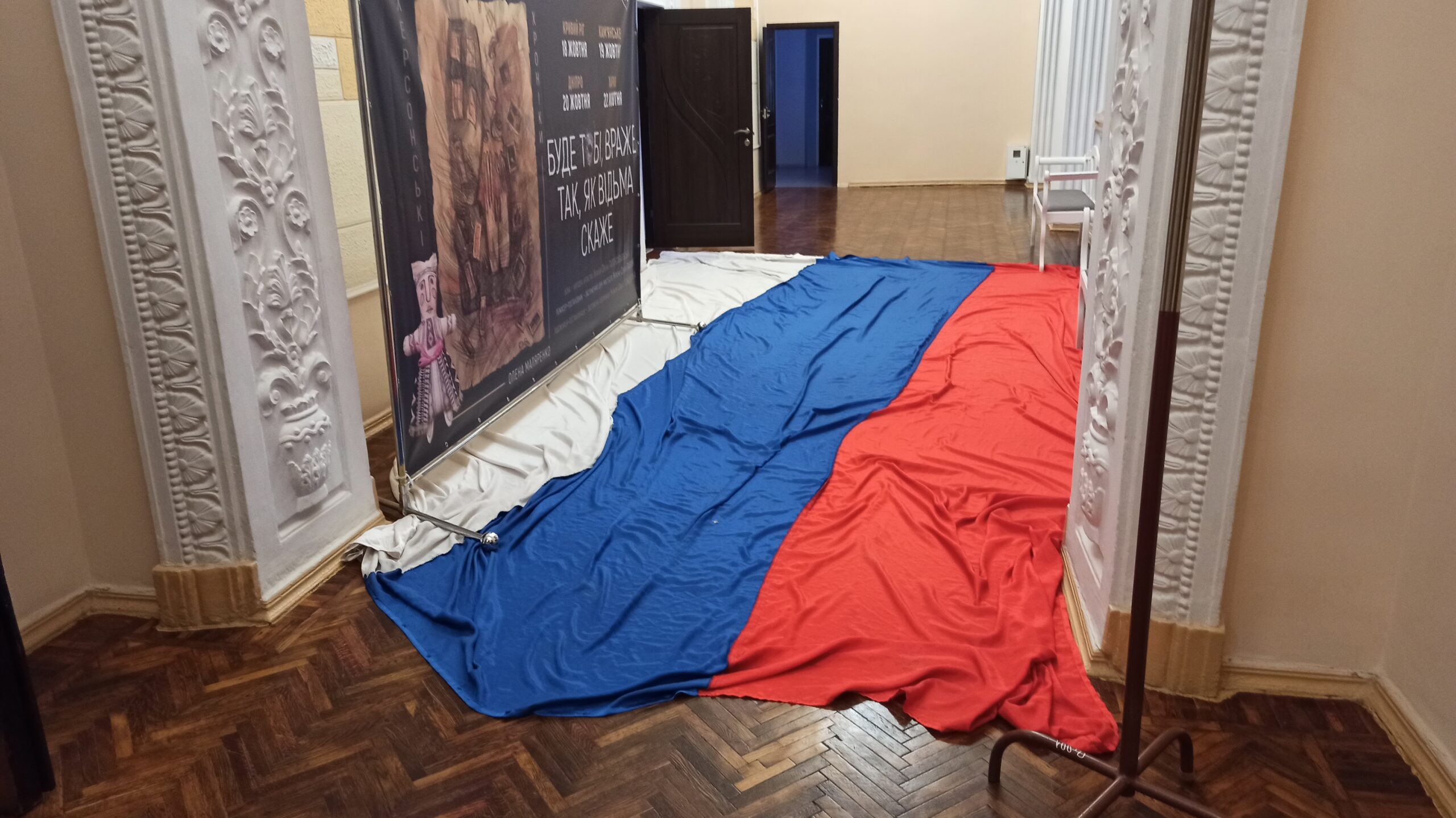 Звісно, що присутність ворожого прапора на підлозі трохи бентежила глядачів, проте можливість потоптатися по ньому ногами і навіть витерти об нього брудне взуття, багатьом припала до душі. Тим більше, що цей прапор, як пояснив режисер-постановник вистави заслужений діяч мистецтв України Сергій Павлюк, окупанти кинули у підвалі Херсонського театру, коли тікали з міста. Прапор вони залишили, проте перед втечею вони вивезли з театру все більш-менш цінне обладнання.