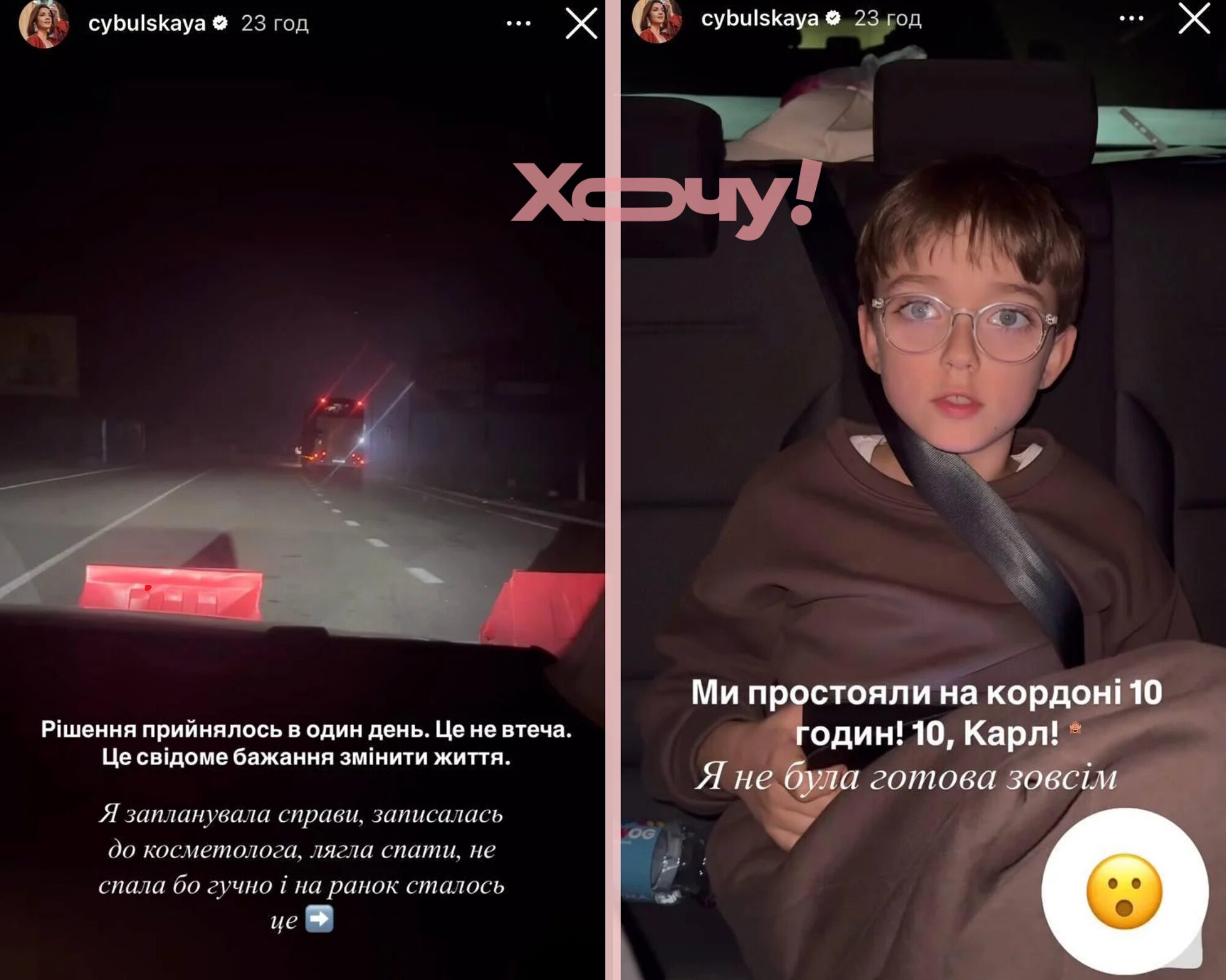 Я поїхала з України. Рішення прийнялось в один день. Це не втеча. Це свідоме бажання змінити життя. Я запланувала справи, записалась до косметолога, лягла спати, не спала, бо гучно, і на ранок сталося це. У мене внутрішні реформи. Я забрала Нестора зі школи і ми їдемо. Простояли на кордоні 10 годин. Я не була готова зовсім, — пояснила свій вчинок Оля Цибульська.