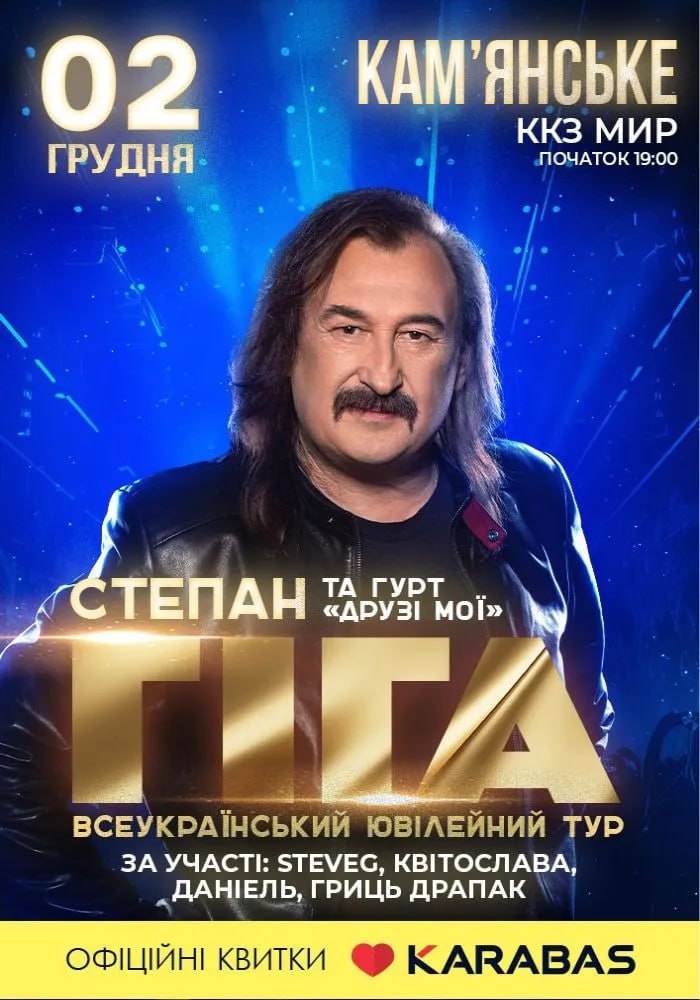 2 грудня у Кам’янському відбудеться ювілейний концерт народного артиста України Степана Гіги в рамках всеукраїнського туру. О 19:00 у ККЗ “Мир” легендарний виконавець разом із гуртом “Друзі мої” подарує глядачам вечір “платинових хітів”, об’єднуючи шанувальників різного віку своєю щирою та душевною музикою.