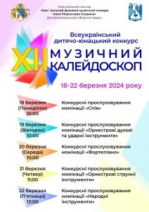 З 18 по 22 березня 2024 року на базі Кам’янського фахового музичного коледжу ім. Мирослава Скорика пройде другий тур XII Всеукраїнського дитячо-юнацького конкурсу “МУЗИЧНИЙ КАЛЕЙДОСКОП”, в якому свої таланти продемонструють учні закладів мистецької освіти, студенти мистецьких коледжів та талановита творча молодь.