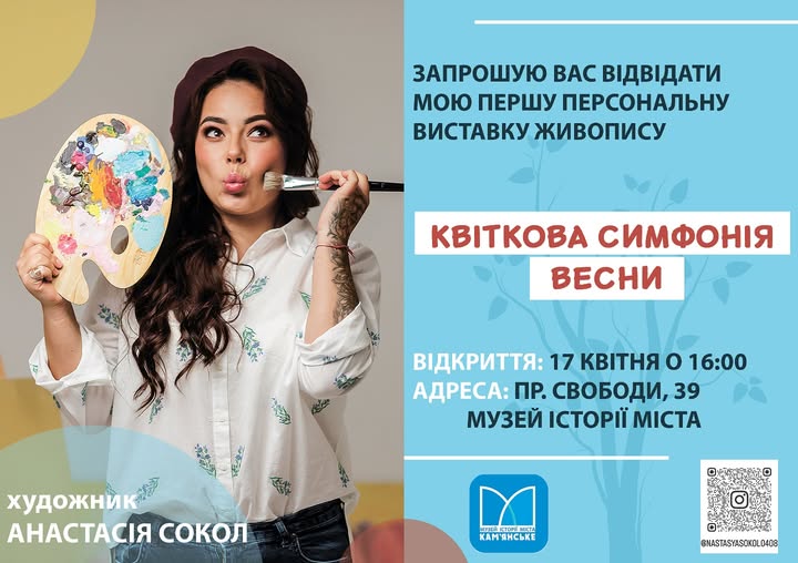 17 квітня в Музеї історії міста Кам’янського відбудеться відкриття першої персональної виставки талановитої художниці під назвою “Квіткова симфонія весни”. Початок заходу — о 16:00. Локація: музей історії міста, Кам’янське.