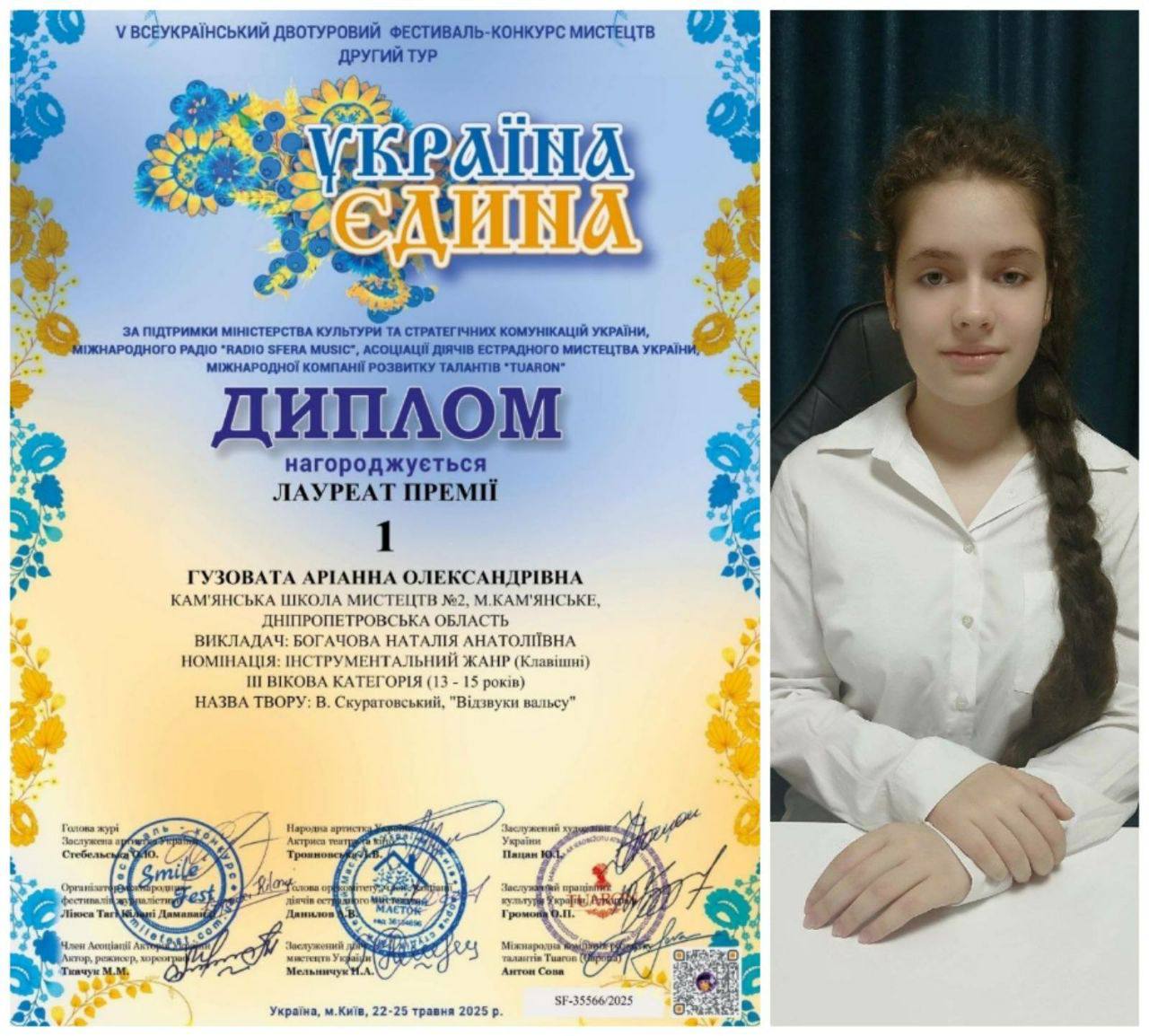 Гузовата Аріанна – лауреат І премії в ІІІ віковій ми категорії (13-15 років).