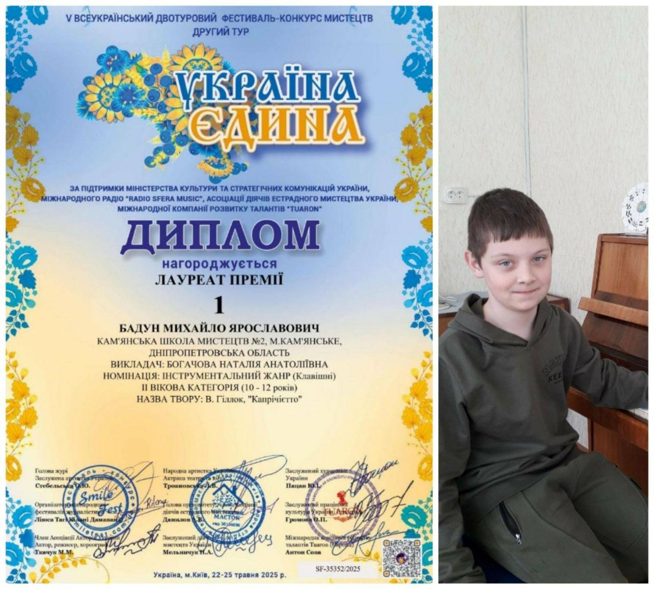 Бадун Михайло – лауреат І премії у ІІ віковій категорії (10-12 років);