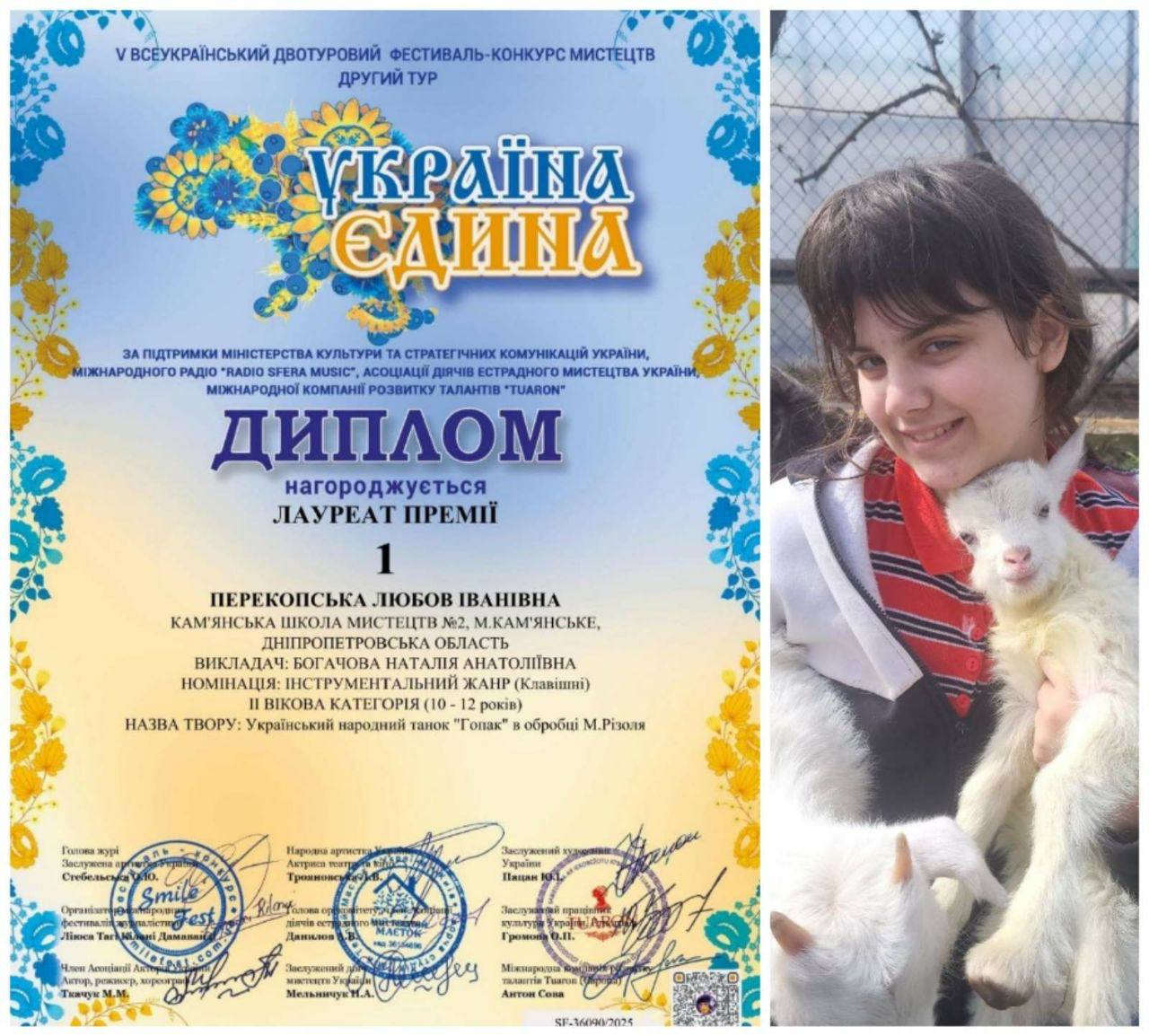 Наприкінці травня в дистанційному форматі відбувся V Всеукраїнський двотуровий фестиваль-конкурс мистецтв «Україна єдина» ( м. Київ). Цей конкурс відбувся за підтримки Міністерства культури та стратегічних комунікацій України, Міжнародного радіо «RADIO SFERA MUSIC», Асоціації діячів естрадного мистецтва.