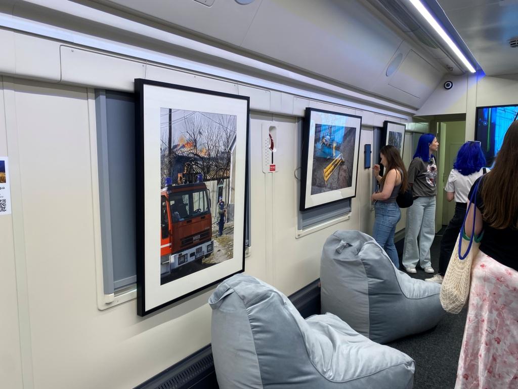 Перший вагон — зона відпочинку з пуфами, столиками та інтерактивними елементами. Тут відвідувачі можуть знайти QR-коди з аудіо- та текстовими історіями, переглянути відео про створення виставки та взяти безкоштовний журнал із описами світлин. Другий і третій вагони — це вже повноцінна фотогалерея.