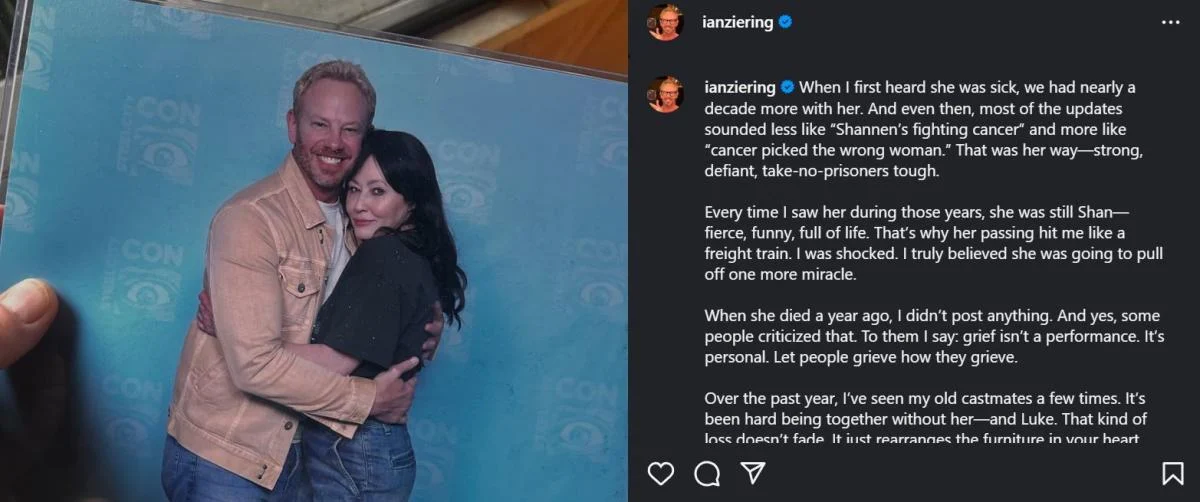 Згадав, якою була покійна Доерті та її колега Ян Зірінг. Він підкреслив, що досі не може повірити, що актриса померла. Актор висловив свій біль втрати та захоплення пам’яттю колеги, підкресливши її внутрішню силу та доброту. “Моя люба Шеннен, я часто думаю про тебе. Згадую твою стійкість. Твій вогонь. Твоє добре серце, яке так мало хто по-справжньому мав змогу побачити”, – написав чоловік.