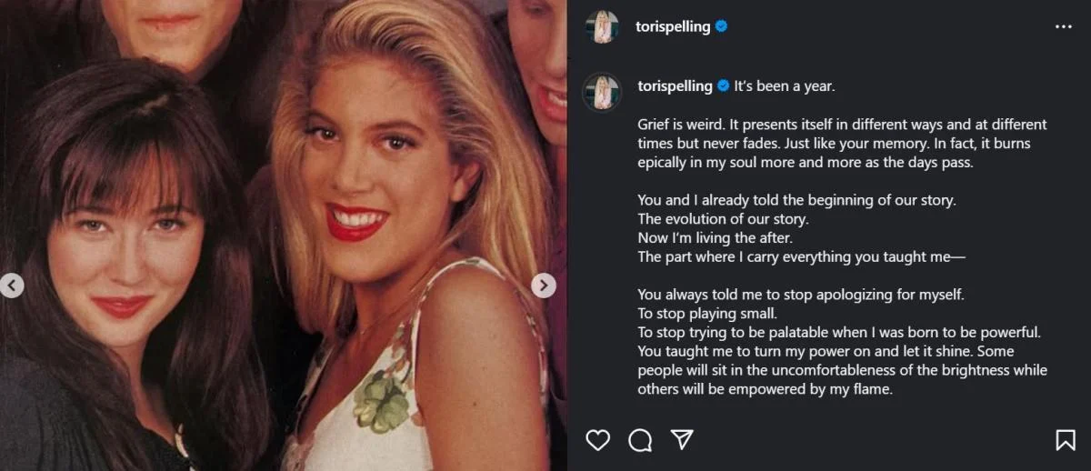 Серед опублікованих спогадів виділяється зворушливе послання Торі Спеллінг — колеги та близької подруги Шеннен. Вона щиро згадувала про ті уроки сили та стійкості, якими ділилася Шеннен з іншим жінками.
