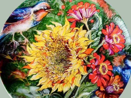 “Тарелі з квітковим розписом можуть стати справжньою родзинкою будь-якого інтер’єру та як святкового, так і щоденного сервірування, — говорить Людмила Карпінська-Романюк, колекціонерка українського фарфору, — Такий посуд допоможе підняти настрій у похмурий день та створити відчуття тепла і затишку. Квіти серпня особливі — у них наче сконцентроване все тепло літа, всі його барви. Ось таріль Юлії Красної “Сонячна симфонія”. У центрі — соняшник. Ця квітка завжди повертається до сонця, що символізує прагнення до світла, правди, оптимізму й духовного піднесення. Вона дуже популярна у мистецтві через свій символізм та сонячний, оптимістичний настрій.