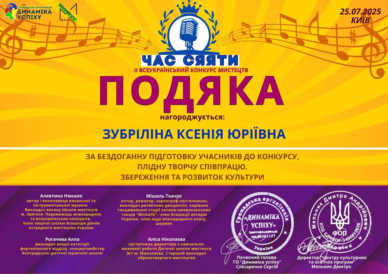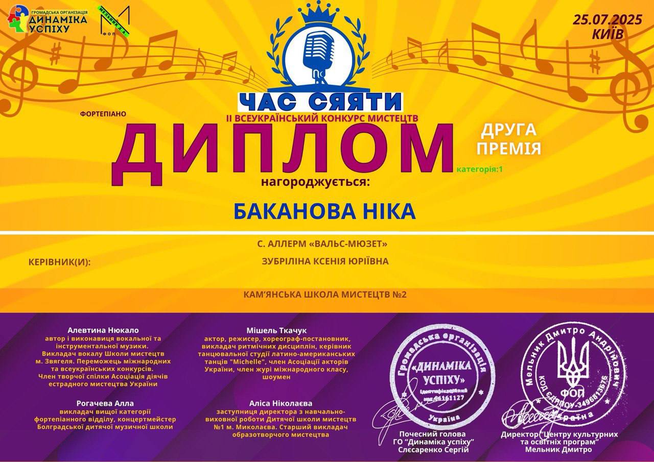 Нехай ця перемога стане справжнім стимулом для подальшого вдосконалення своєї майстерності та нових звершень у світі музики! Від щирого серця вітаємо ученицю Кам’янської школи мистецтв №2 Ніку Баканову з блискучим успіхом!
