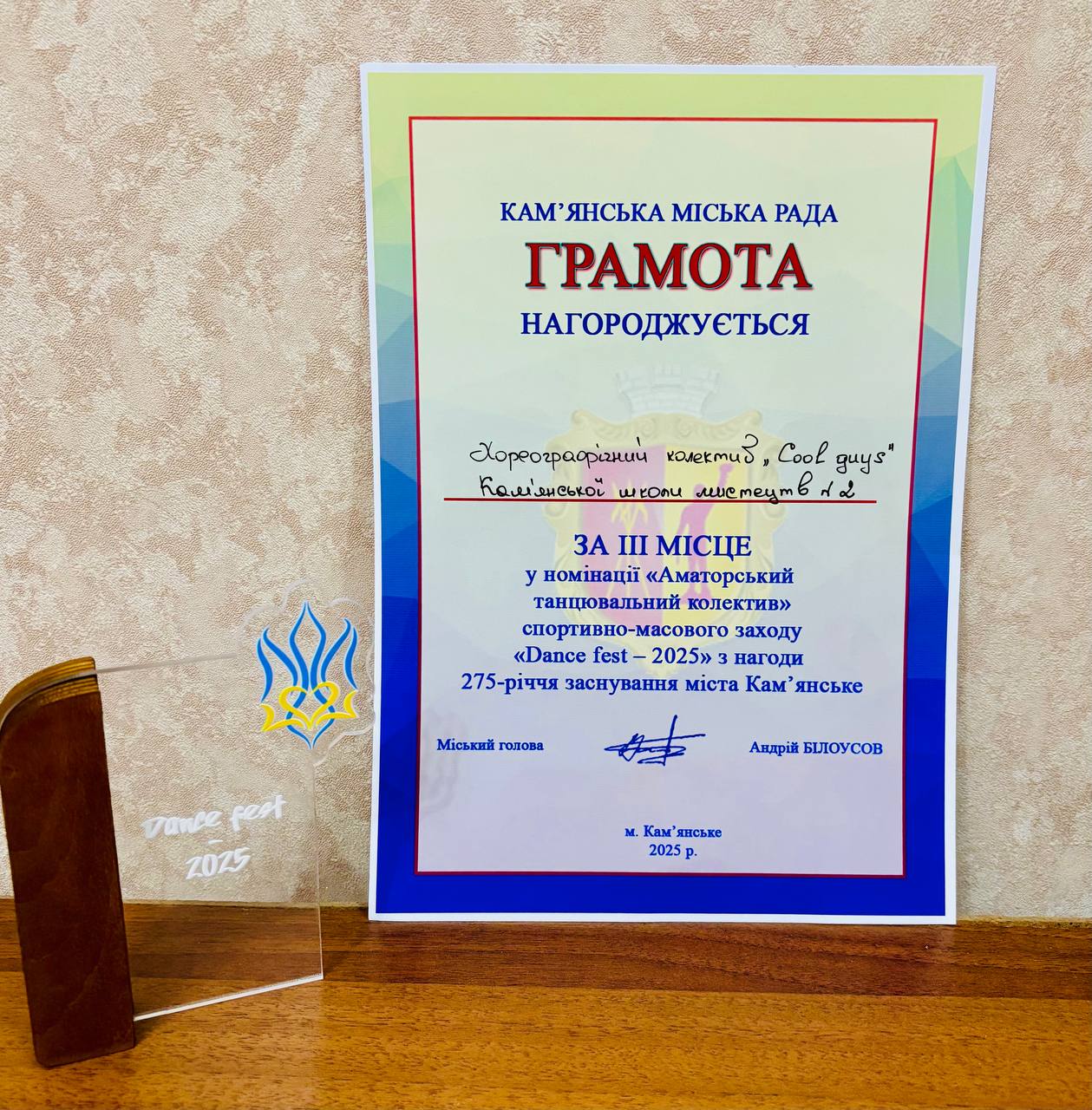 Школу представив хореографічний колектив “Cool guys”, що складається з учнів першого класу базового рівня та четвертого класу початкового рівня. Керівник – викладач Ірина Тутаєва. Наші талановиті учасники фестивалю заслужено здобули грамоту міськради Кам’янського за третє місце у категорії “Аматорський колектив”, а також пам’ятний подарунок – сертифікат магазину Comfy.