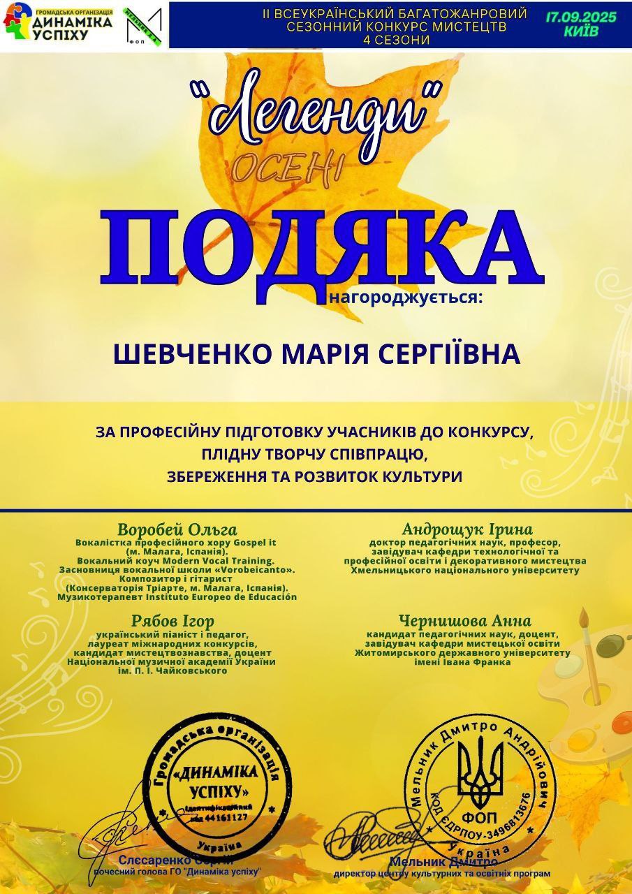 Її успіх став яскравим втіленням терплячої праці, творчого потенціалу та щирої любові до мистецтва. Педагог Марія Шевченко була відзначена подякою організаторами заходу за свою компетентну роботу, ефективну взаємодію з учнями та значний внесок у культурну спадщину України.