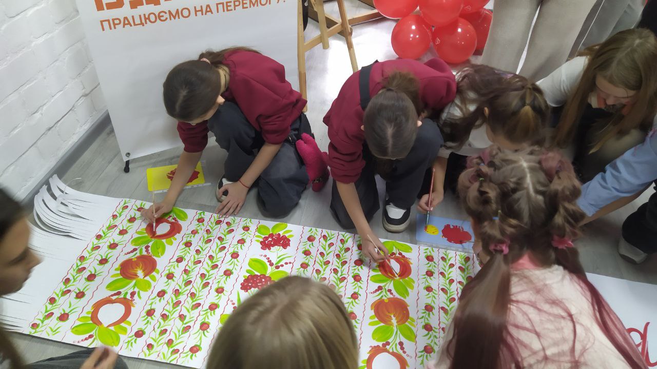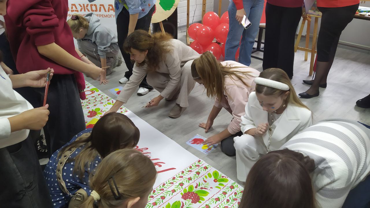 А потім була дуже хвилююча подія: викладачі відзначали дітей яскравими точками фарб, щоб ті відчули себе справжніми художниками. Після цього першокласники разом із педагогами старанно та захоплено малювали на символічному рушнику із Петриківським розписом: наносили калинку, цибульки та інші художні елементи. Скільки було радості та натхнення на дитячих обличчях! Першокласники сміливо зробили крок у світ мистецтва!