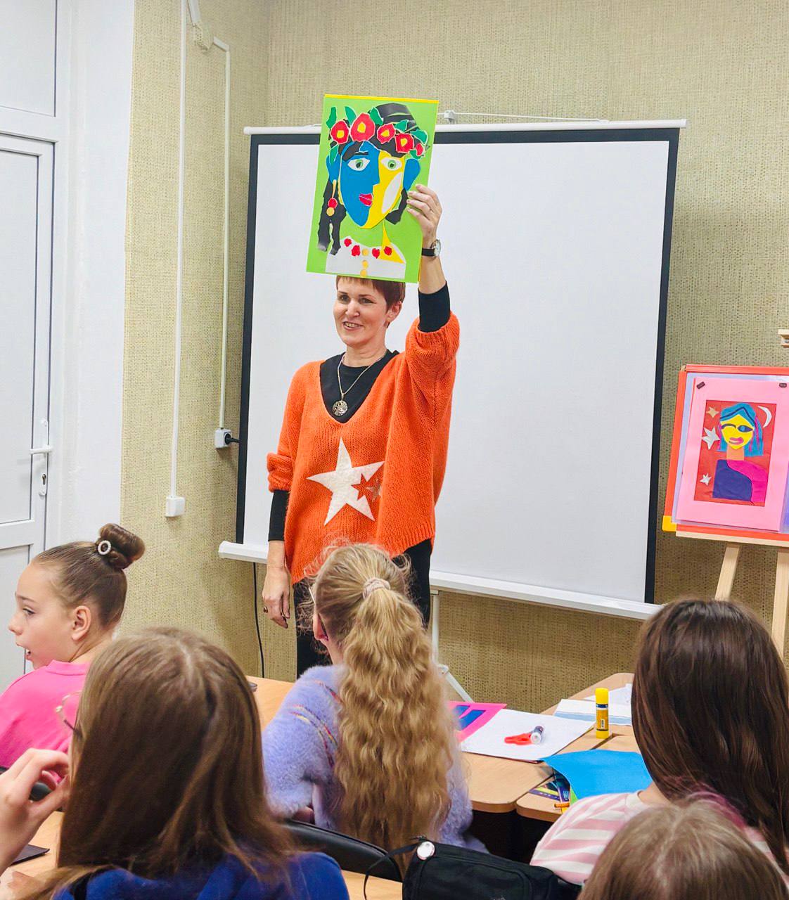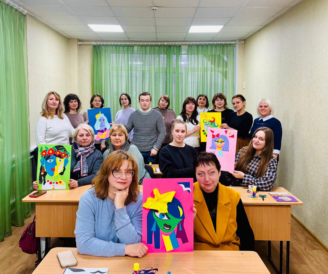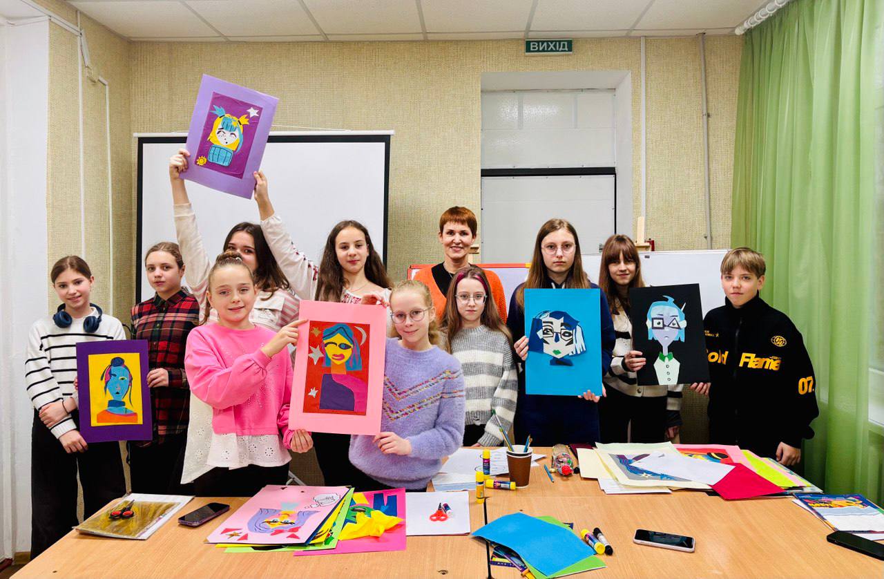 Атмосфера була дуже вільною. Тема: “Творчий портрет. Зображення людини з урахуванням її емоційного стану. Техніка аплікації”. Це вже звучить як вступ до докторської дисертації, але насправді це був просто вибух креативу, де всім дозволили творити з різнокольоровим папером.