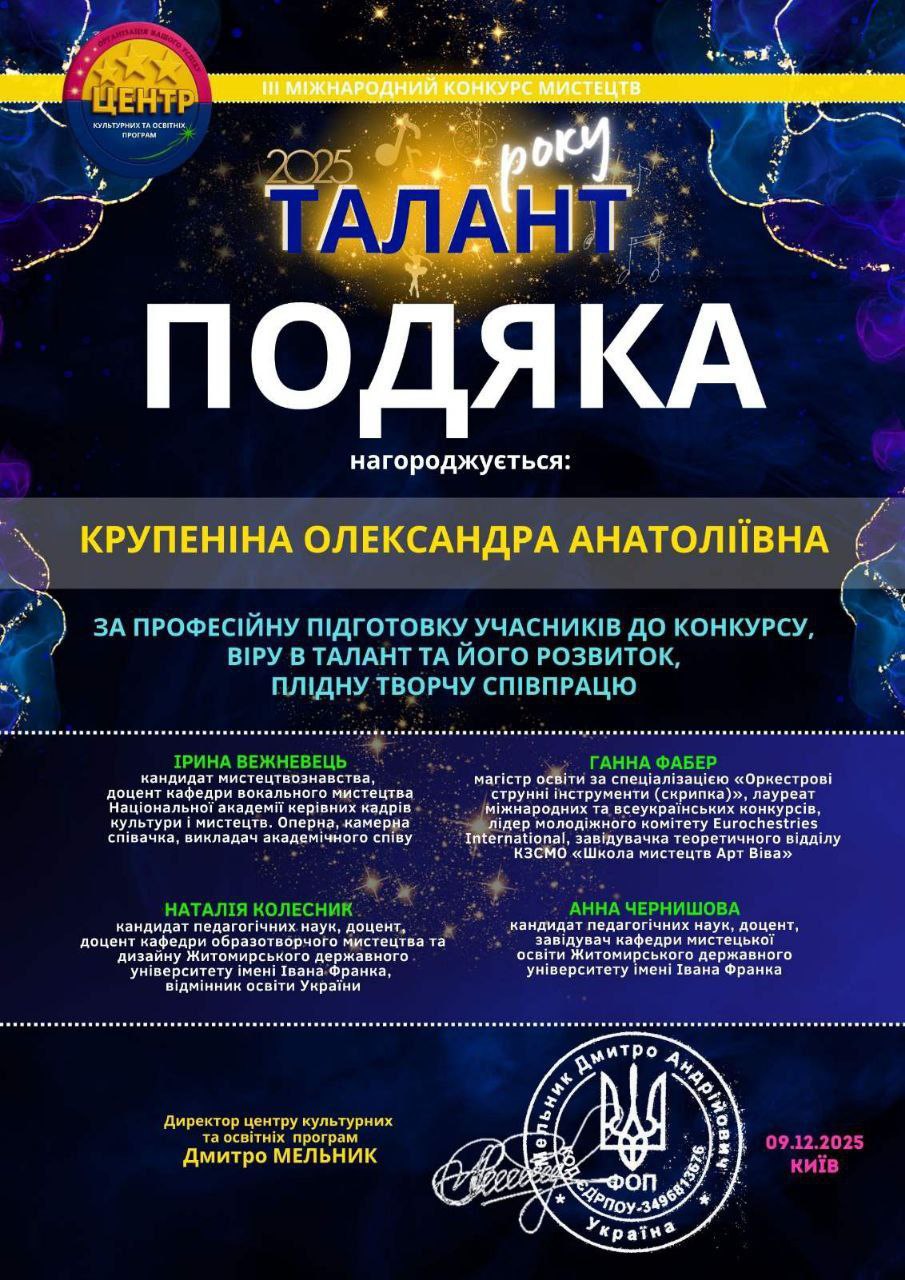 Зоряно, твій успіх надихає всю школу. Нехай цей Диплом І ступеня стане лише початком великого зіркового шляху. Ми щиро вболіваємо за тебе і знаємо: попереду буде ще багато підкорених сцен!