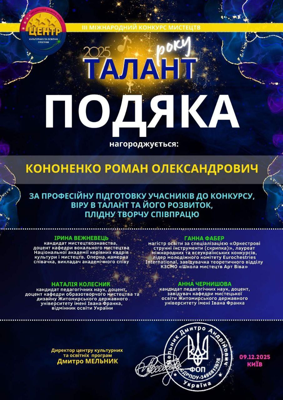 Величезна подяка наставникам , які привели Зоряну до цієї перемоги: викладачу Роману Кононенку та концертмейстеру Олександрі Крупеніній. Ваша праця та віра в учнів дарують такі неймовірні результати!