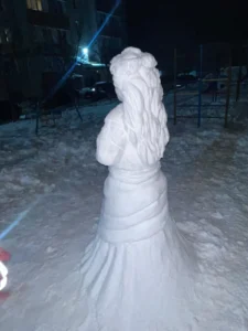 Мешканець Івано-Франківська Олександр Поляруш прикрасив двір на вулиці Симоненка патріотичним артоб’єктом. Попри складні погодні умови, він створив зі снігу деталізовану фігуру ляльки-мотанки.