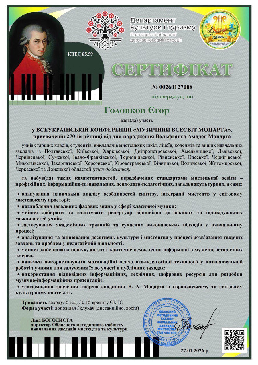 Для музичного світу дата 27 січня має особливе значення, адже саме цього дня народився великий віденський класик Вольфганг Амадей Моцарт. Цьогоріч культурна спільнота всього світу відзначала знаменний ювілей — 270-ту річницю від дня народження цього геніального композитора. Вихованці Камʼянської школи мистецтв №2 вирішили вшанувати пам’ять митця інтелектуальною працею, долучившись до масштабної Всеукраїнської конференції “Музичний всесвіт Моцарта”.