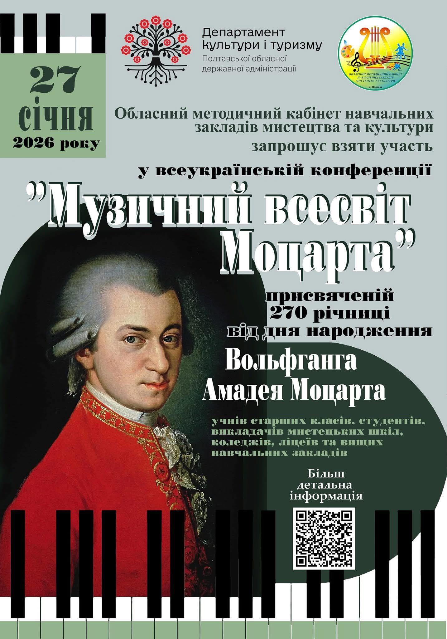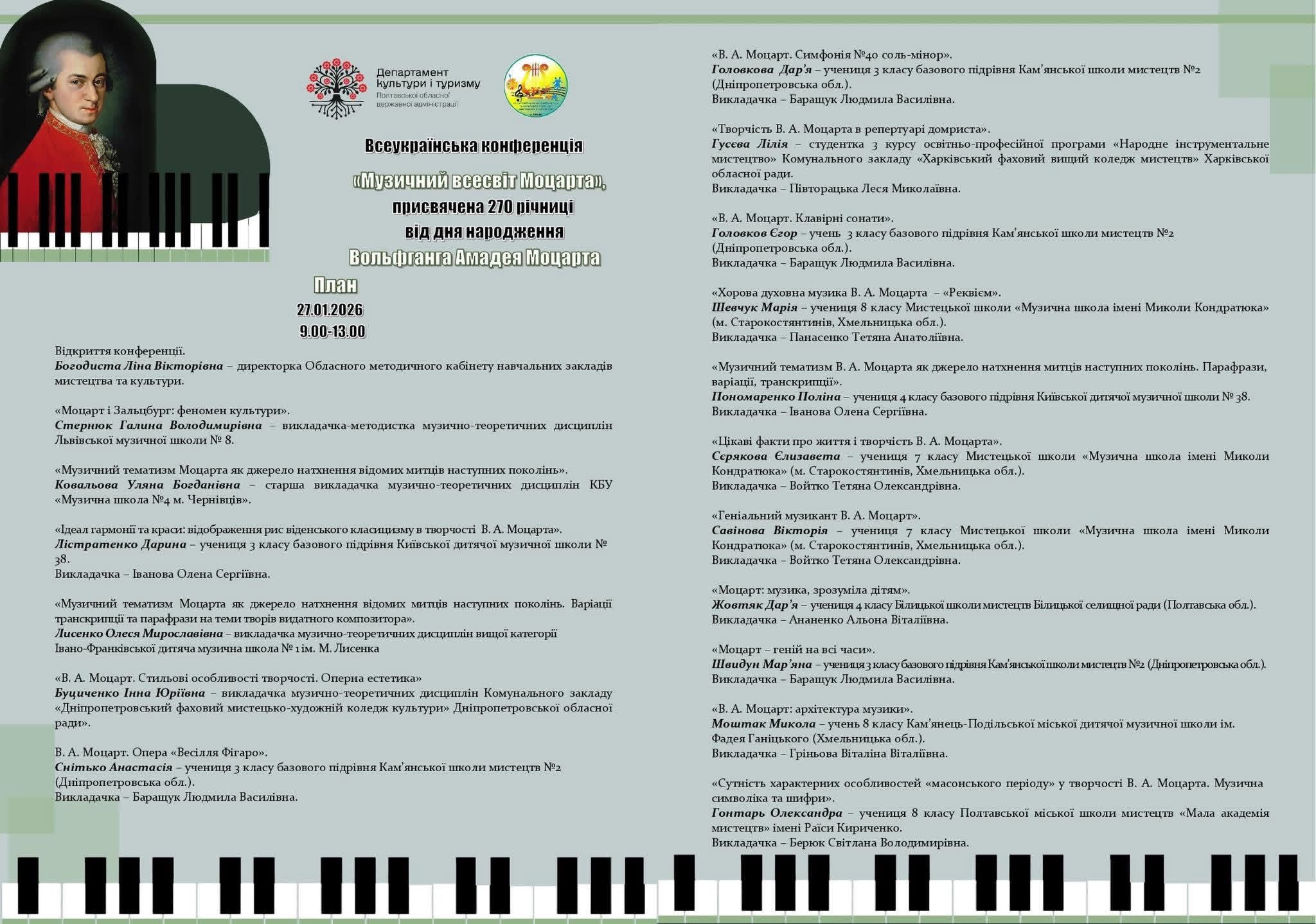 Для музичного світу дата 27 січня має особливе значення, адже саме цього дня народився великий віденський класик Вольфганг Амадей Моцарт. Цьогоріч культурна спільнота всього світу відзначала знаменний ювілей — 270-ту річницю від дня народження цього геніального композитора. Вихованці Камʼянської школи мистецтв №2 вирішили вшанувати пам’ять митця інтелектуальною працею, долучившись до масштабної Всеукраїнської конференції “Музичний всесвіт Моцарта”.