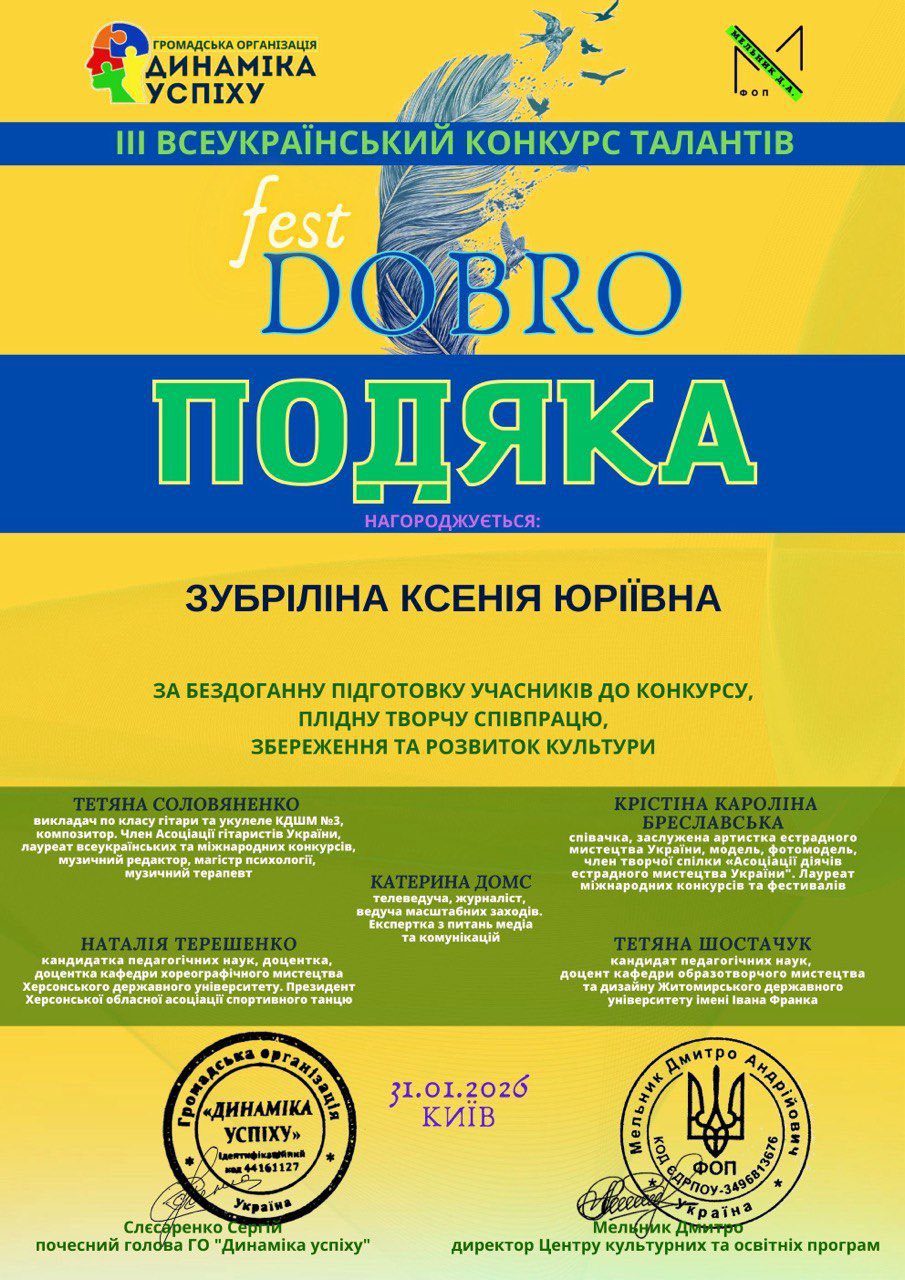 Саме ці фундаментальні людські цінності закладені в основу ІІІ Всеукраїнського конкурсу талантів “DOBRO FEST”. Цей масштабний захід відбувся 31 січня у дистанційному форматі, ставши особливим майданчиком, де гармонійно поєдналися творчість, гуманність та натхненні помисли.