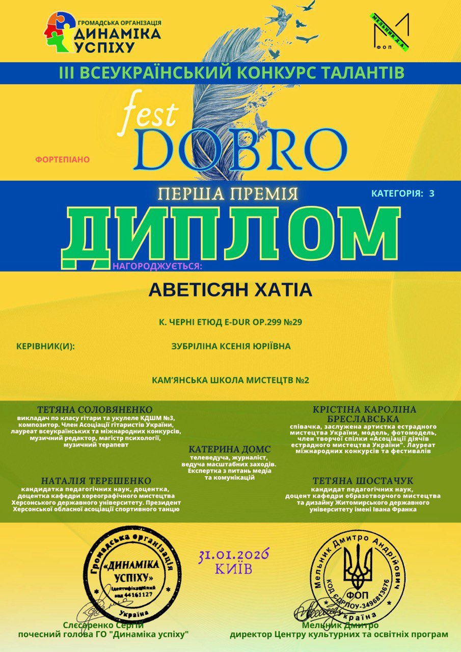 Щиро вітаємо Хатію Аветісян та її викладачку з цим чудовим результатом і бажаємо нових творчих вершин!