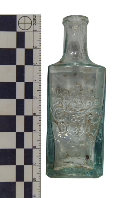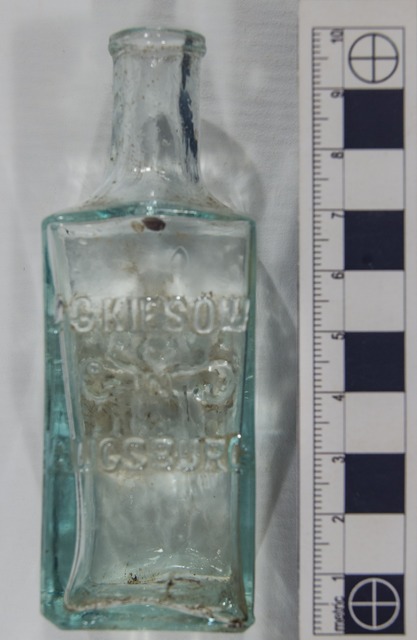 Маркування: на стінках зображено герб роду Кізових (три листки конюшини) та фігуру людини з пляшечкою в руках. Напис «SCHUTZ MARKE» свідчить про захист торговельної марки, що дозволяє датувати виріб періодом між 1880 та 1920 роками.