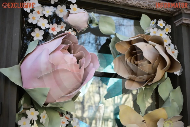 Фотозона сформована з розкішних гігантських півоній та величних троянд. Великі бутони закріплені на фасаді будівлі, а загальний вигляд композиції гармонійно підкреслюють дрібніші елементи декору. Для створення весняного настрою обрано ніжну пастельну палітру — поєднання рожевих, бежевих та білих відтінків.