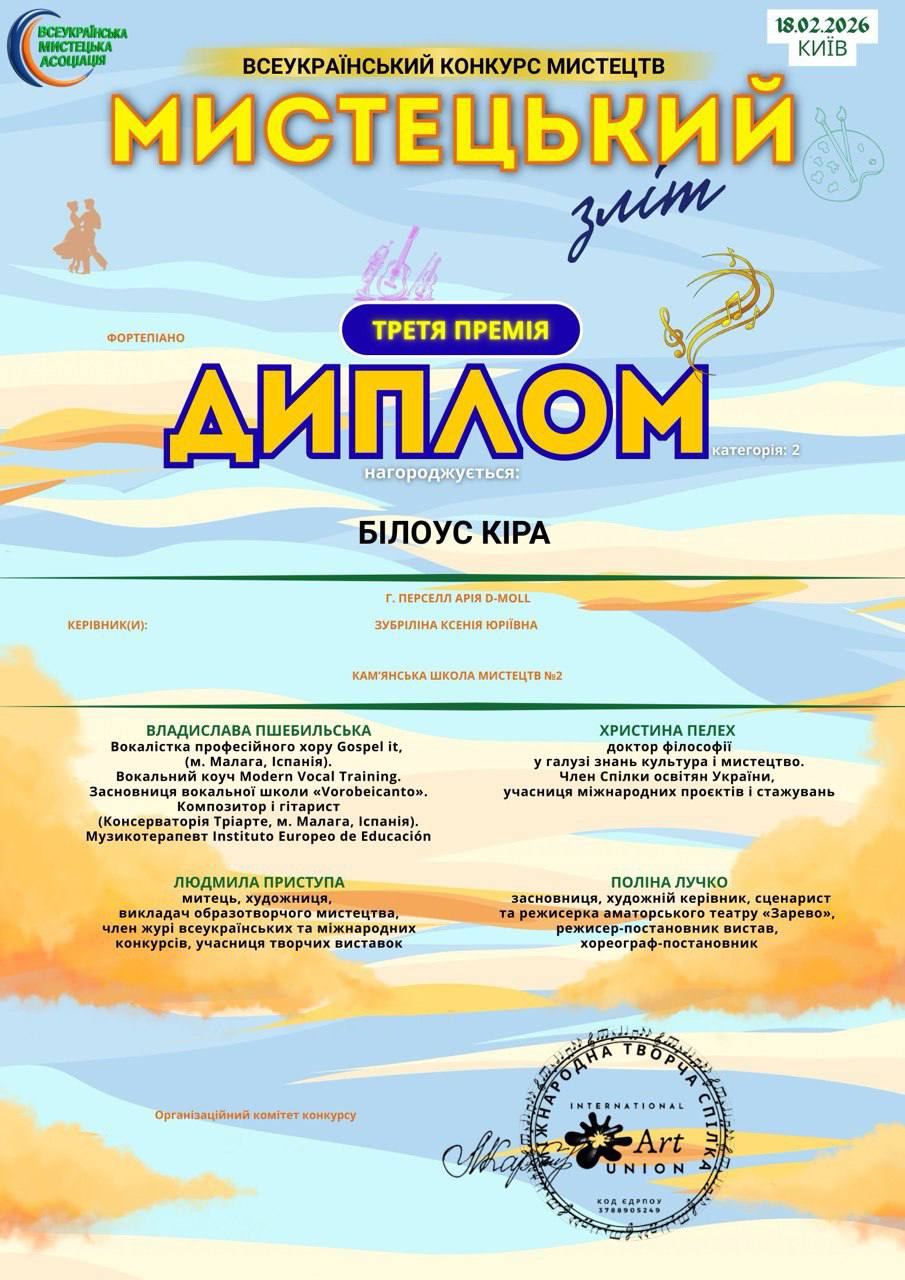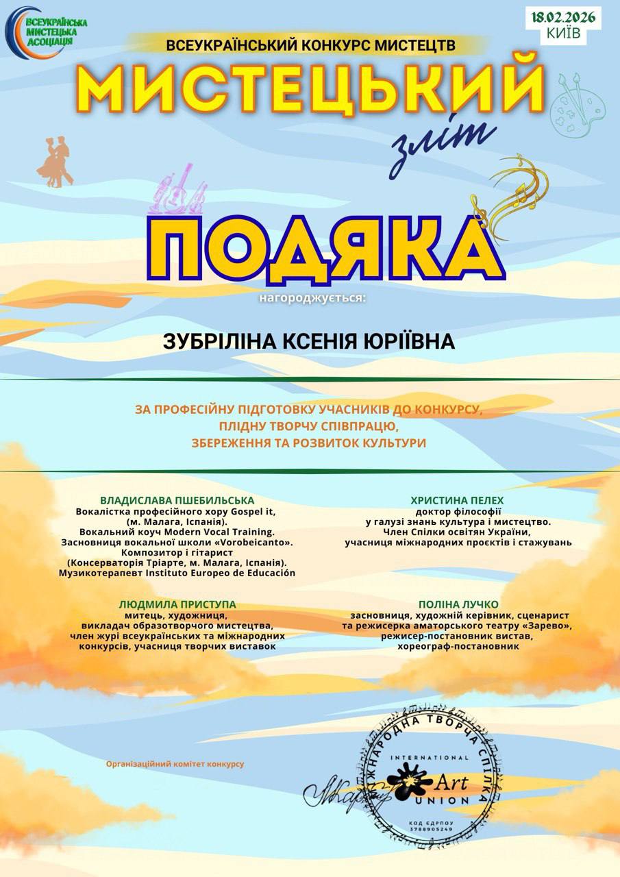 Мистецтво — це безперервна подорож у майбутнє, вічний пошук самобутніх голосів, новаторських форм та підкорення небачених раніше вершин. Яскравим підтвердженням цього став Всеукраїнський конкурс мистецтв “МИСТЕЦЬКИЙ ЗЛІТ”, що пройшов у дистанційному форматі 18 лютого 2026 року. Цей захід перетворився на масштабну платформу, яка згуртувала обдаровану молодь з усіх куточків України в єдиному натхненному просторі.
