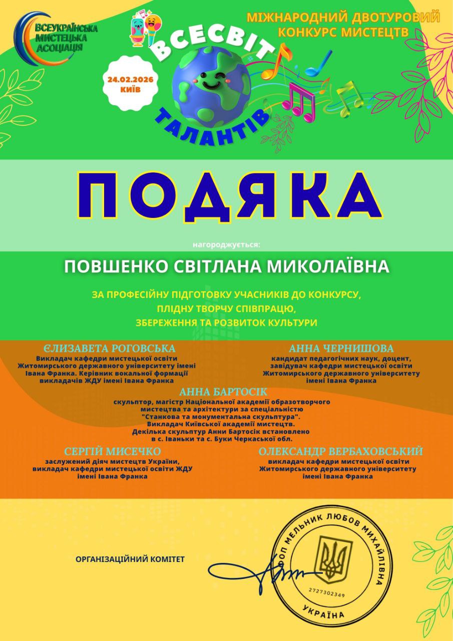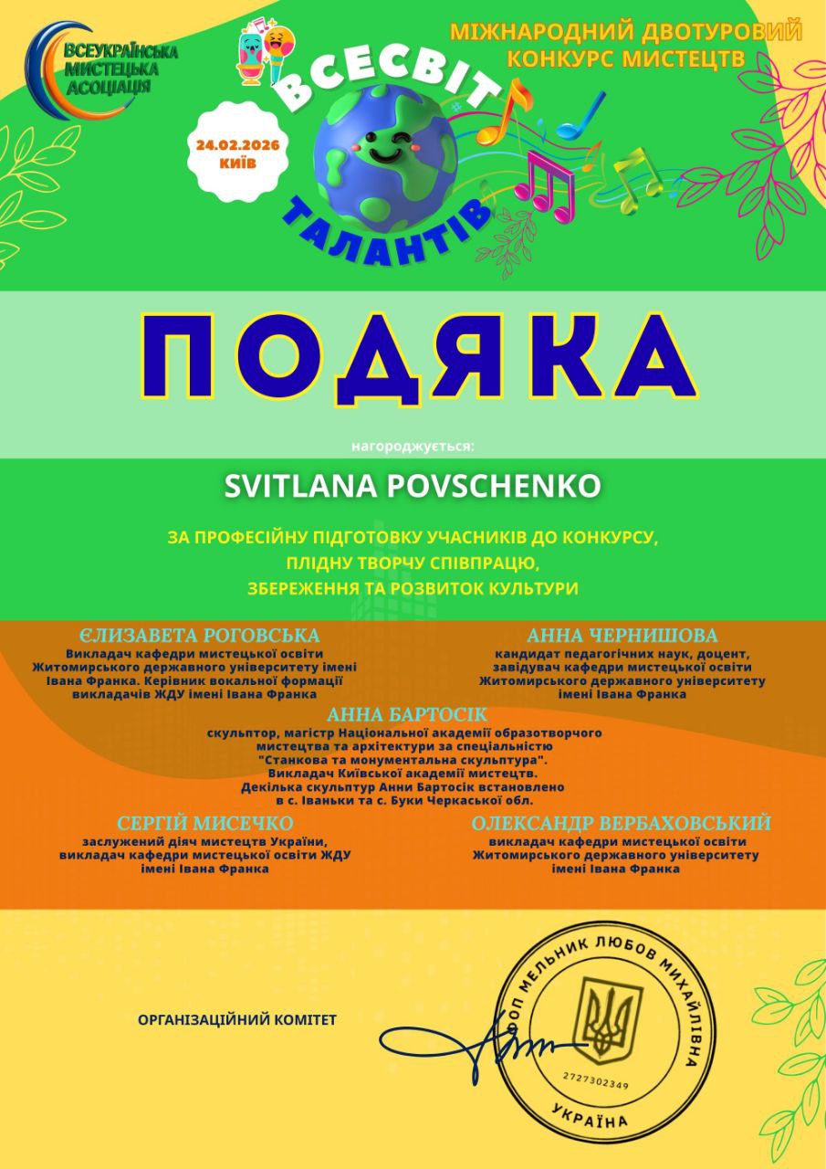 Такі яскраві результати стали можливими завдяки сумлінній праці учнів та професійній підтримці їхньої викладачки — Світлани Повшенко, яка допомогла вихованцям розкрити свій творчий потенціал на міжнародному рівні.