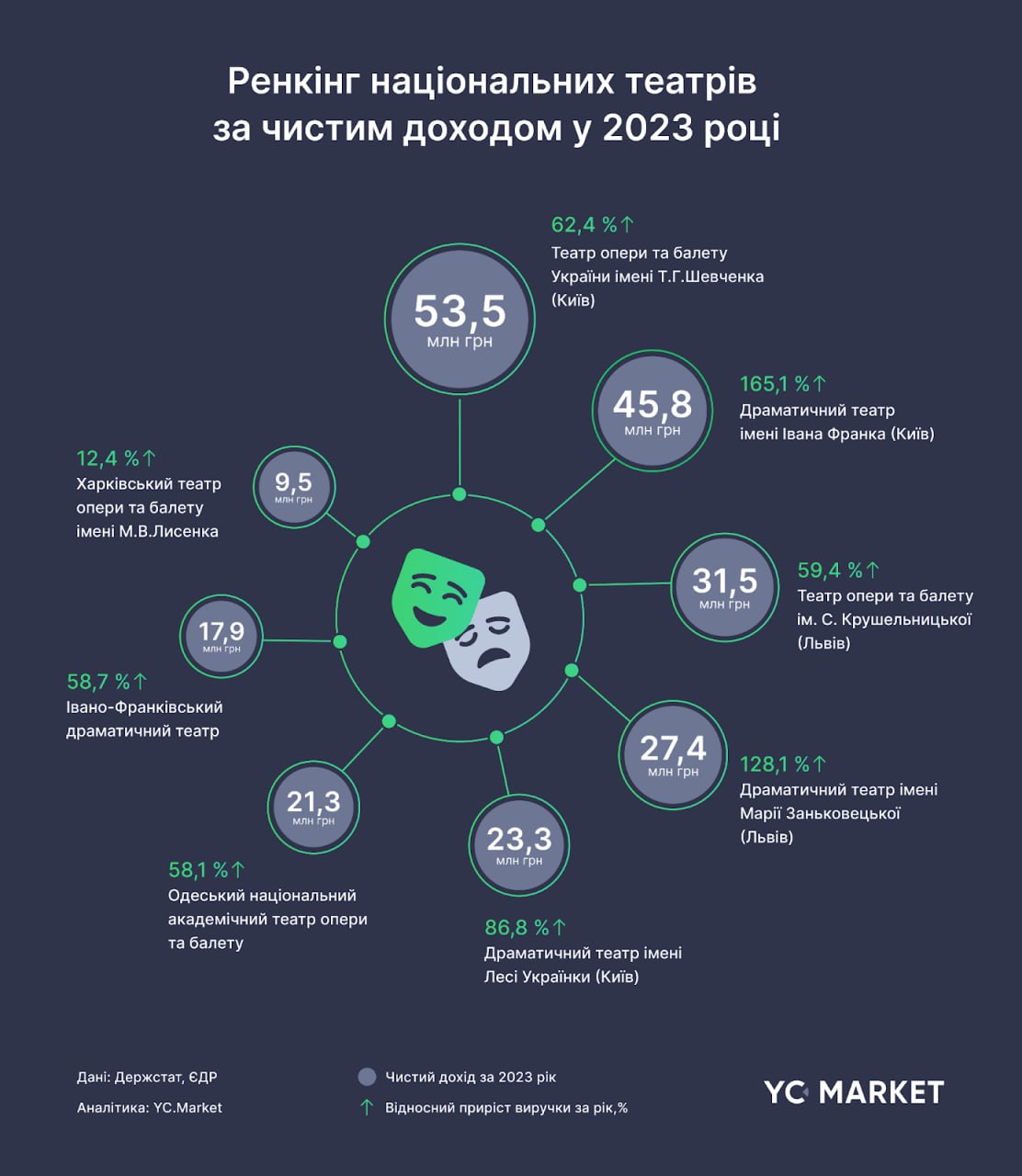У 2023 році на підтримку національних театрів тільки за програмою “Фінансова підтримка театрів” держава виділила понад 1,3 млрд грн. Загалом за даною програмою із державного бюджету фінансуються 8 театрів. За даними YC.Market, найбільше коштів у 2023 році отримав Національний академічний театр опери та балету України імені Т.Г.Шевченка — понад 322 млн грн, найменше — Франківський драмтеатр — майже 45 млн грн. Переважну більшість отриманих від держави коштів, театри в першу чергу спрямовують на виплату заробітної плати співробітникам та сплату податків. Ще частина йде на сплату комунальних послуг і лише кілька відсотків на придбання нового обладнання чи оновлення декорацій.