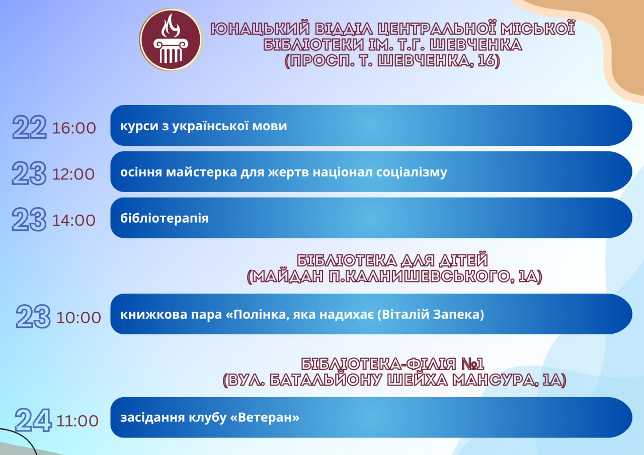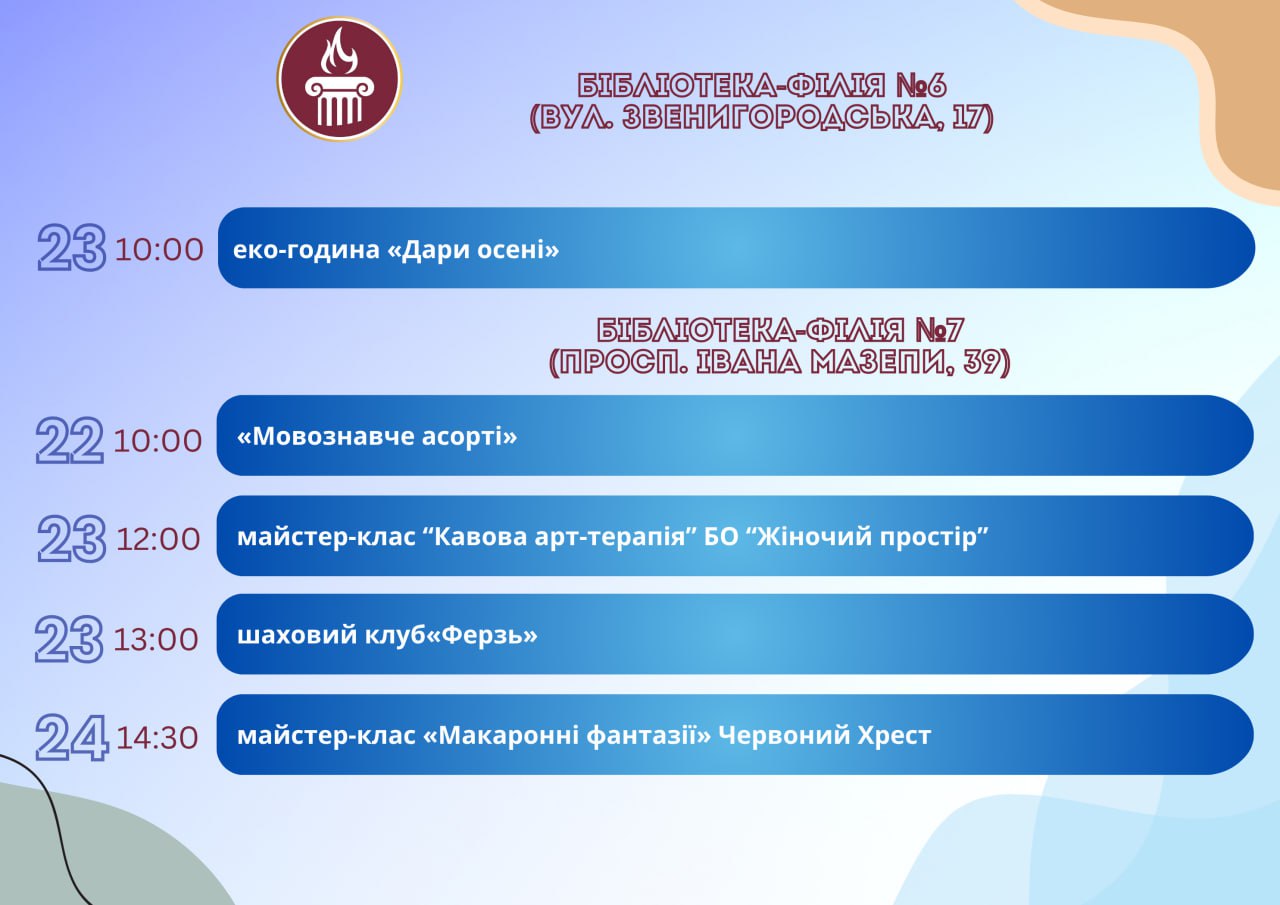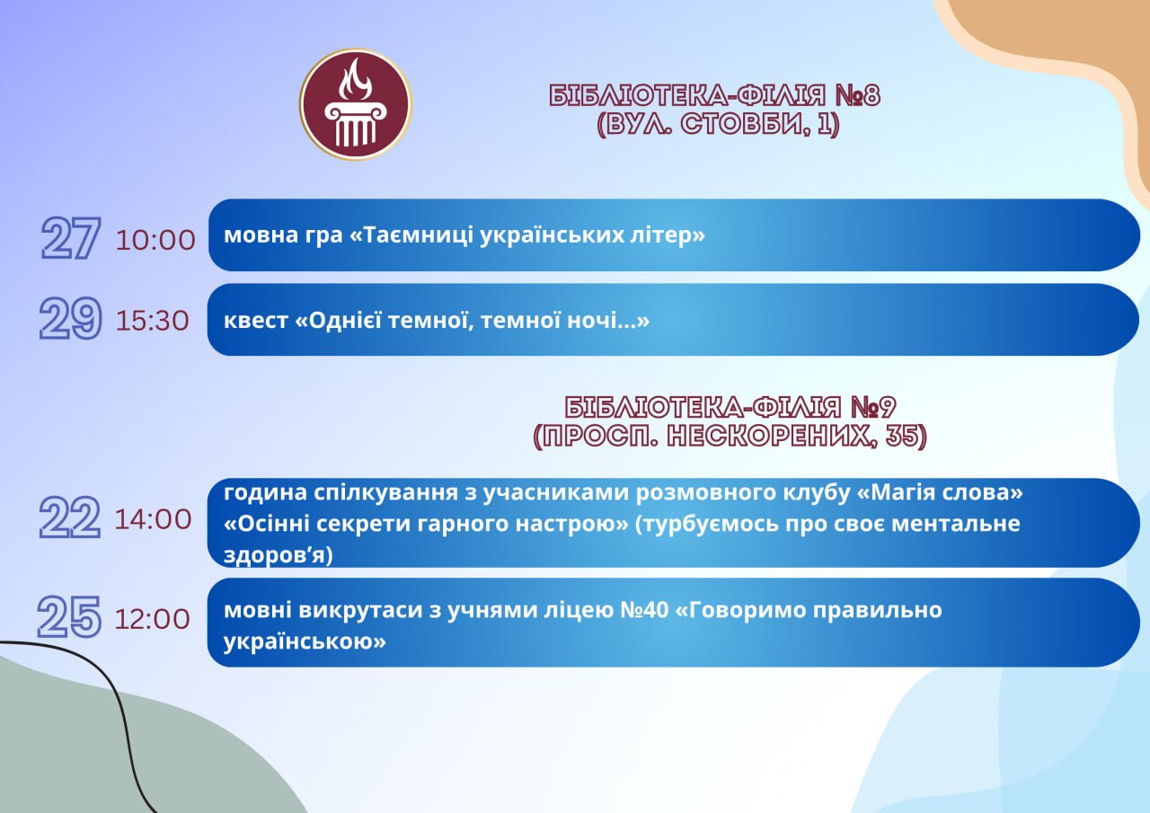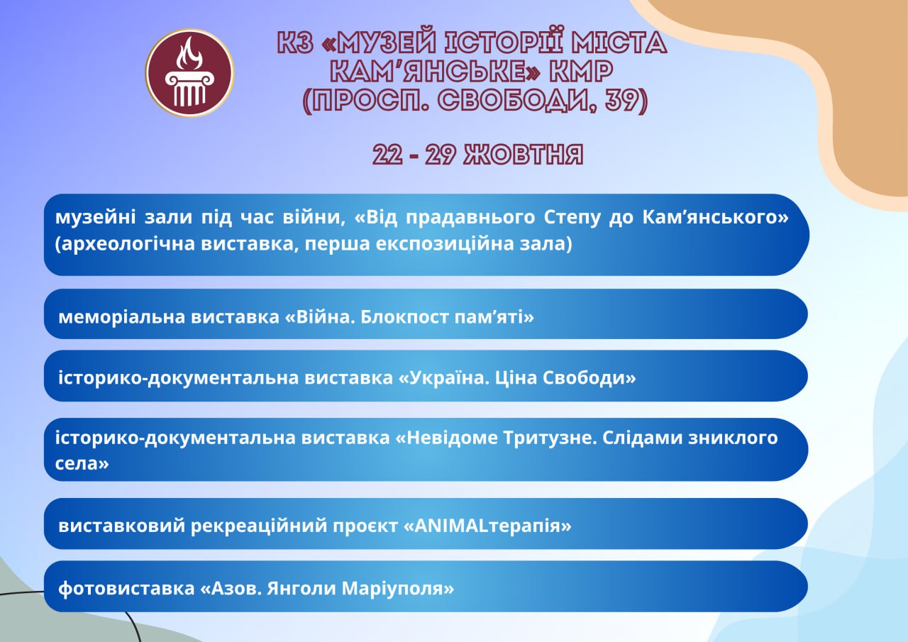 Головна Афіша Програма заходів у закладах культури міста Кам’янське 29 Жовтня, 2025 00:00 Вікові обмеження 0+ З 22 по 29 жовтня