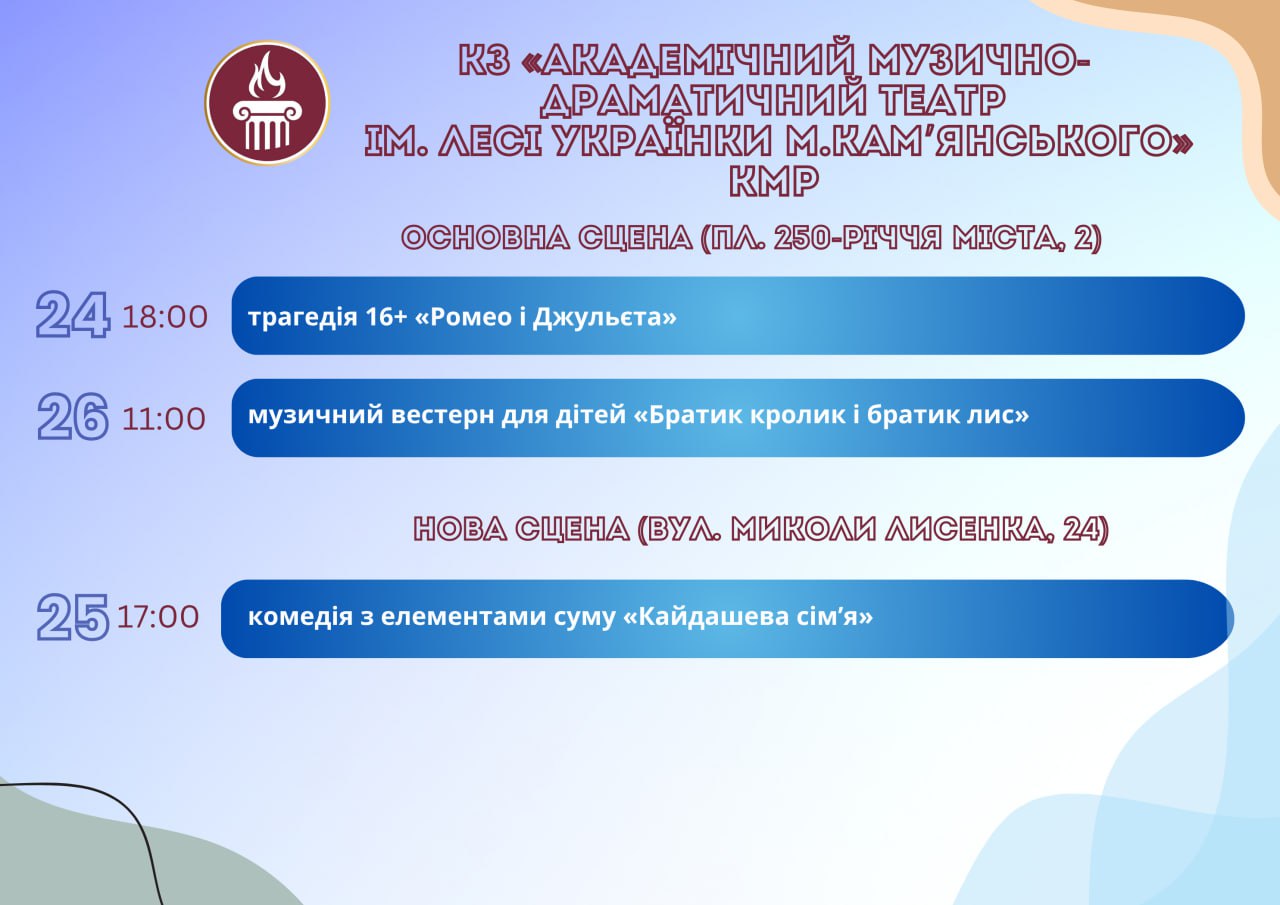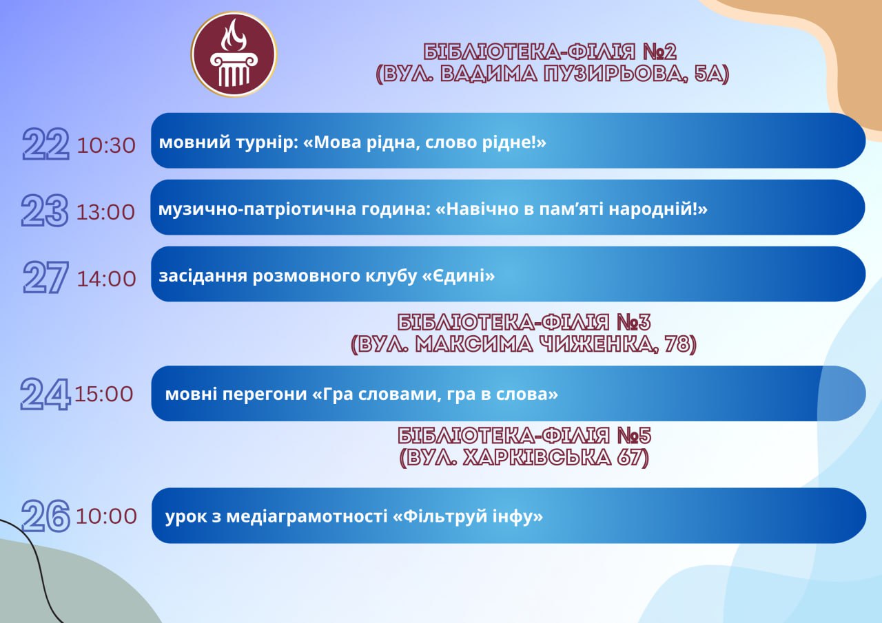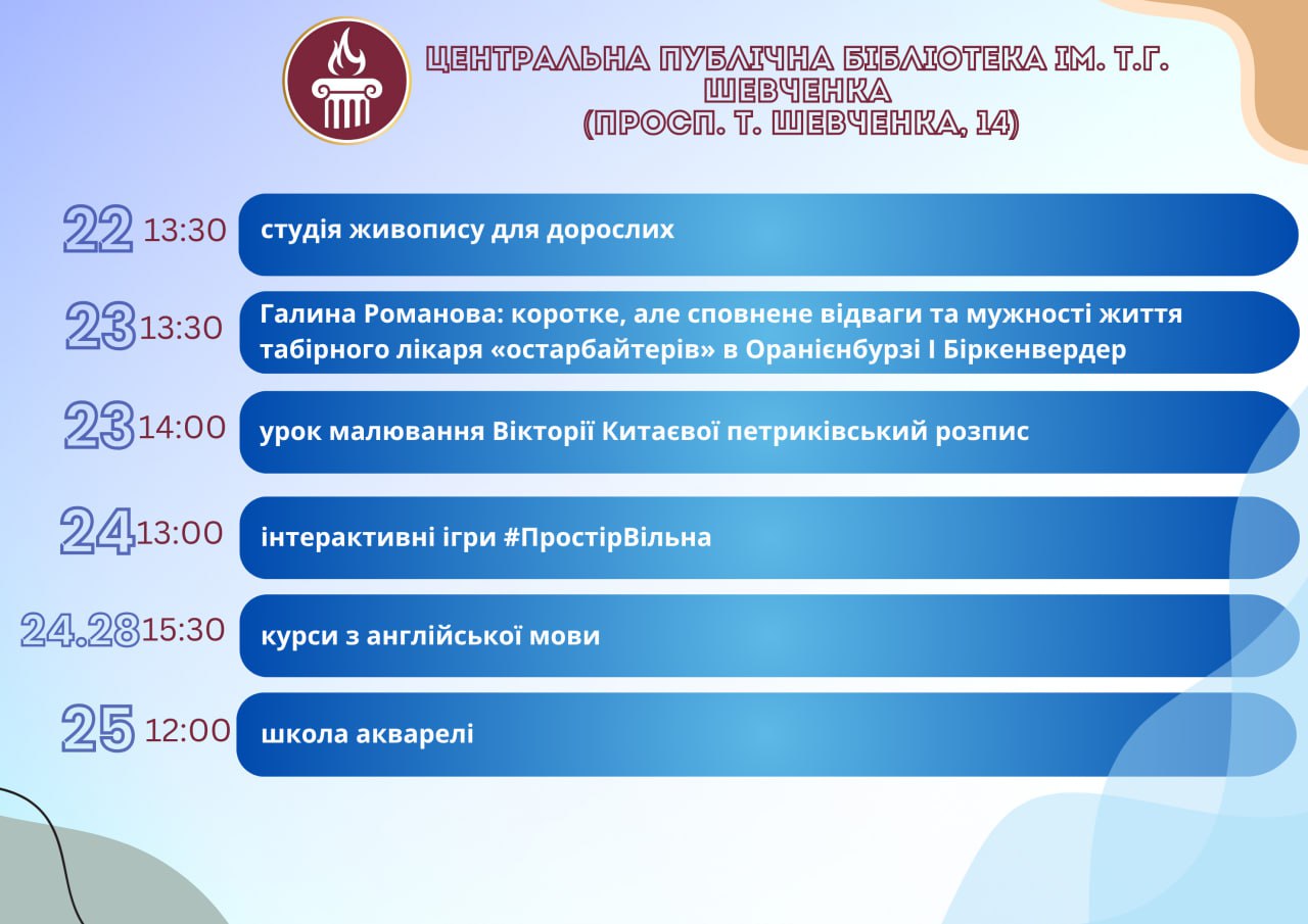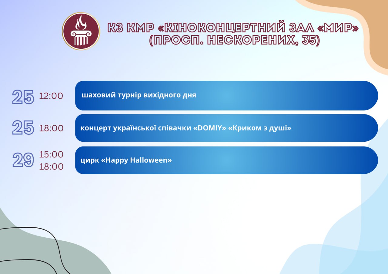 Головна Афіша Програма заходів у закладах культури міста Кам’янське 29 Жовтня, 2025 00:00 Вікові обмеження 0+ З 22 по 29 жовтня