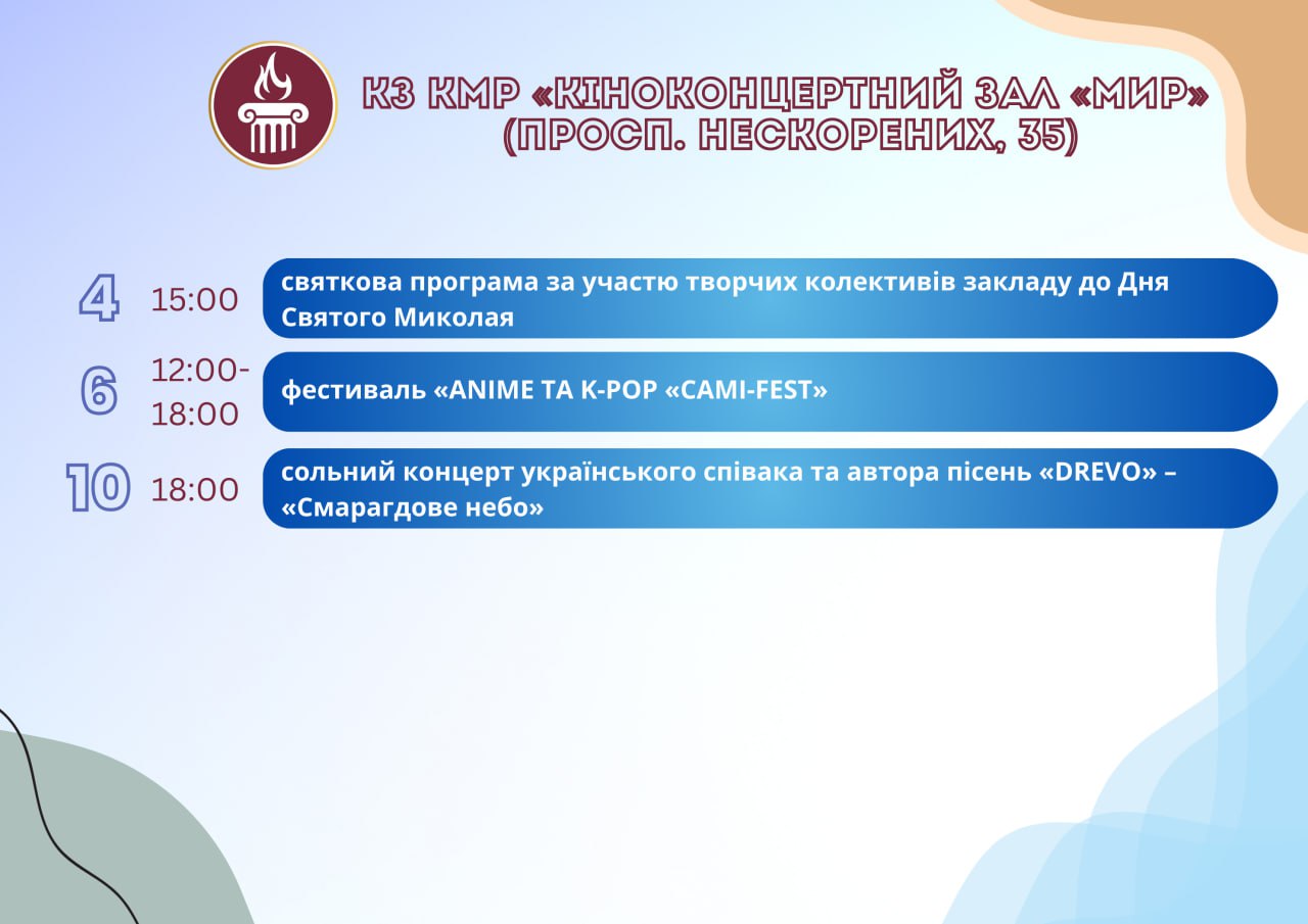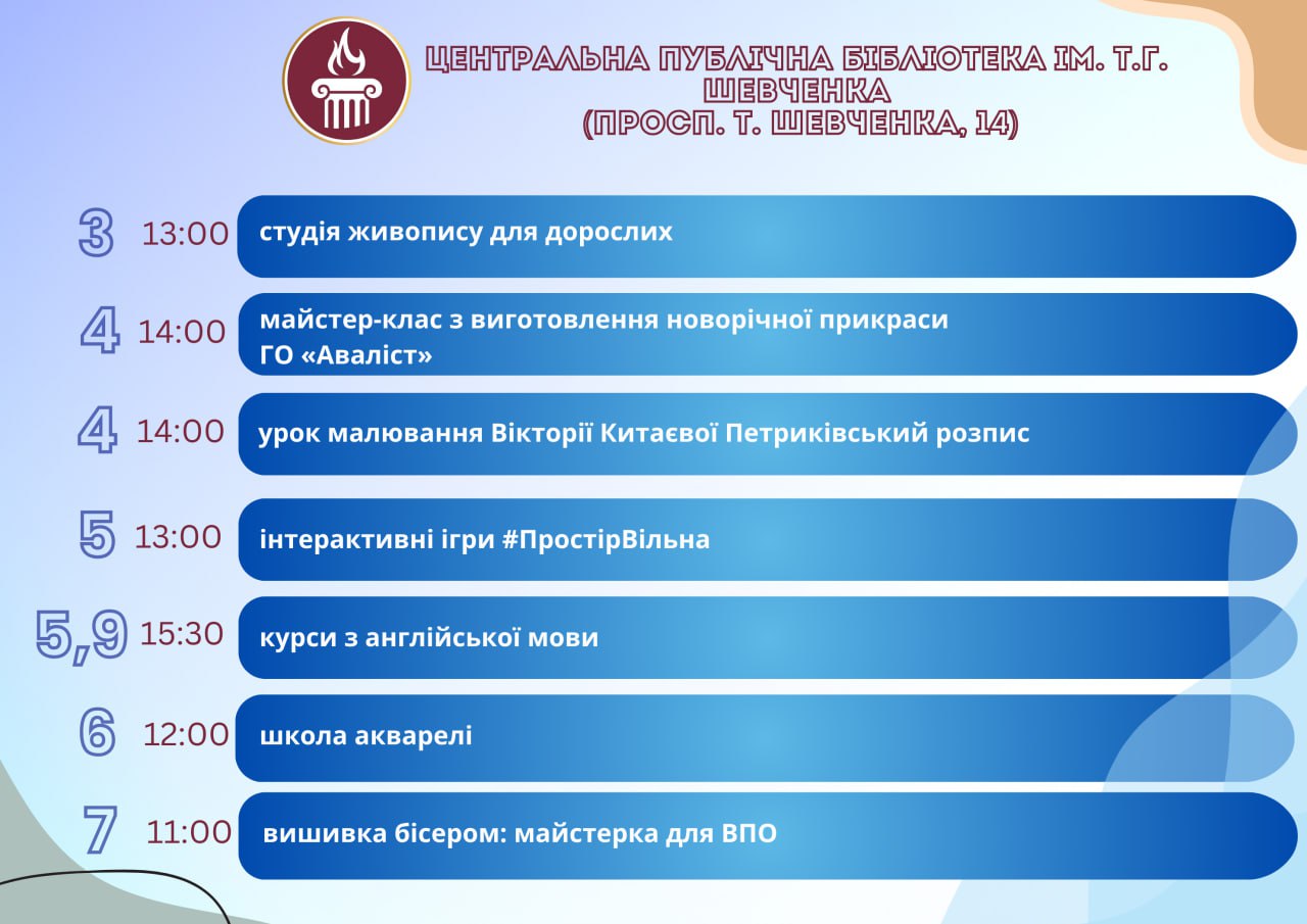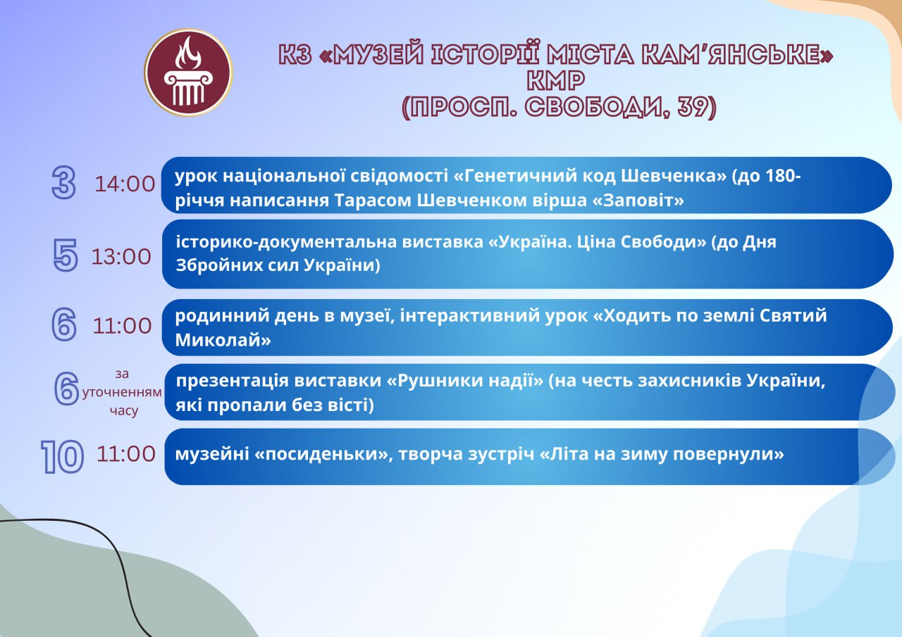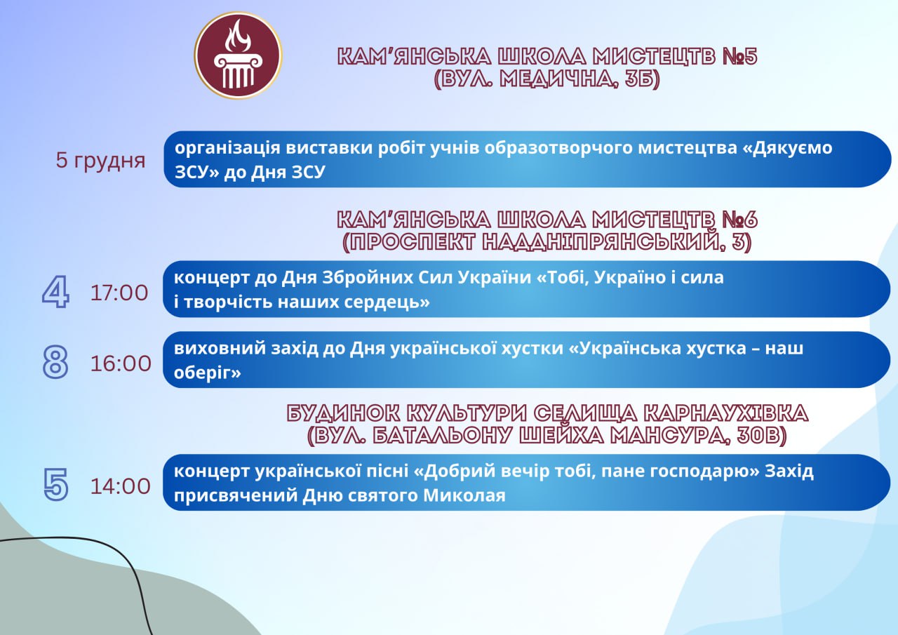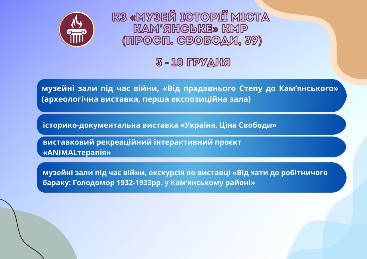 Головна Афіша Програма заходів у закладах культури міста Кам’янське 10 Грудня, 2025 00:00 Вікові обмеження 0+ з 3 по 10 грудня