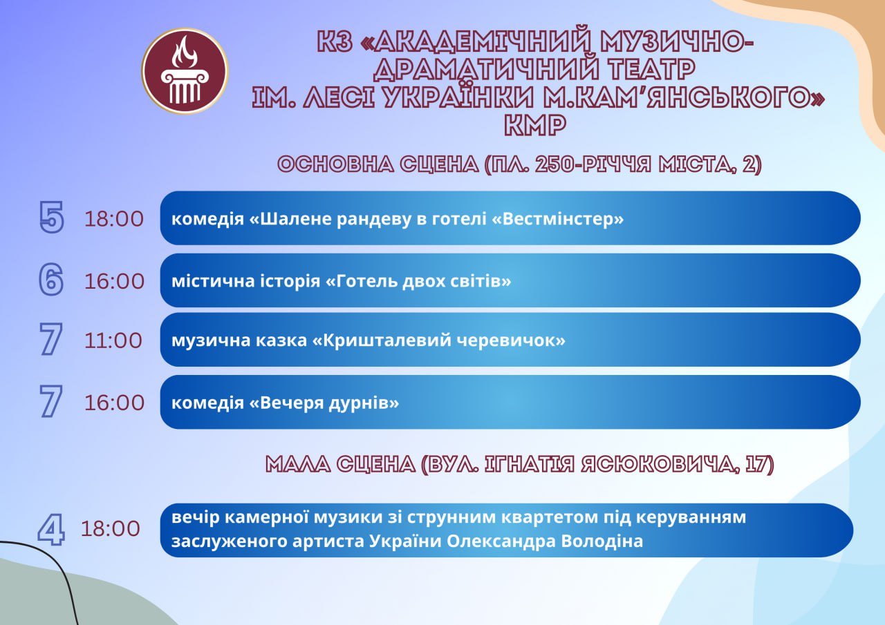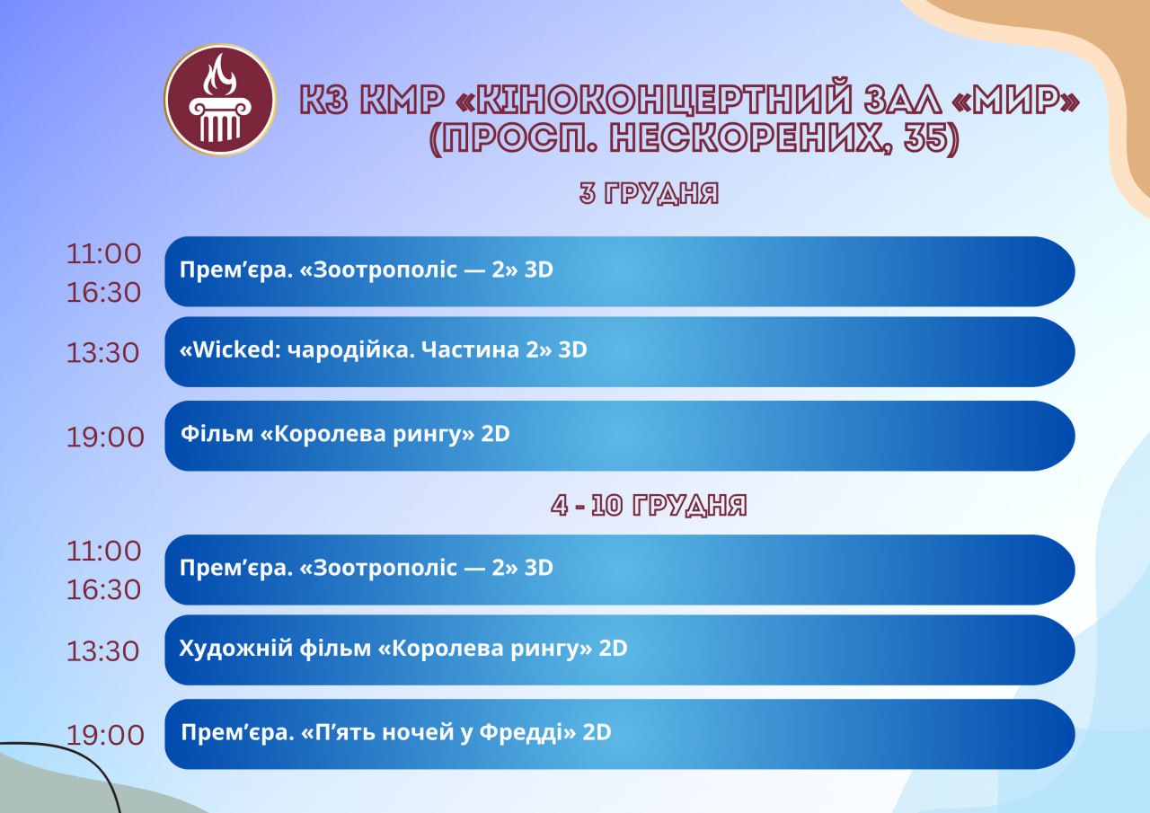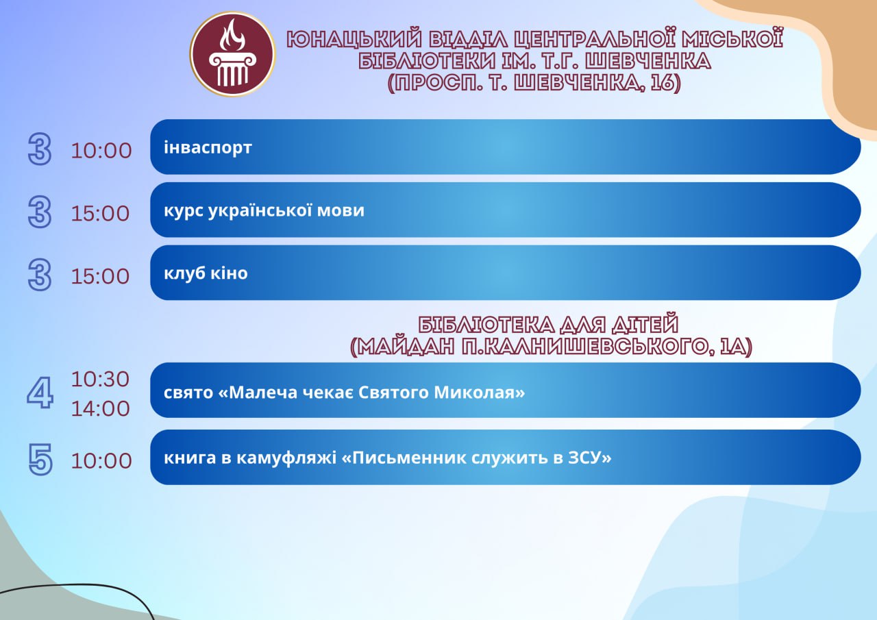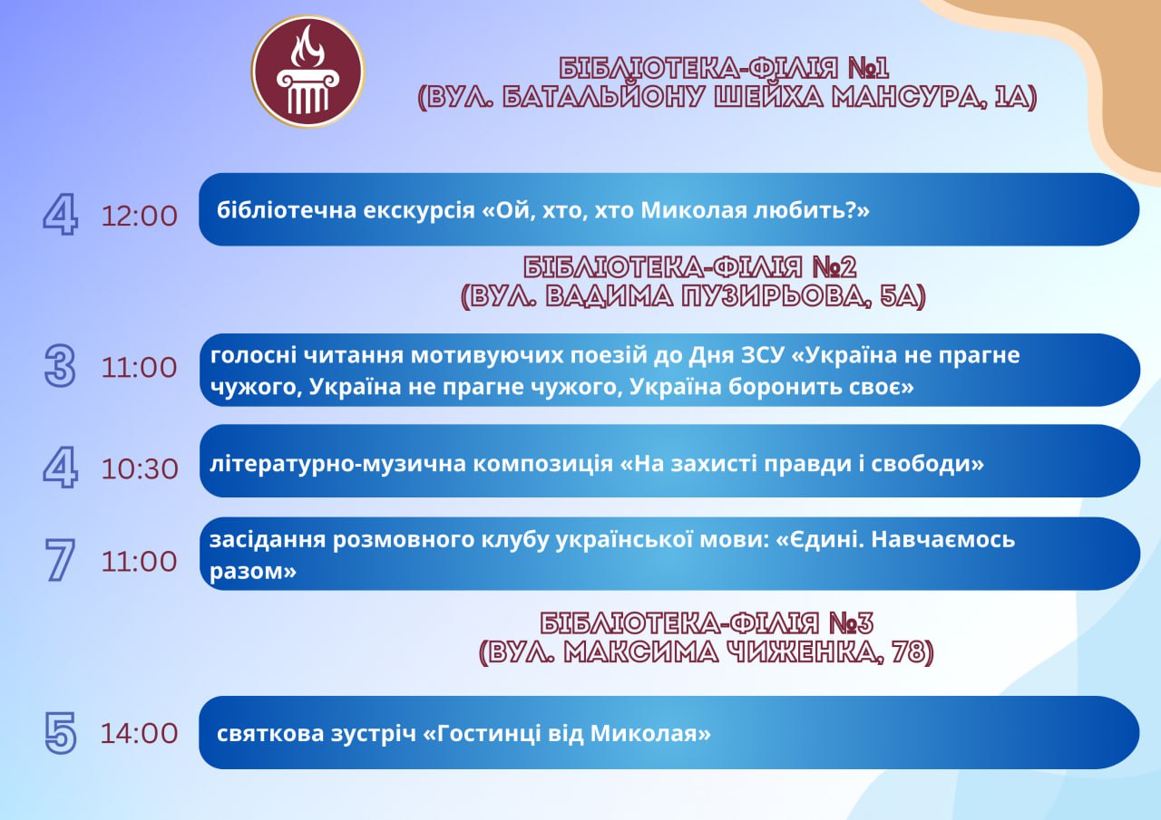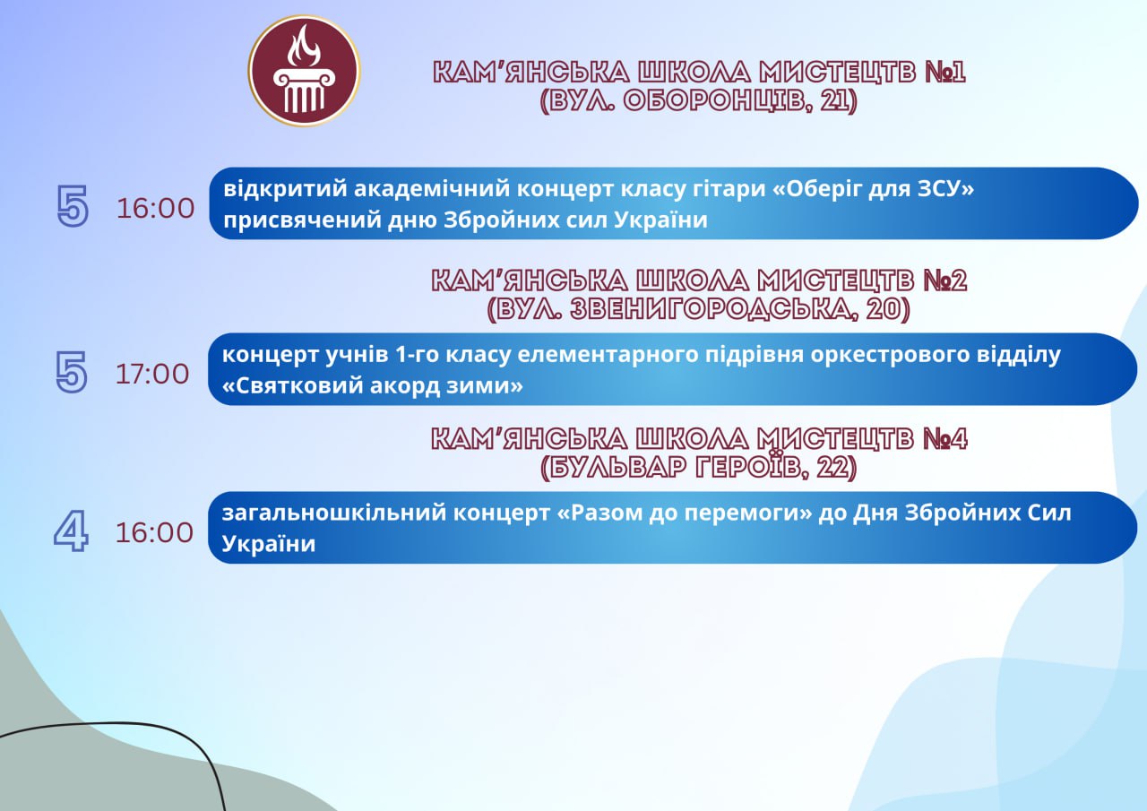 Головна Афіша Програма заходів у закладах культури міста Кам’янське 10 Грудня, 2025 00:00 Вікові обмеження 0+ з 3 по 10 грудня