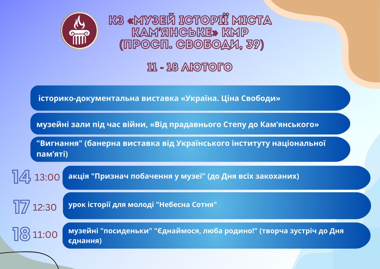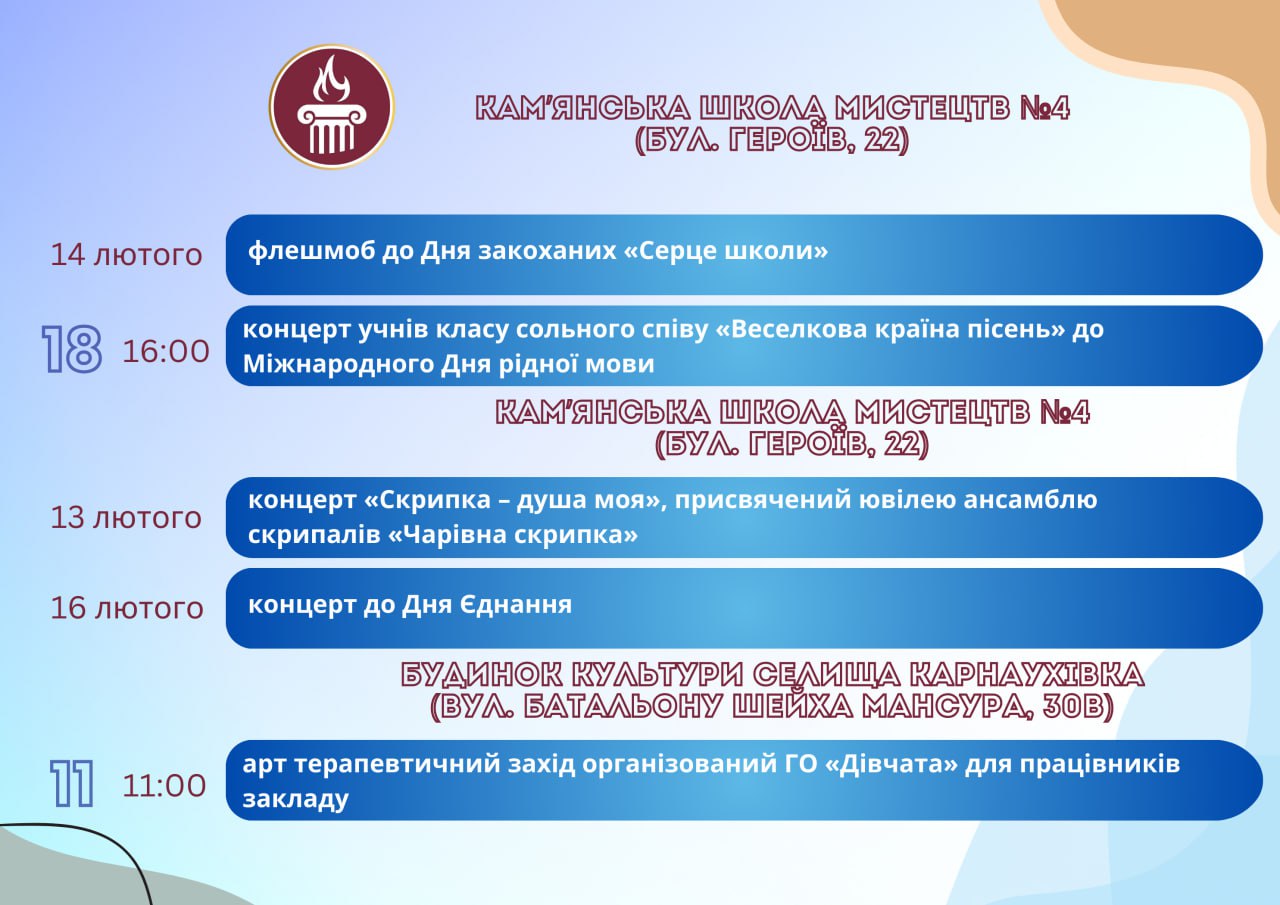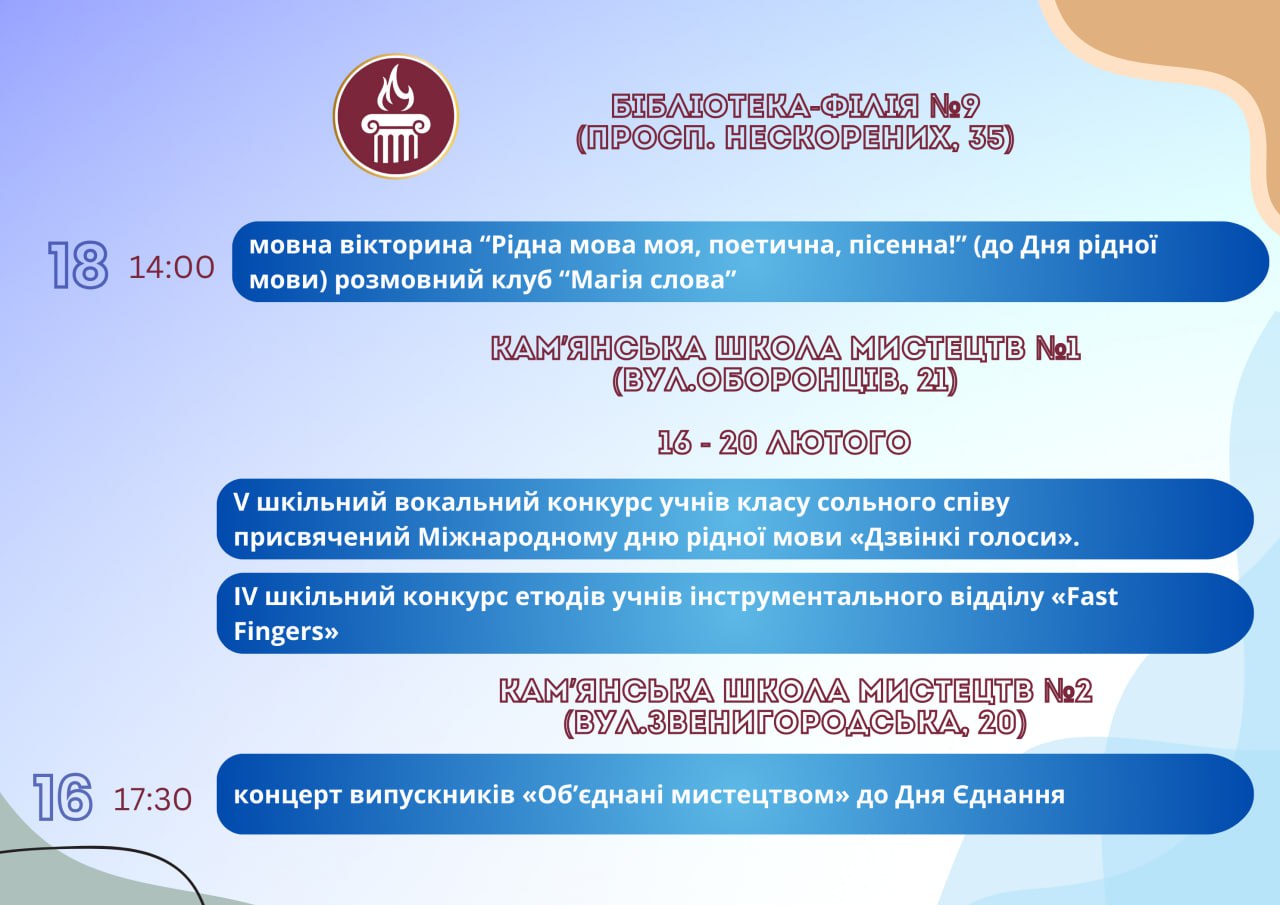 Головна Афіша ПРОГРАМА заходів у закладах культури міста Кам’янське 18 Лютого, 2026 00:00 Вікові обмеження 0+ з 11 по 18 лютого