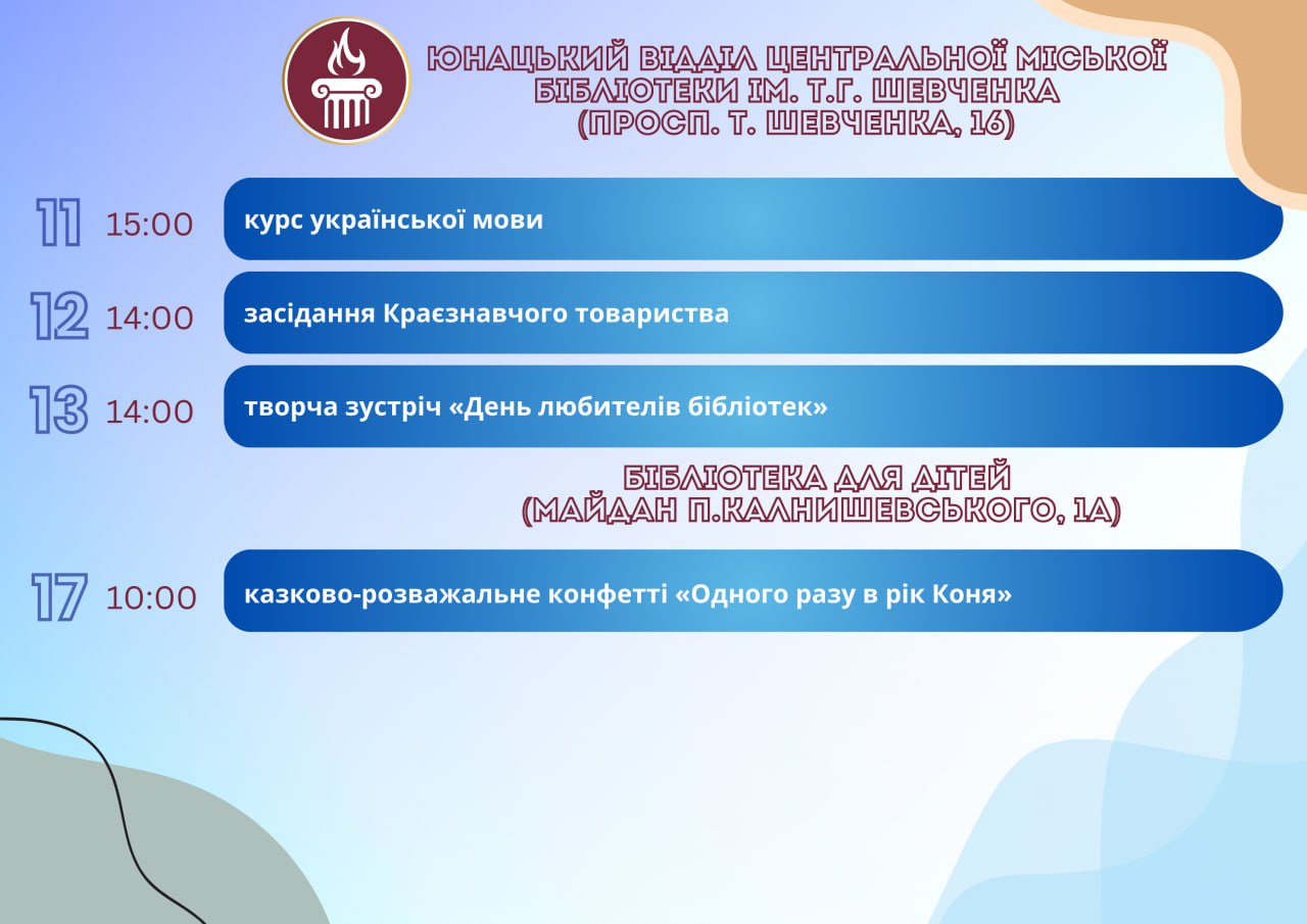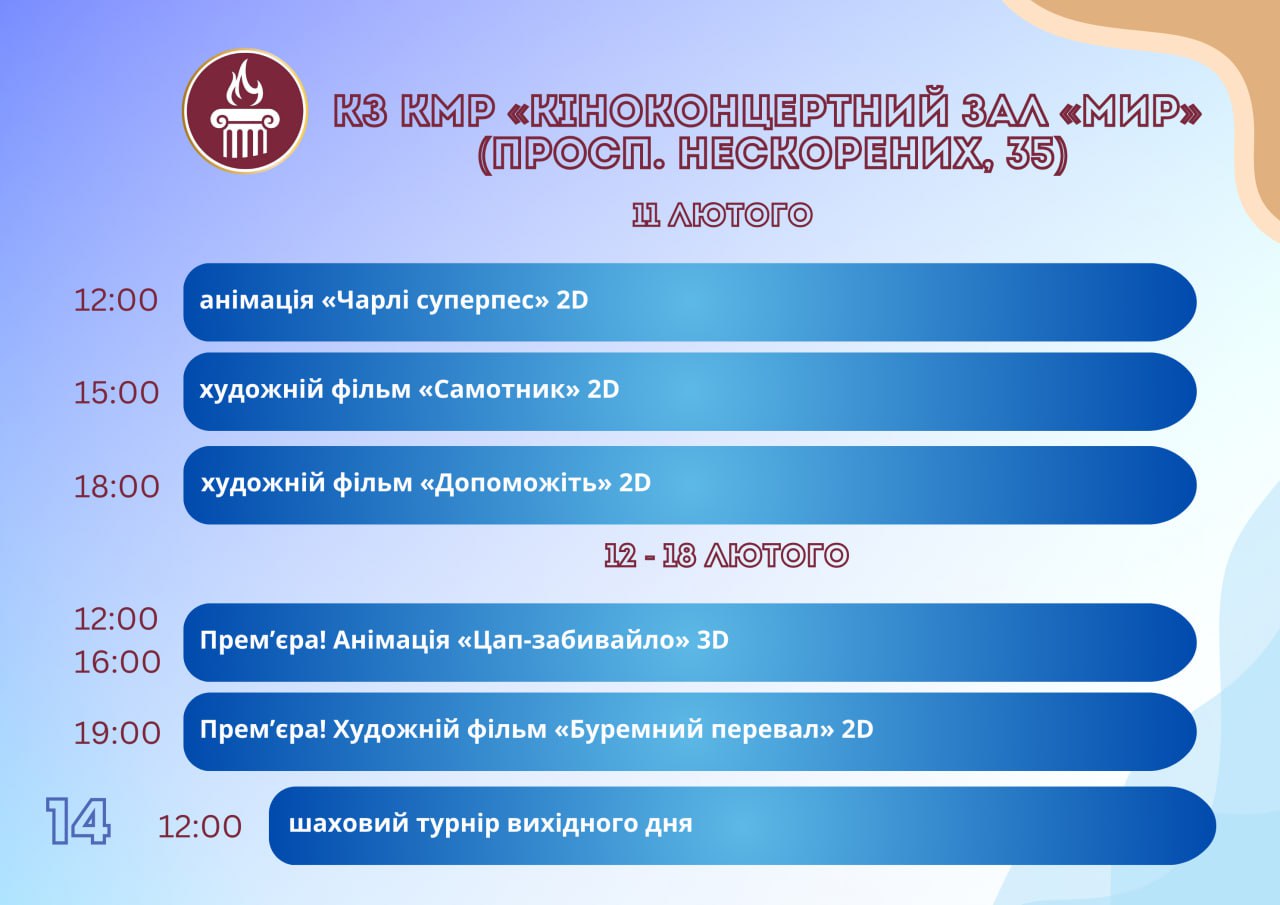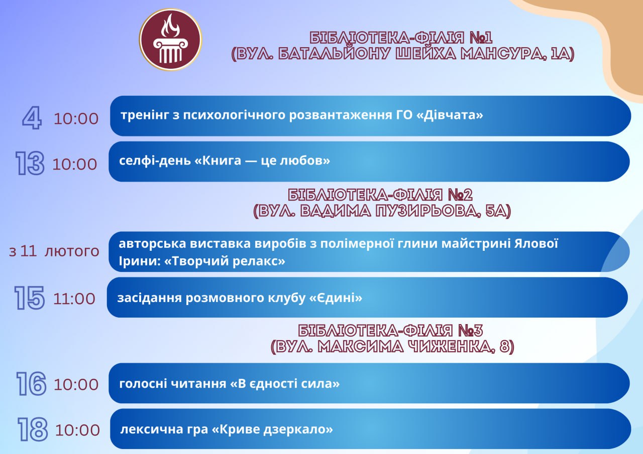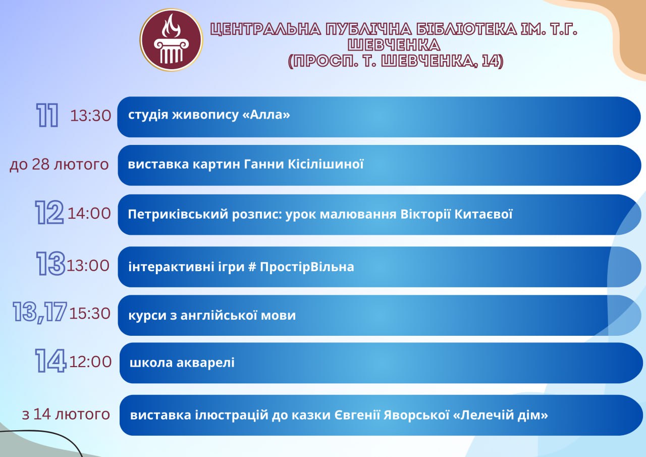 Головна Афіша ПРОГРАМА заходів у закладах культури міста Кам’янське 18 Лютого, 2026 00:00 Вікові обмеження 0+ з 11 по 18 лютого