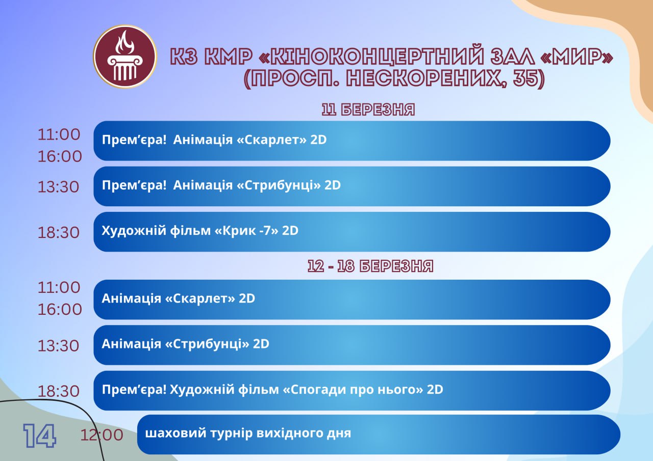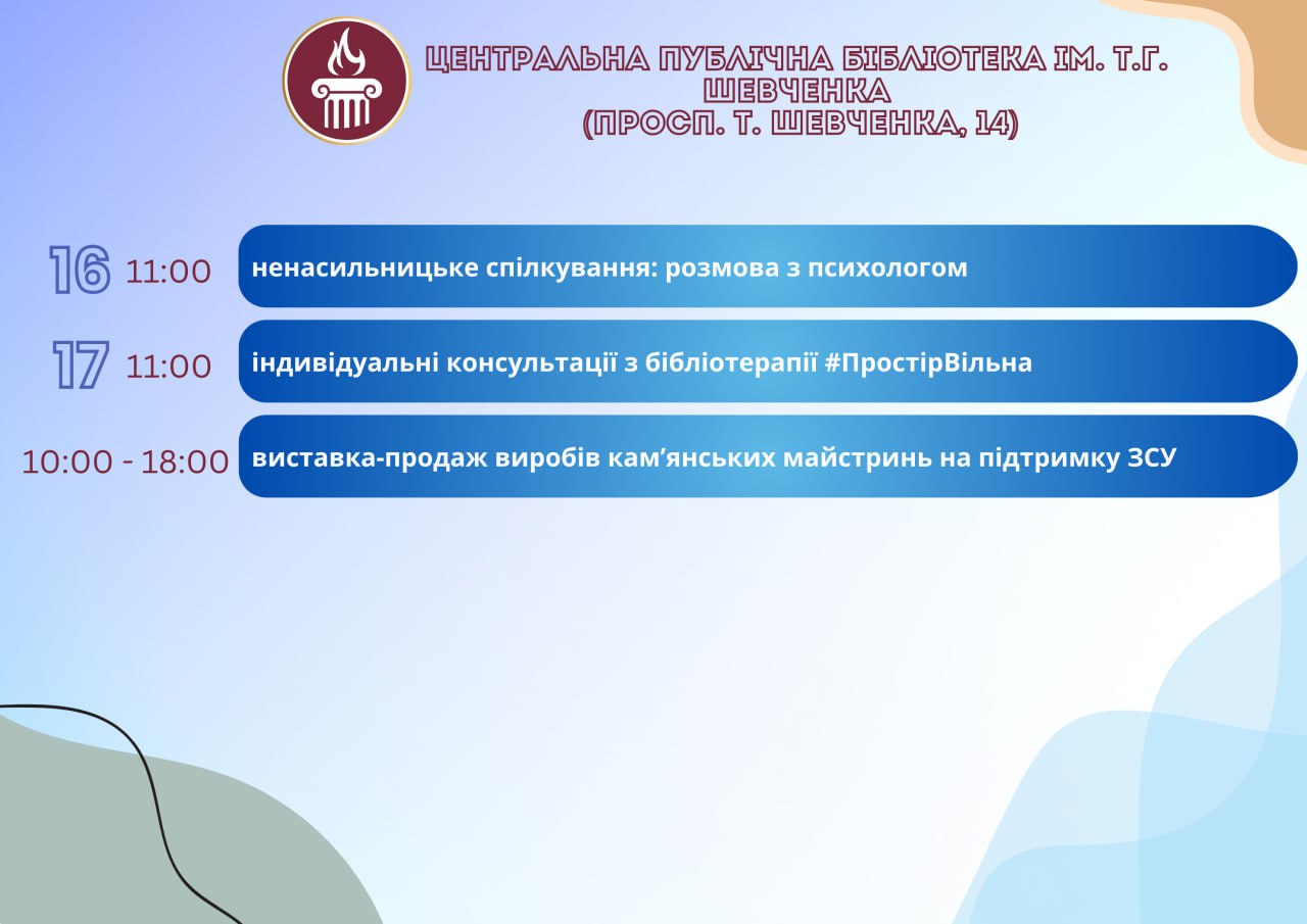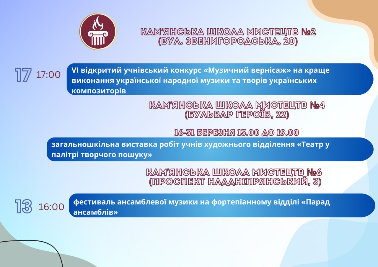 Головна Афіша ПРОГРАМА заходів у закладах культури міста Кам’янське 18 Березня, 2026 00:00 Вікові обмеження 0+ З 11 по 18 березня.