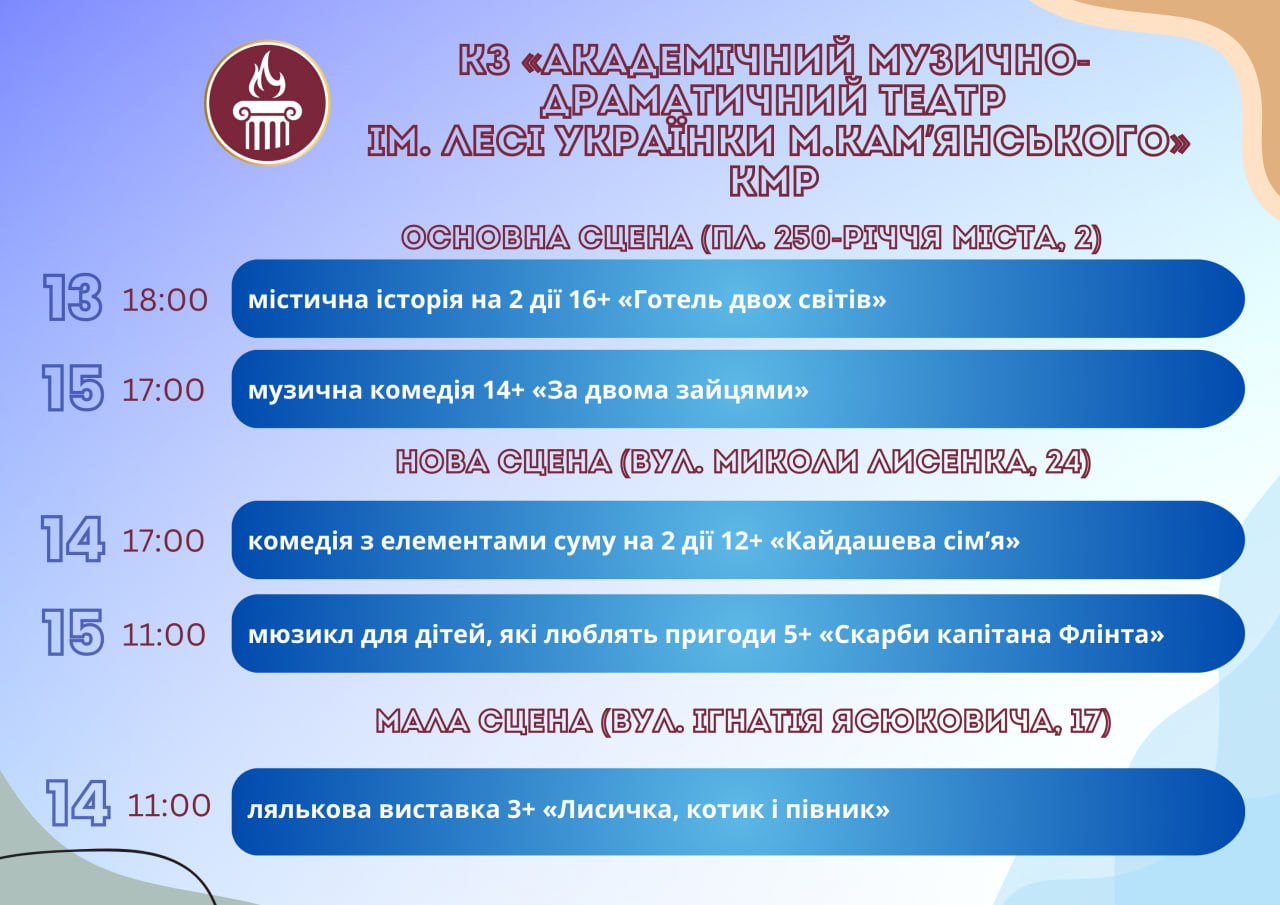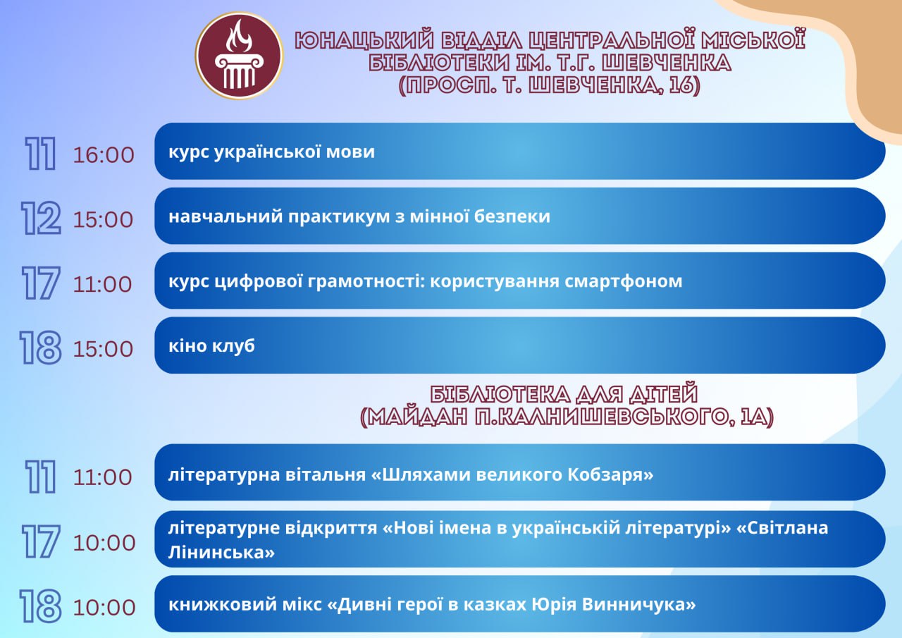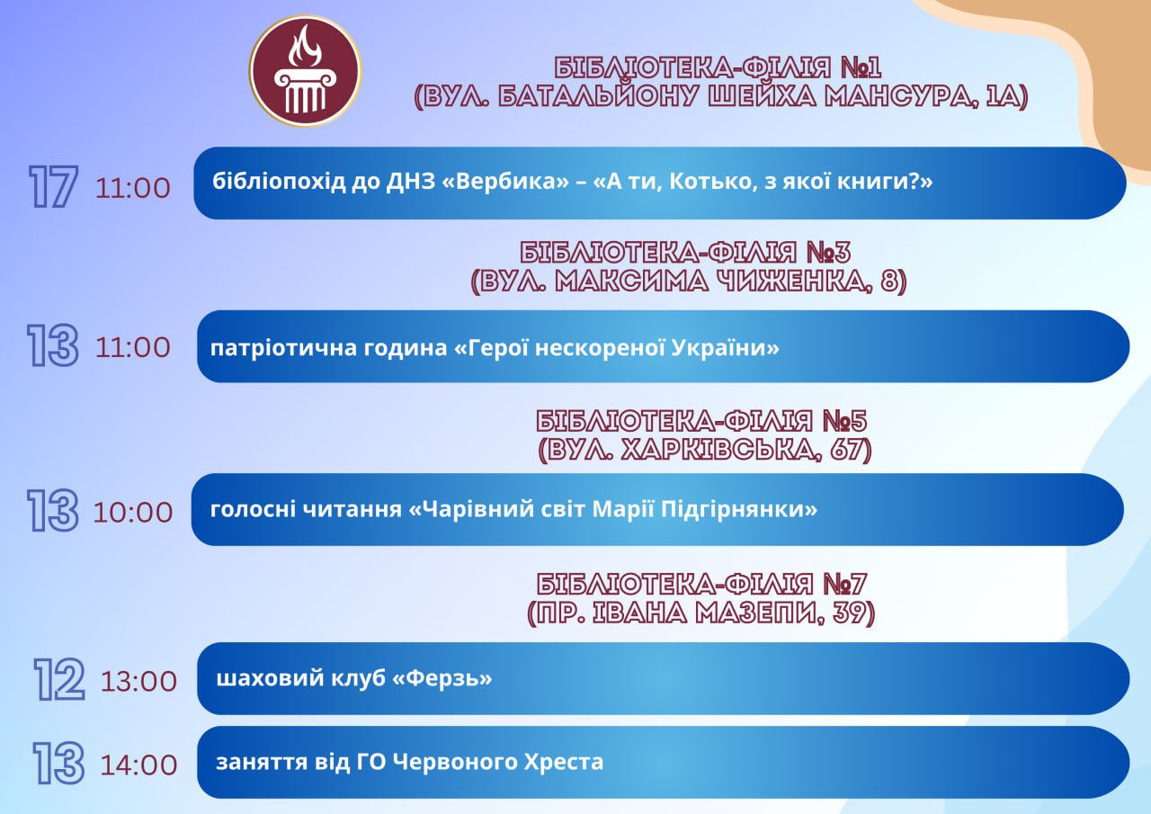 Головна Афіша ПРОГРАМА заходів у закладах культури міста Кам’янське 18 Березня, 2026 00:00 Вікові обмеження 0+ З 11 по 18 березня.