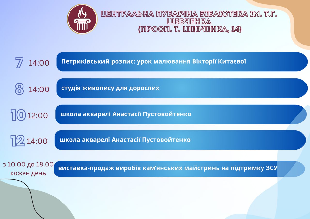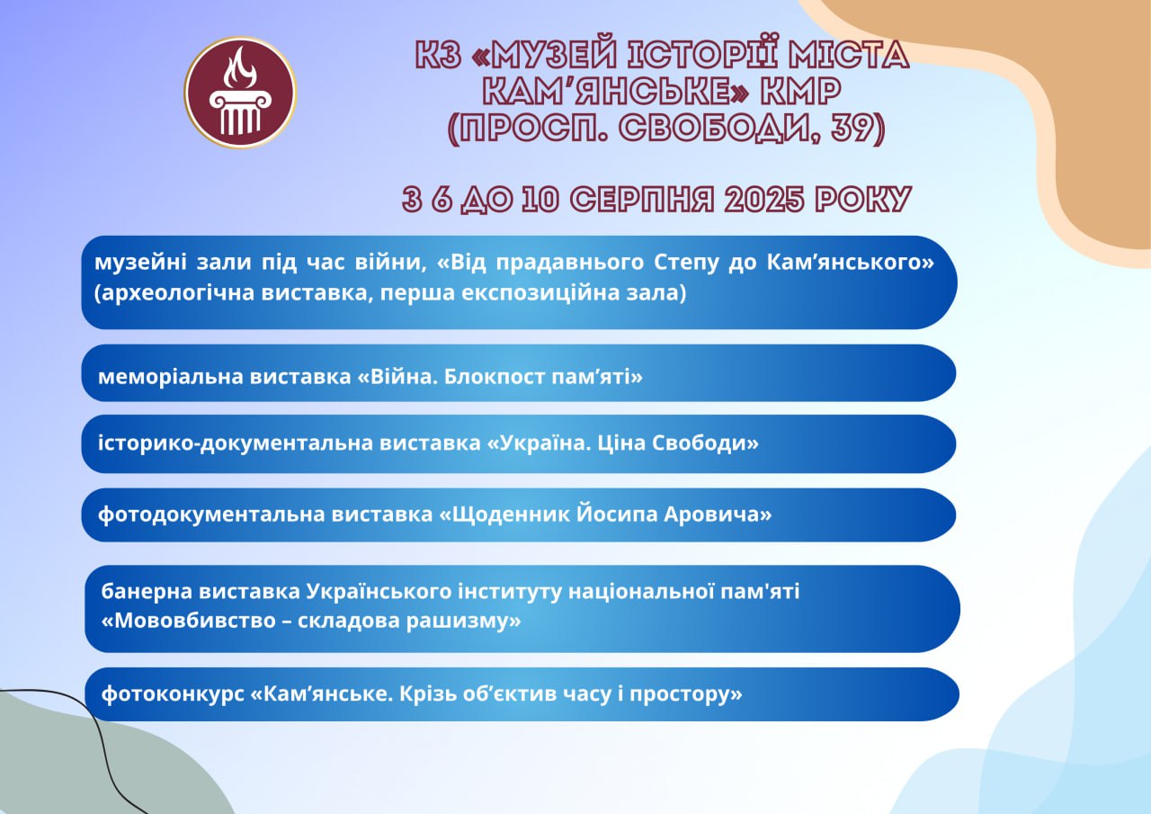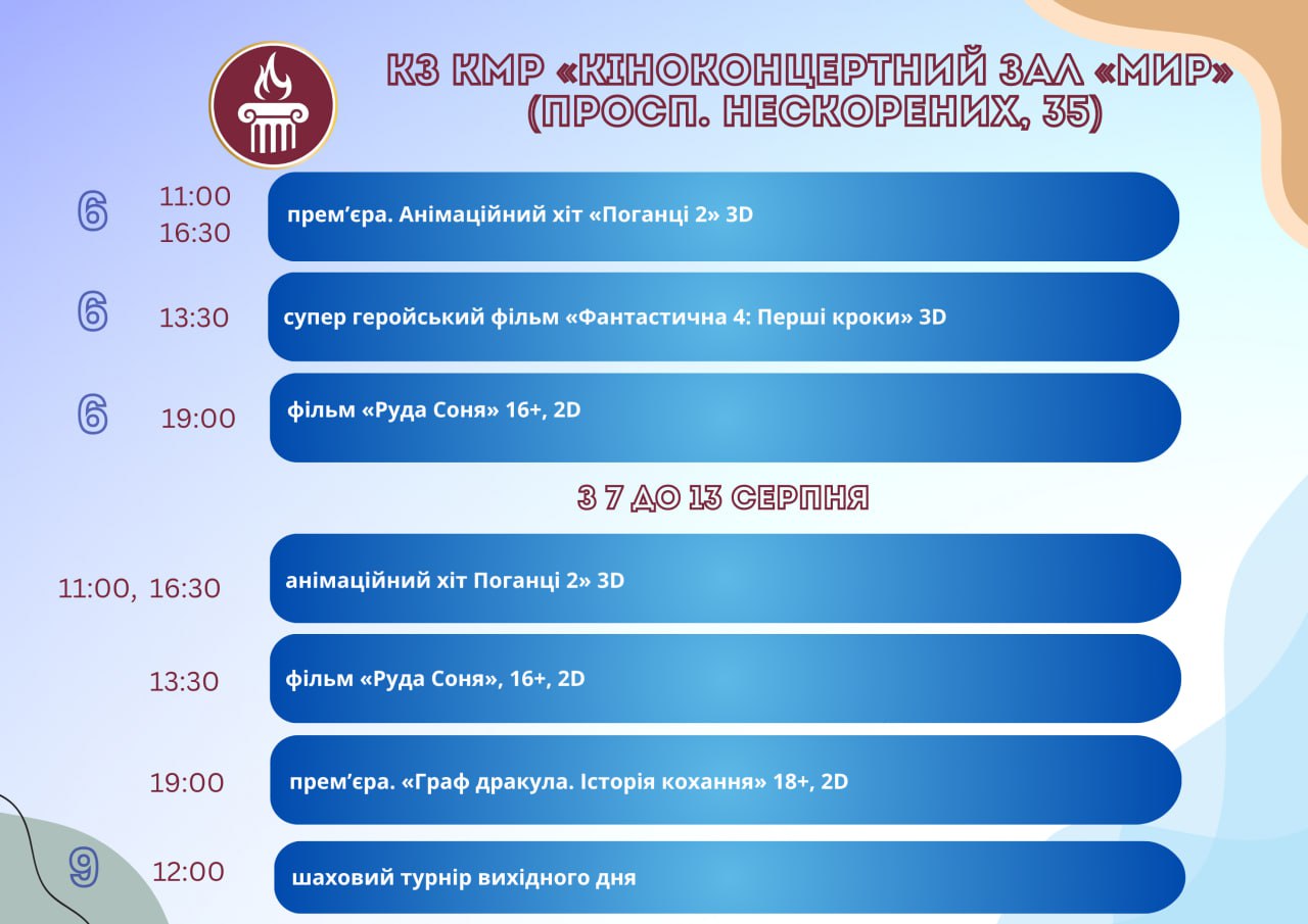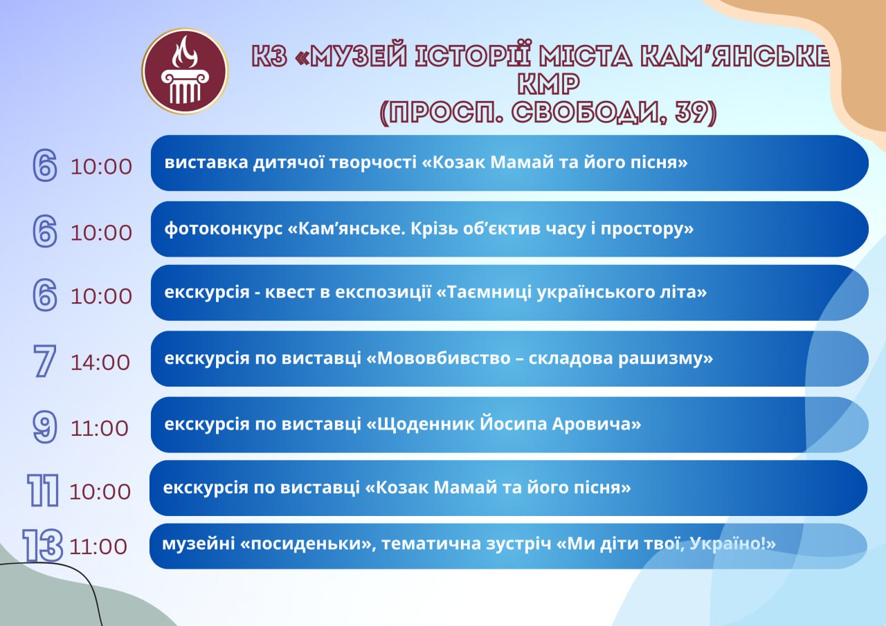 Головна Афіша Програма заходів у закладах культури міста Кам’янське 13 Серпня, 2025 23:00 Вікові обмеження 0+ З 6 по 13 серпня.