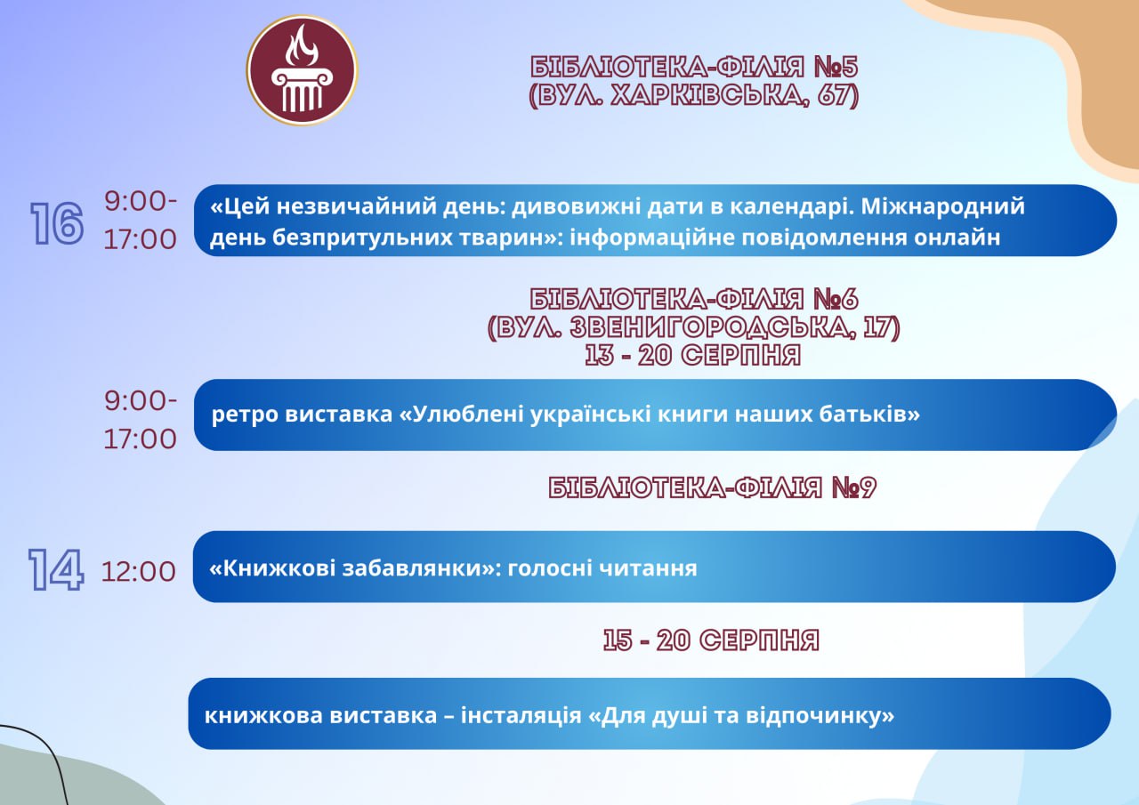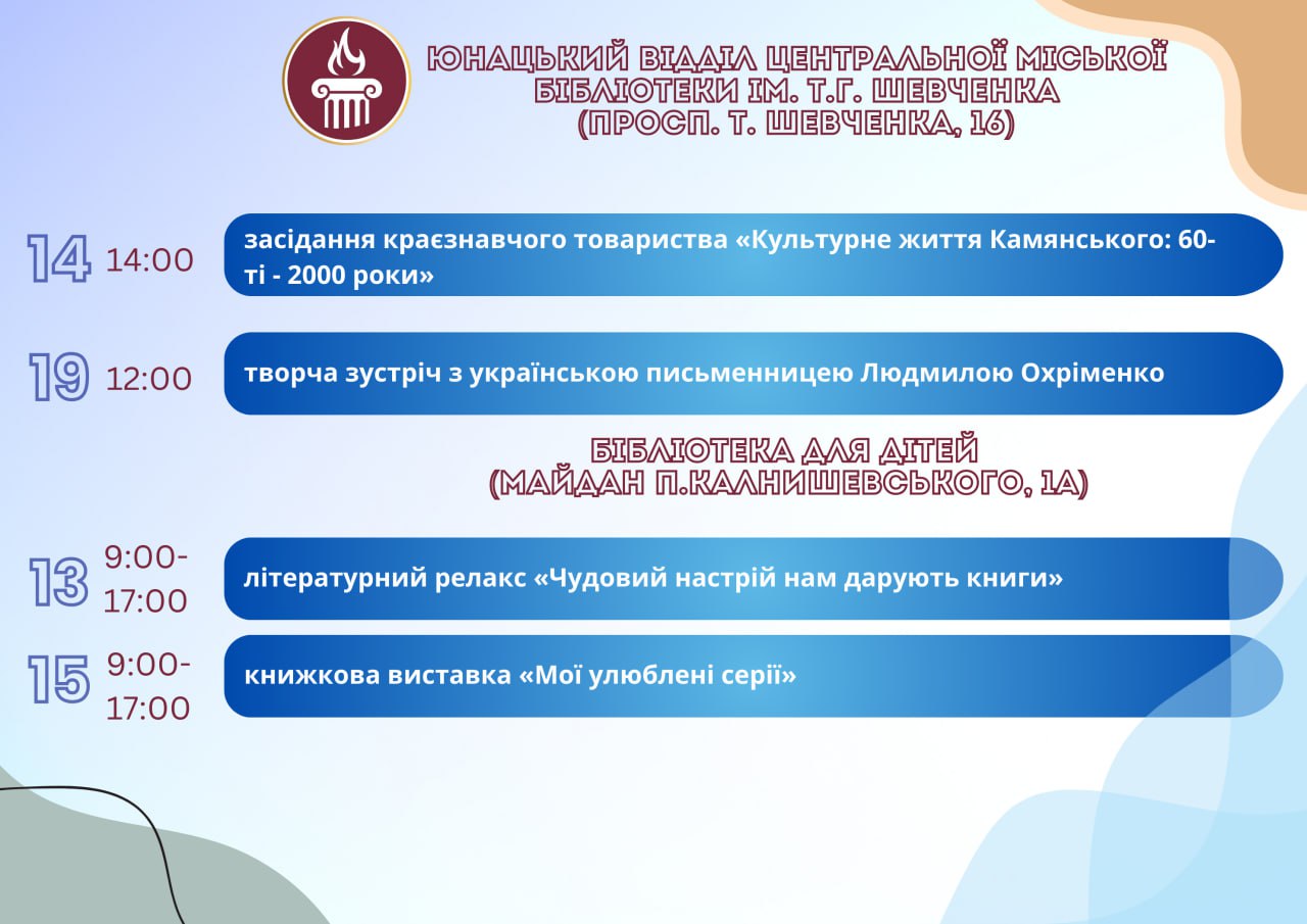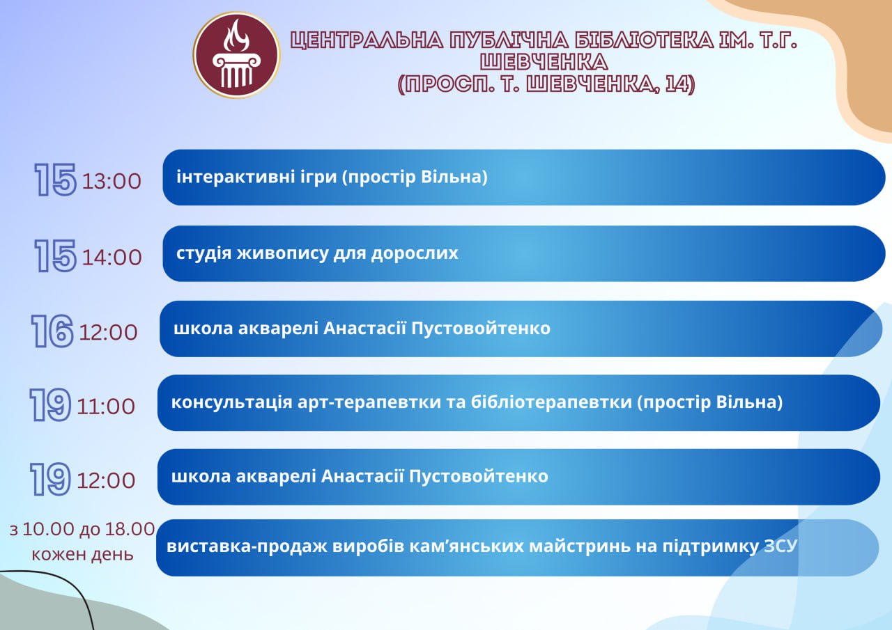 Головна Афіша Програма заходів у закладах культури міста Кам’янське 20 Серпня, 2025 23:00 Вікові обмеження 0+ З 13 по 20 серпня