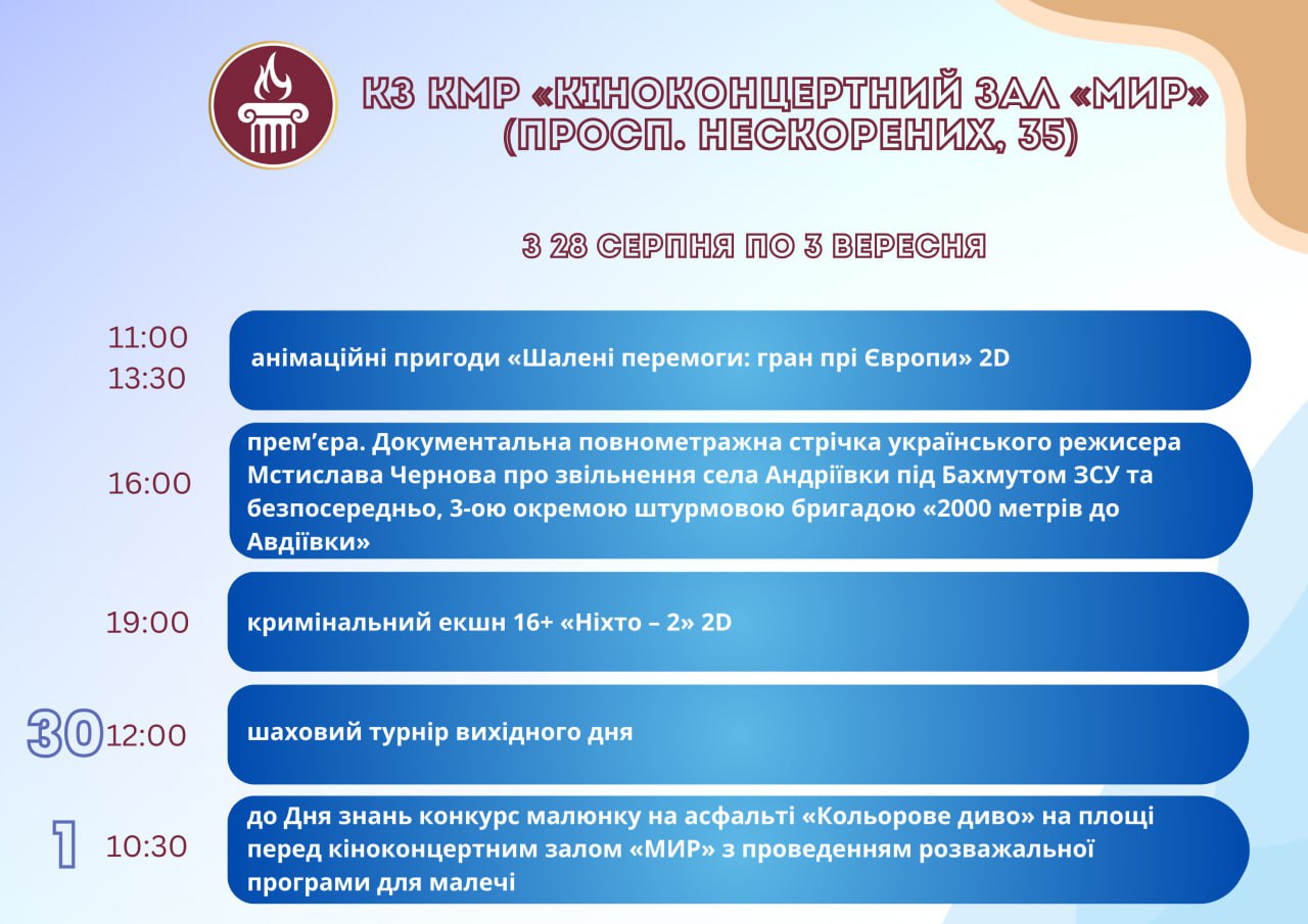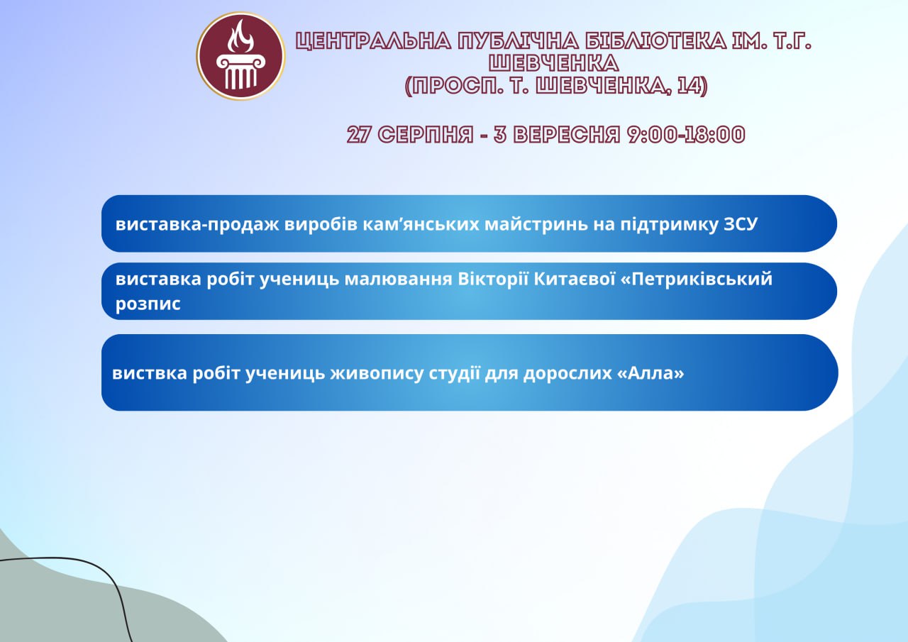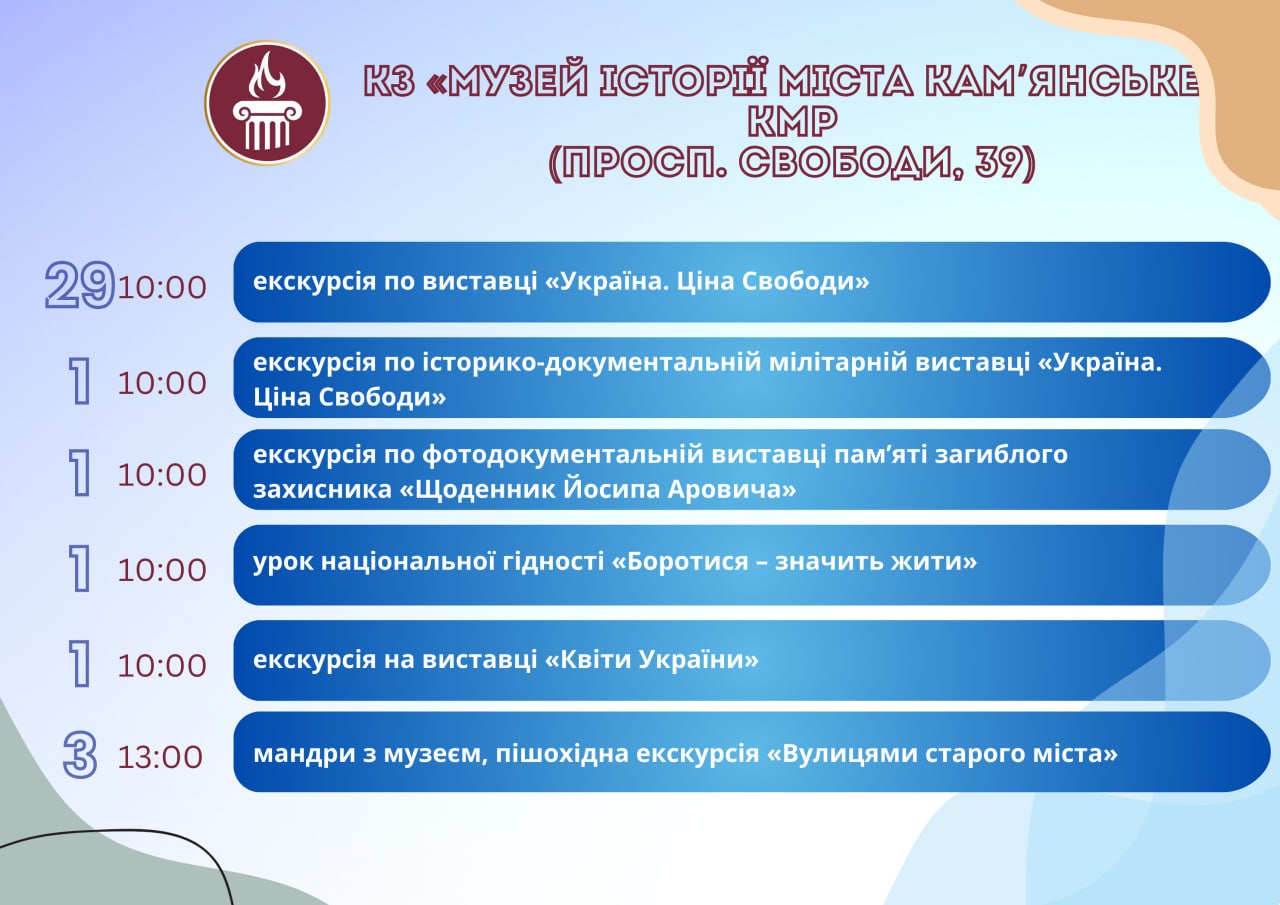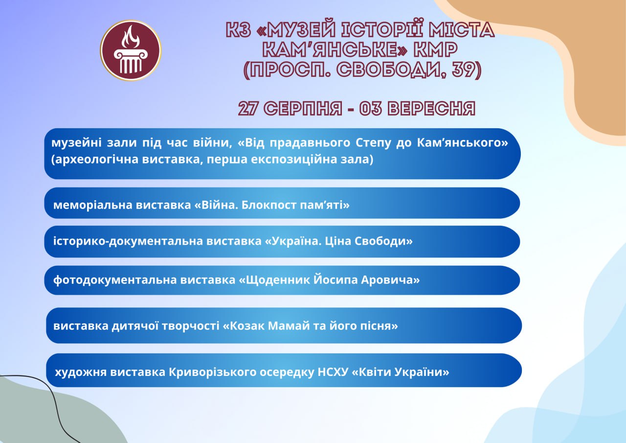 Головна Афіша Програма заходів у закладах культури міста Кам’янське 3 Вересня, 2025 23:50 Вікові обмеження 0+ з 27 серпня по 3 вересня