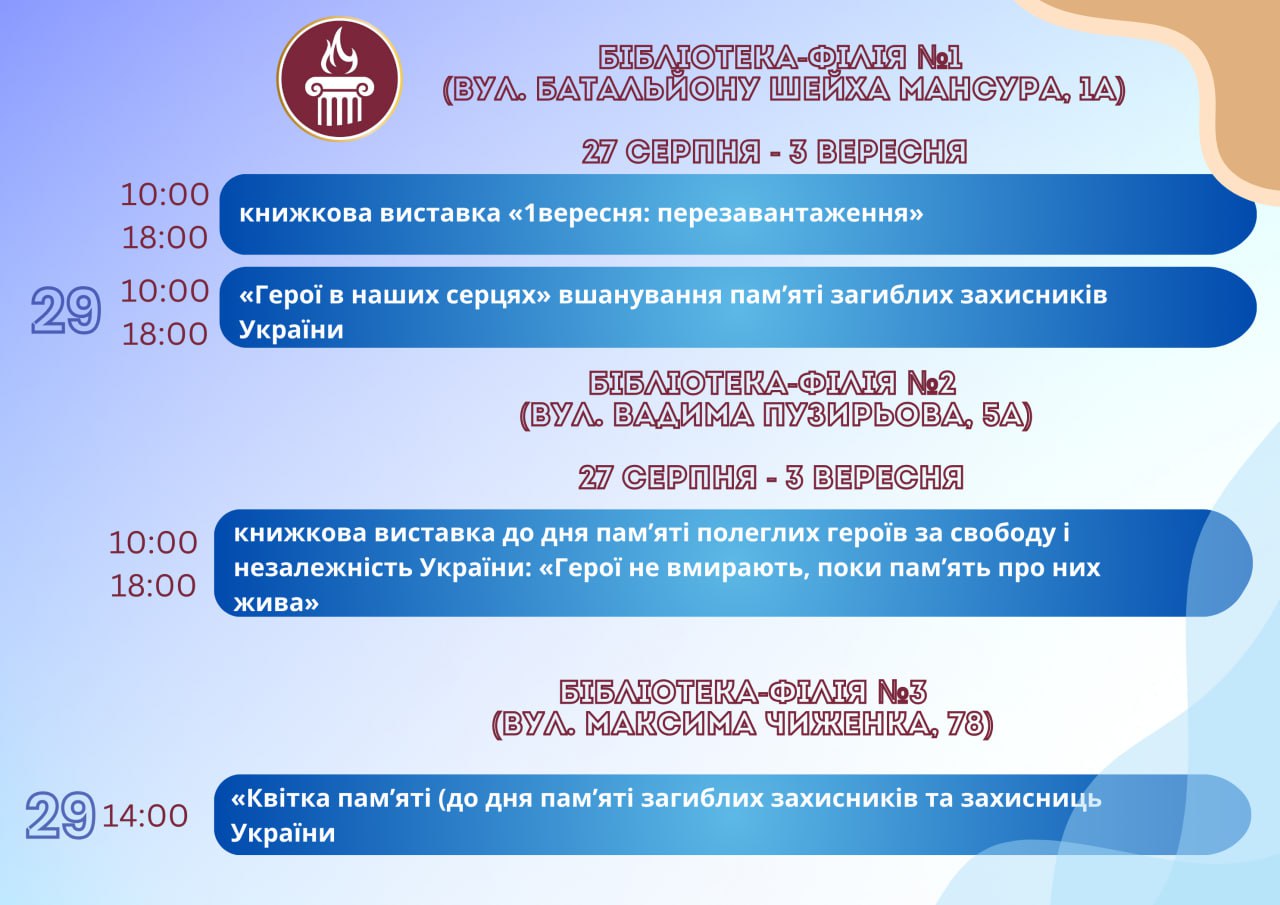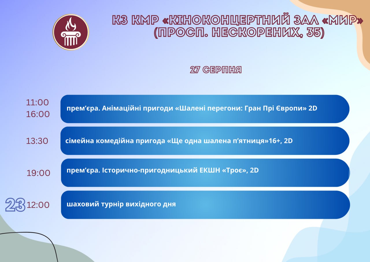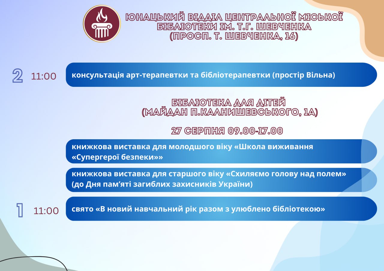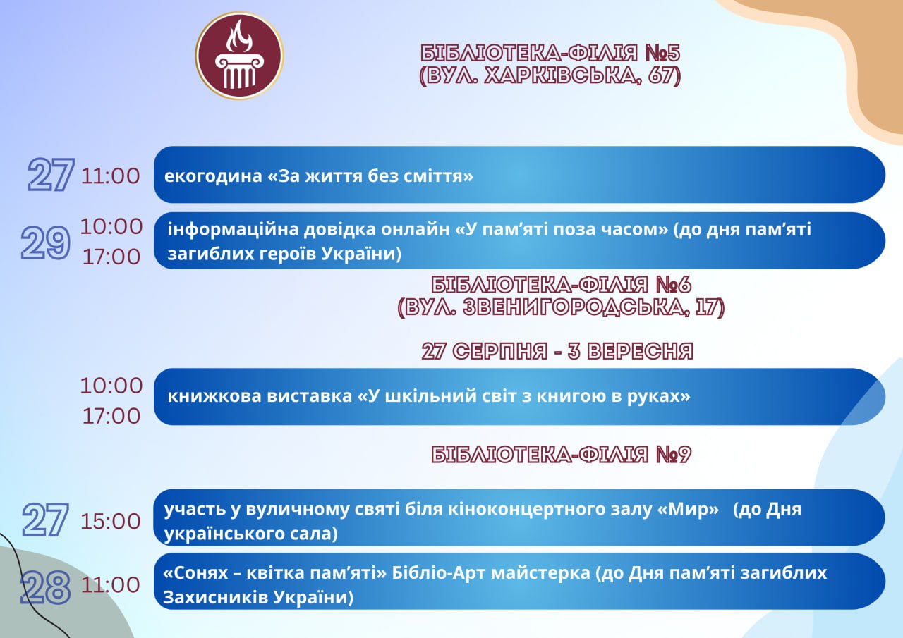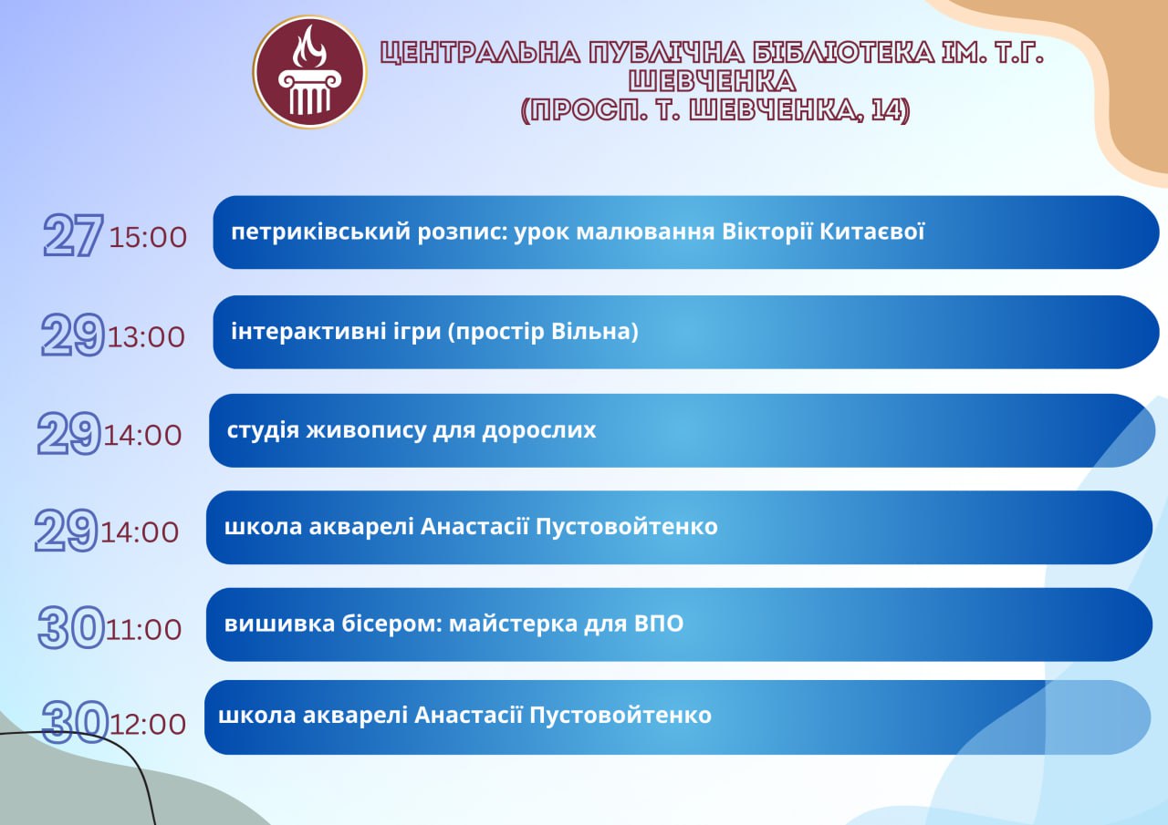 Головна Афіша Програма заходів у закладах культури міста Кам’янське 3 Вересня, 2025 23:50 Вікові обмеження 0+ з 27 серпня по 3 вересня